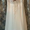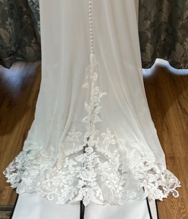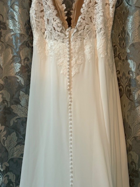 Brand new never been worn! This Lillian West by Justin Alexander, is a beautiful, flattering, chiffon A-line bridal dress featuring a plunging illusion Sabrina neckline, sequined lace appliqués along the neckline up to the straps. A Chantilly lace underlay in the sheer bodice offers a touch of extra detailing. Appliqués cascade down onto the floaty chiffon skirt and continue around to create a stunning cutout chapel length train. The V-back is accented with covered buttons cascading down to the start of the train.