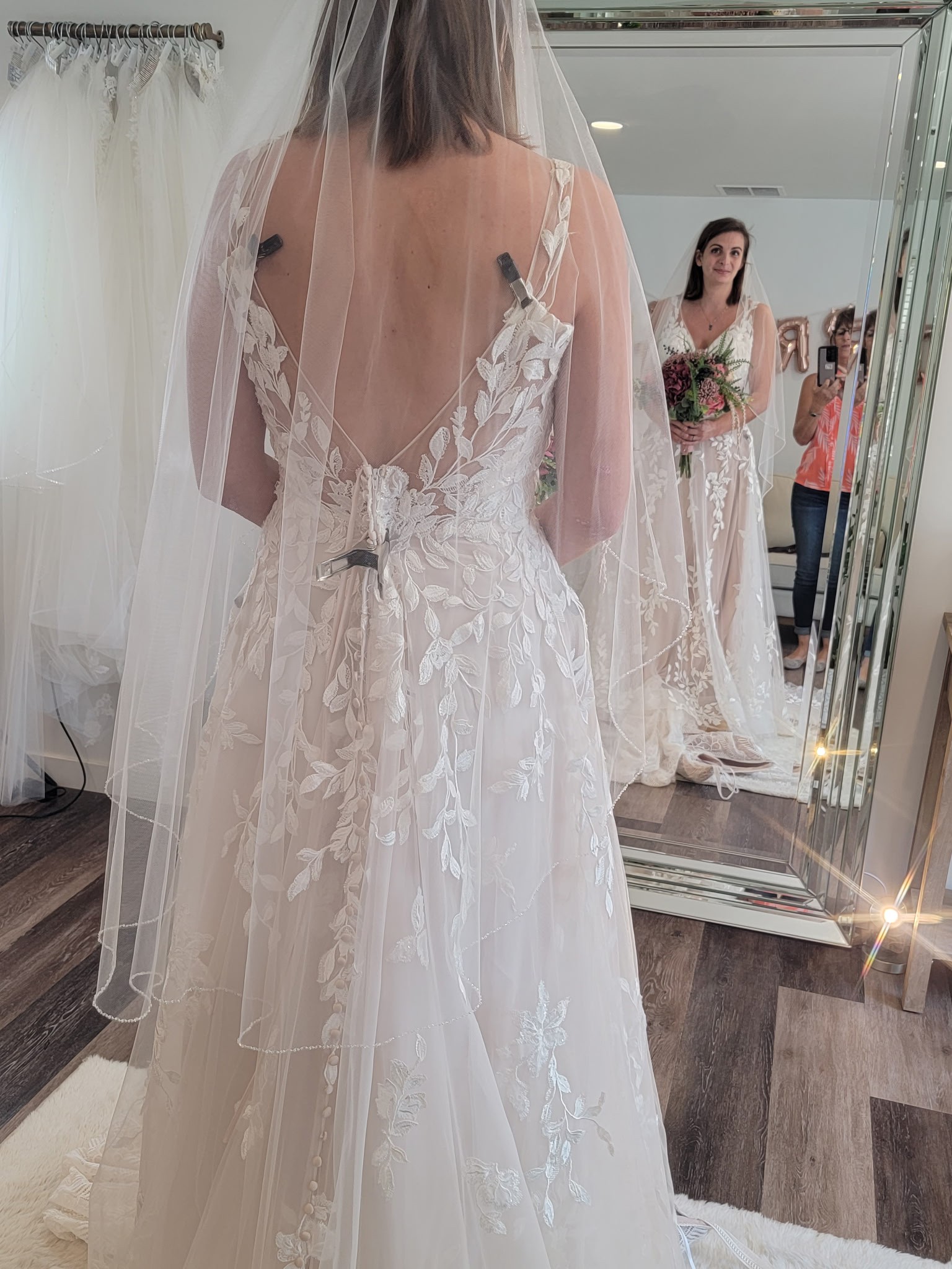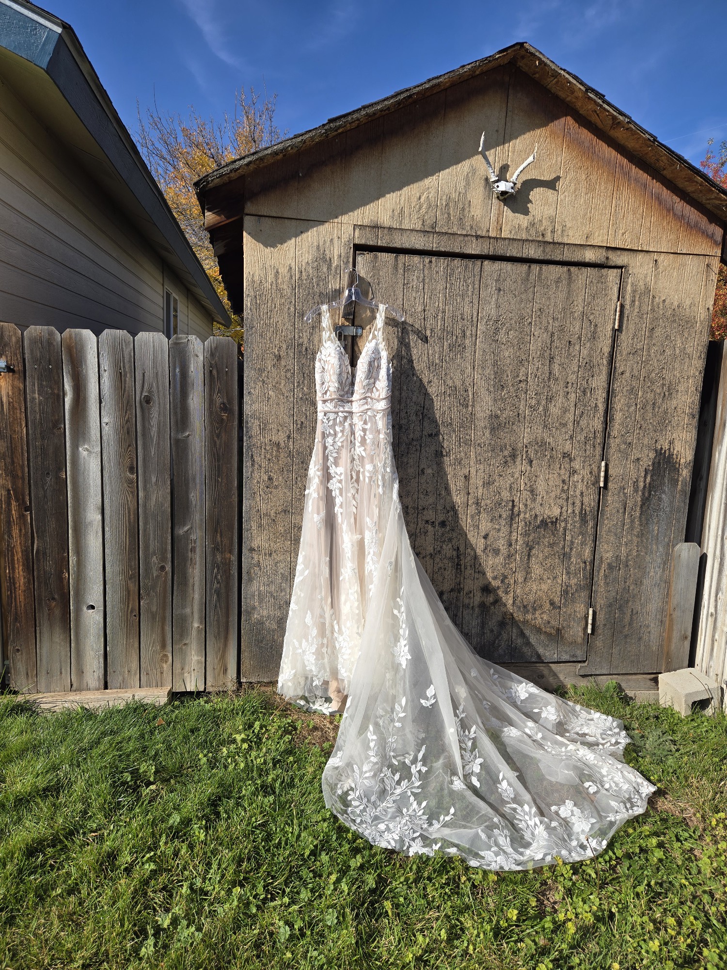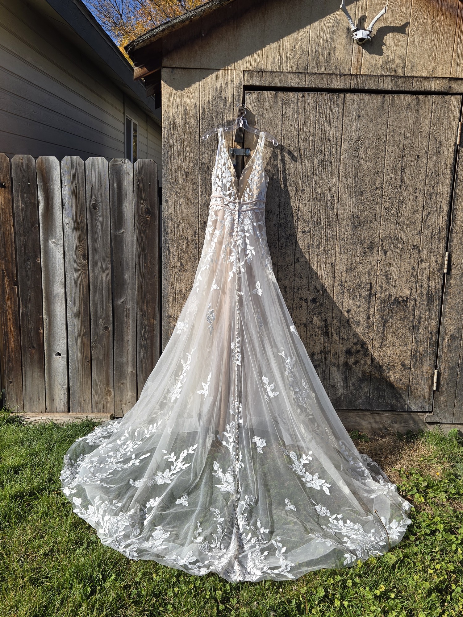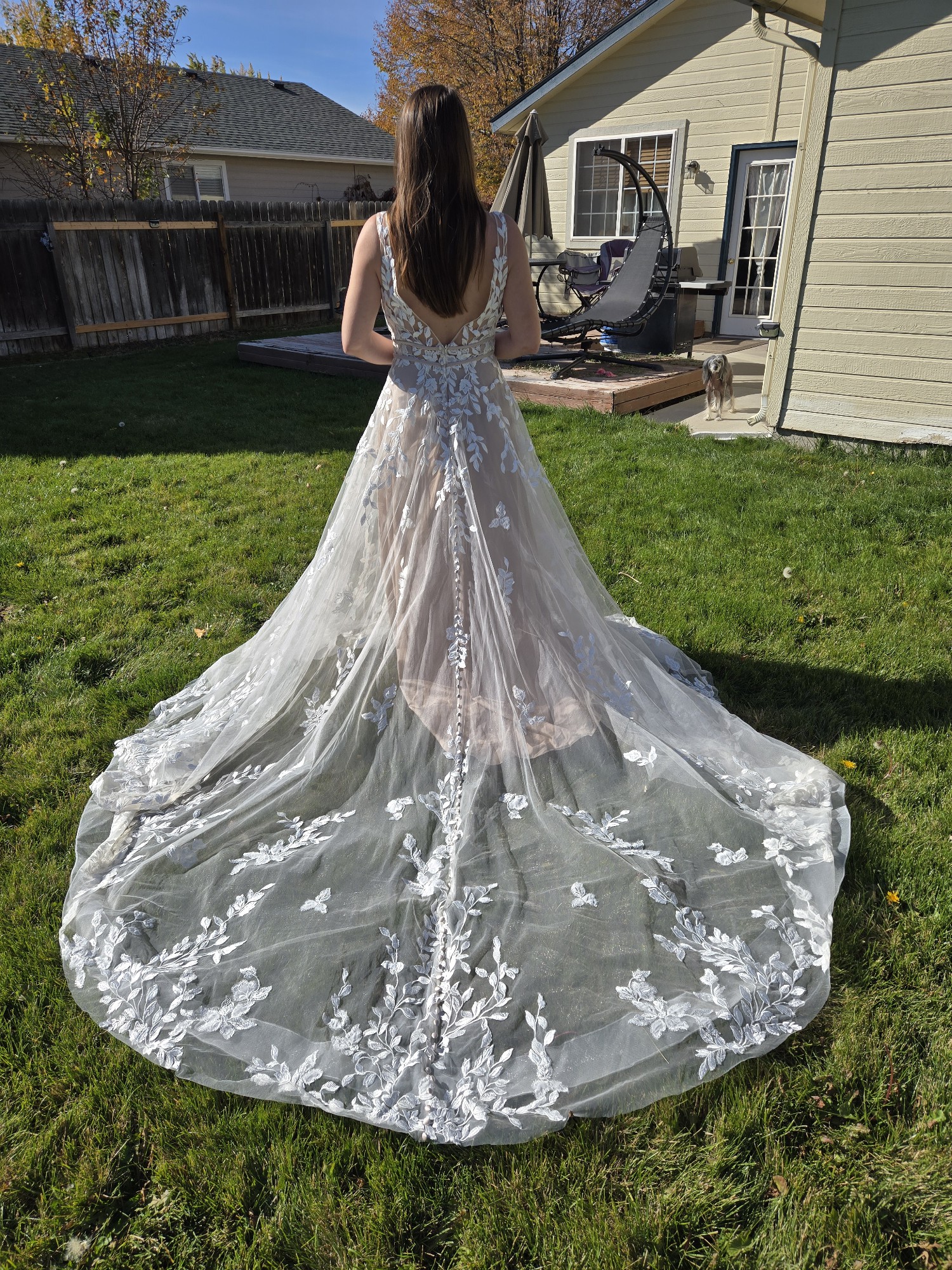 The striking V-back adds an unexpected twist, ensuring that elegance is captured from every angle. The intricate embroidery embellishments lend a touch of artistry, creating a breathtaking visual appeal that is both timeless and contemporary. The unique color choice is a standout feature, helping highlight the intricate details.