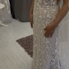 Sylvie embodies timeless elegance with a touch of ethereal glamour. Her glittering embroidered lace, adorned with delicate sequins and beads, shimmers softly with every movement. The fit-and-flare mermaid silhouette embraces and flatters the figure, flowing into a dramatic, sweeping train that leaves a lasting impression.