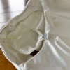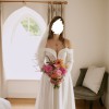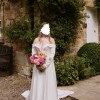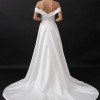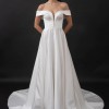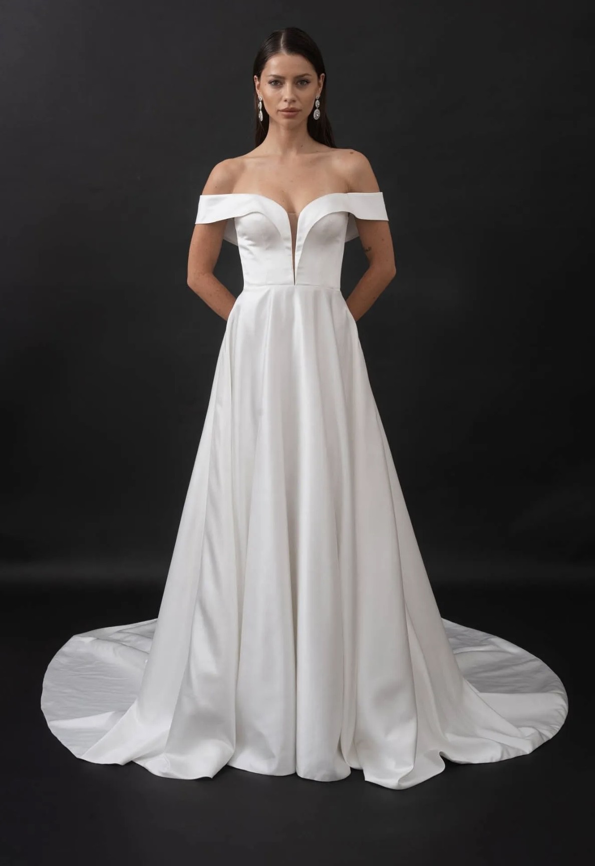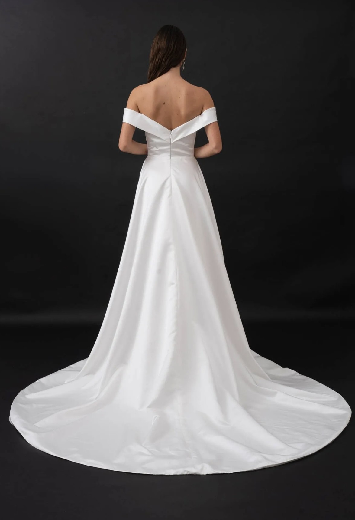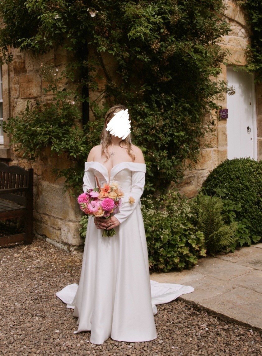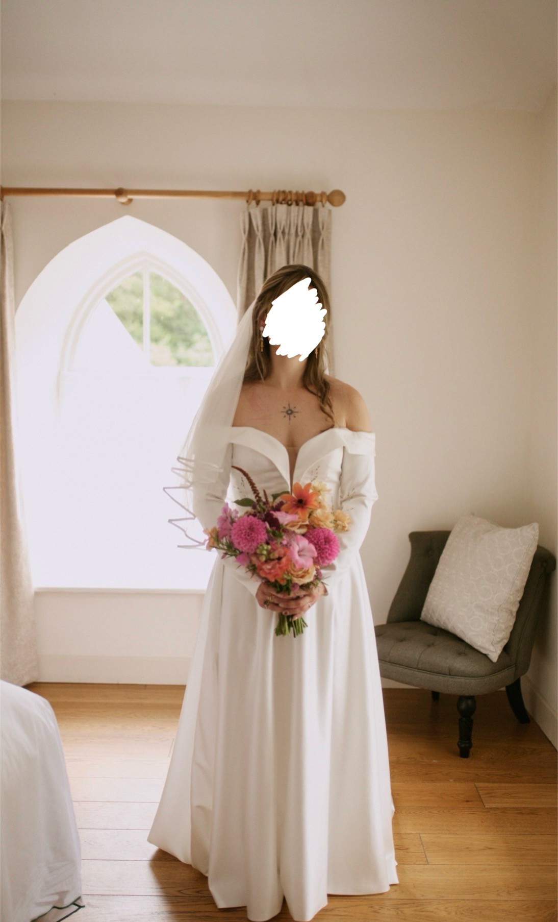 Lightweight satin with a medium sheen and a strapless off the shoulder cuff bodice. Professionally dry-cleaned. Immaculate condition. I had sleeves custom-made which are fully detachable with buttons and loops which are entirely hidden by the cuffs. Please see photos. The buttons on the sleeves also appear down the back/centre of the dress, vertically. I have not had the bodice altered at all. For a size 12, I believe the body of this dress to be on the smaller side. More photos to come, please don’t hesitate to ask questions or request further photos. Will consider reasonable offers.