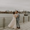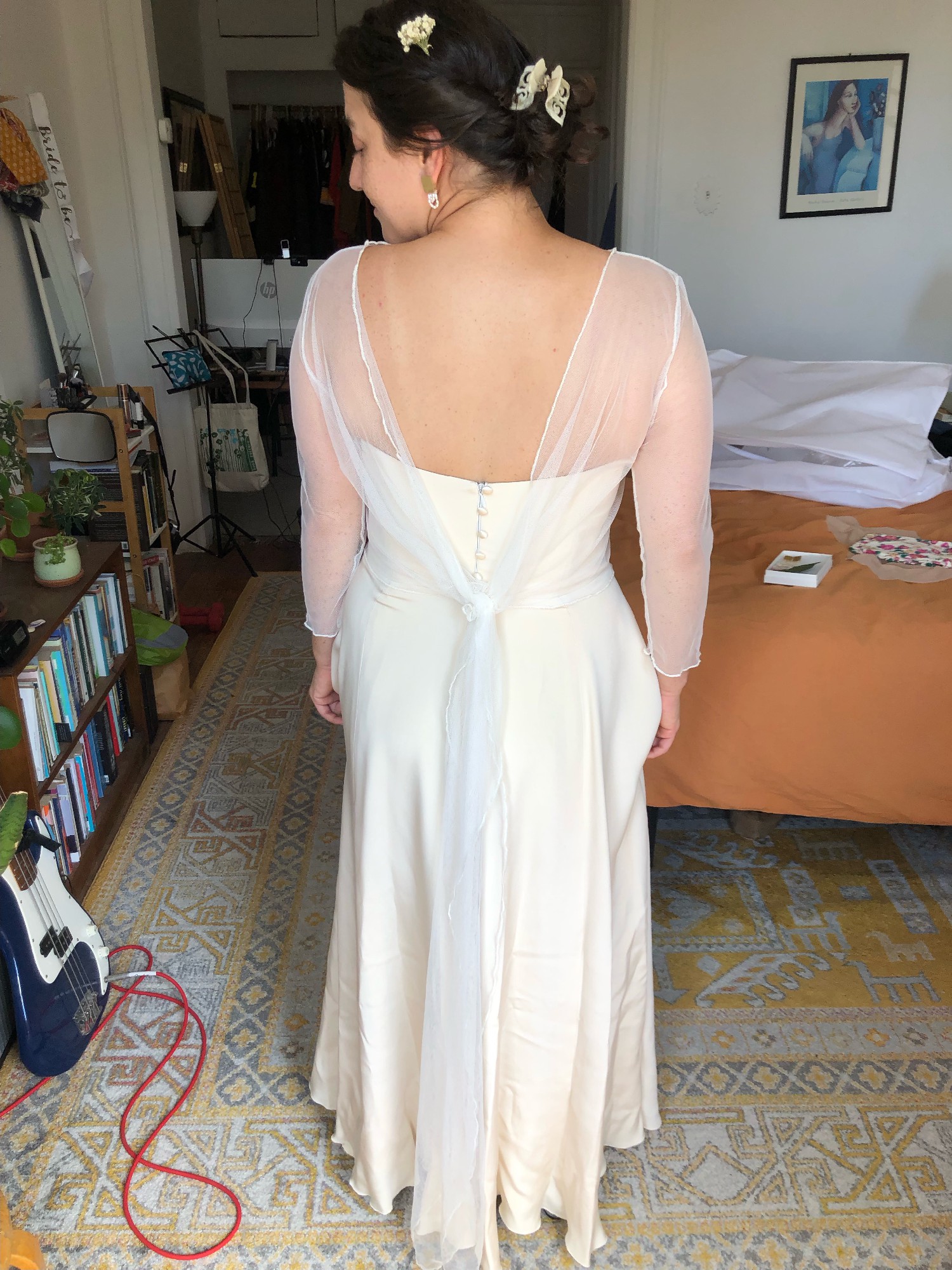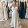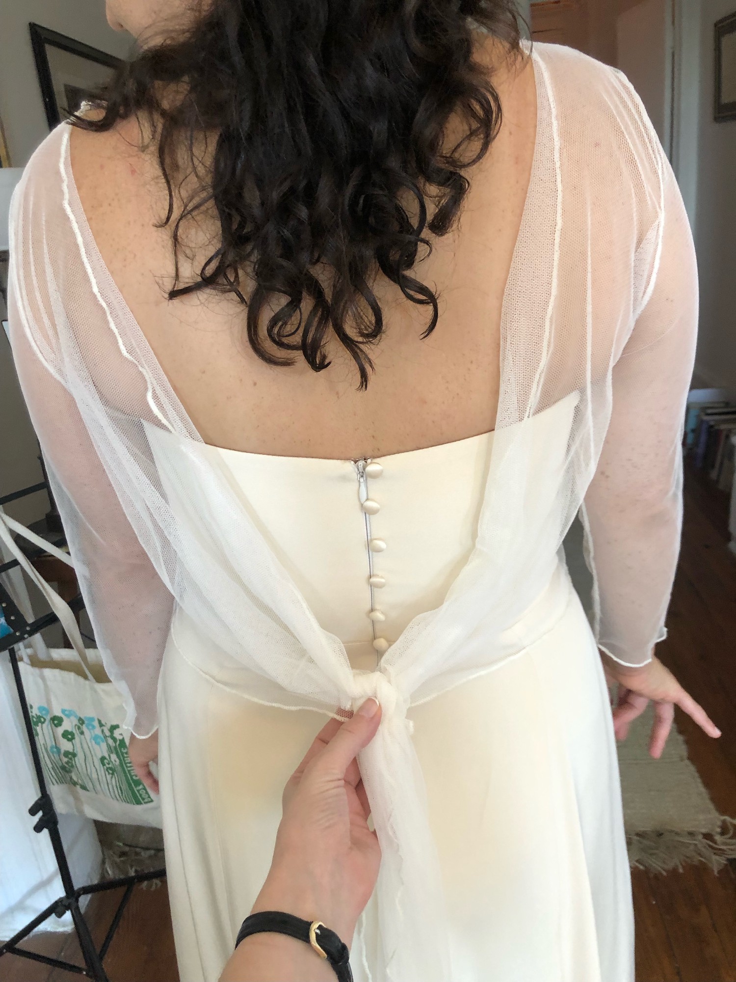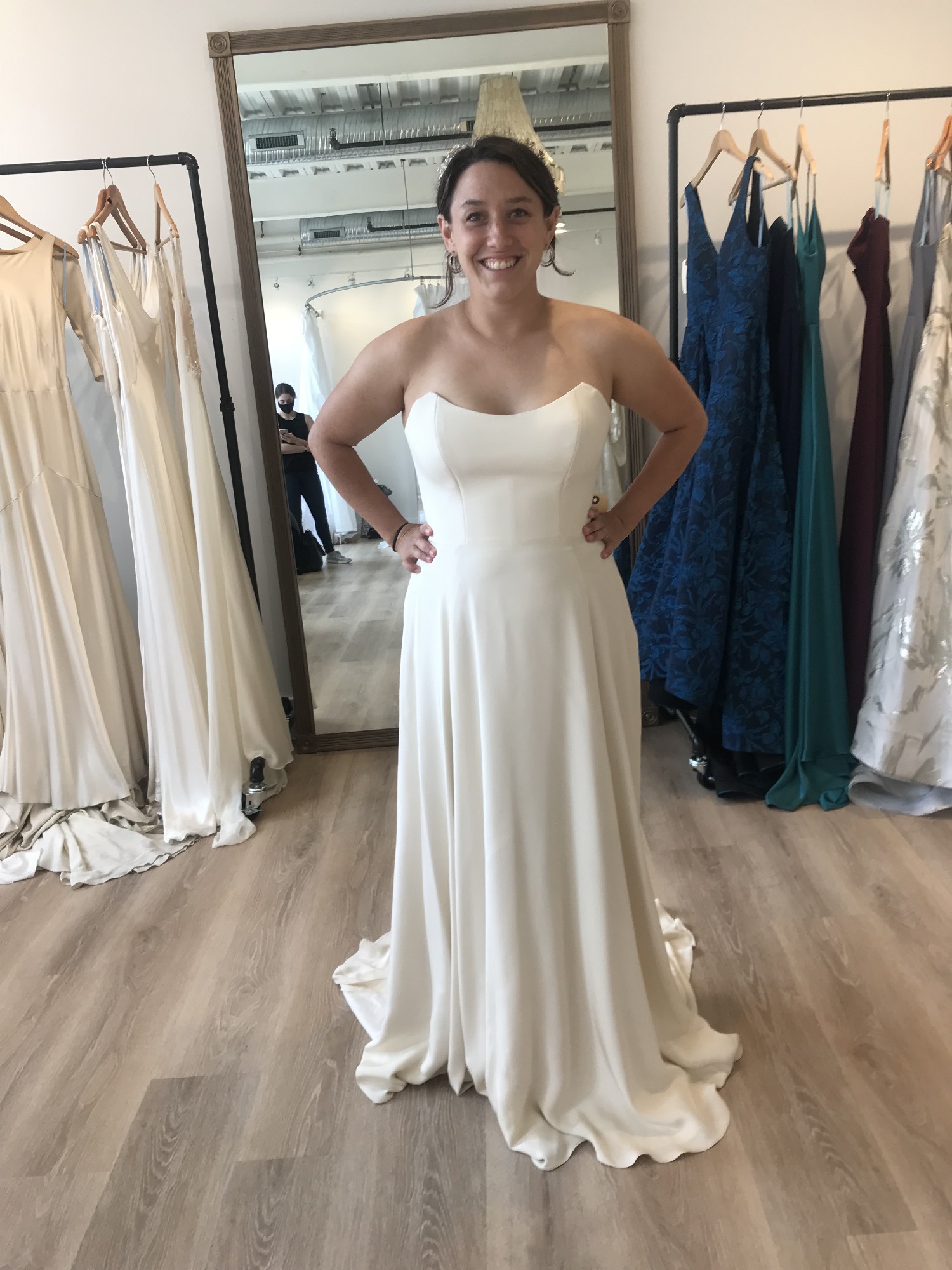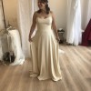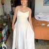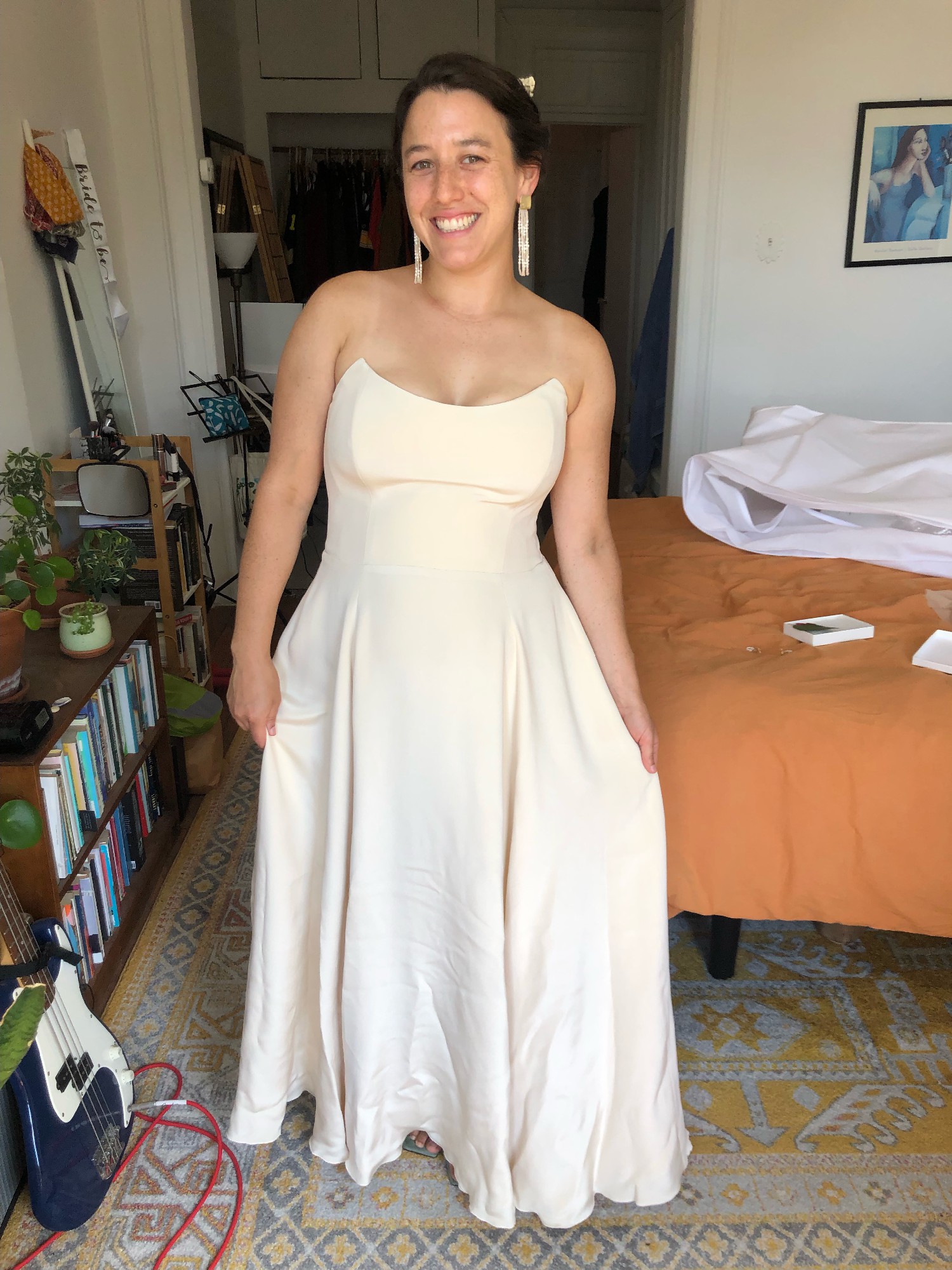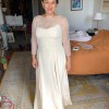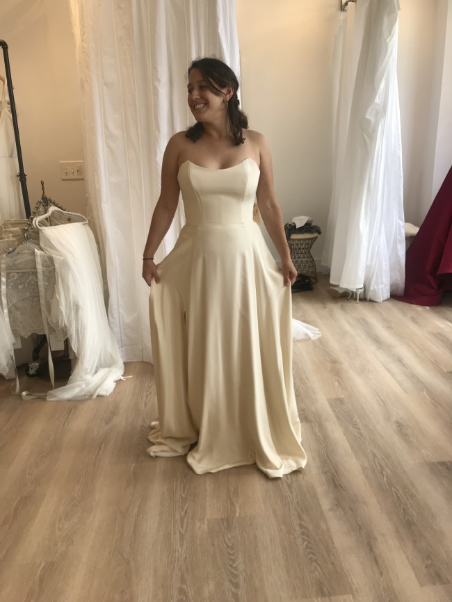 This customized Rebecca Schoneveld gown is a lightweight strapless, a-line, flowy dress in a warm, champagne color. I had the train removed and added a fun, but not-too-high slit in the skirt for extra ease for dancing the night away. I also added covered, decorative buttons in the back along the zipper. It has a flattering scooped neckline and a mid-low back.