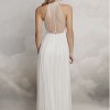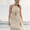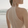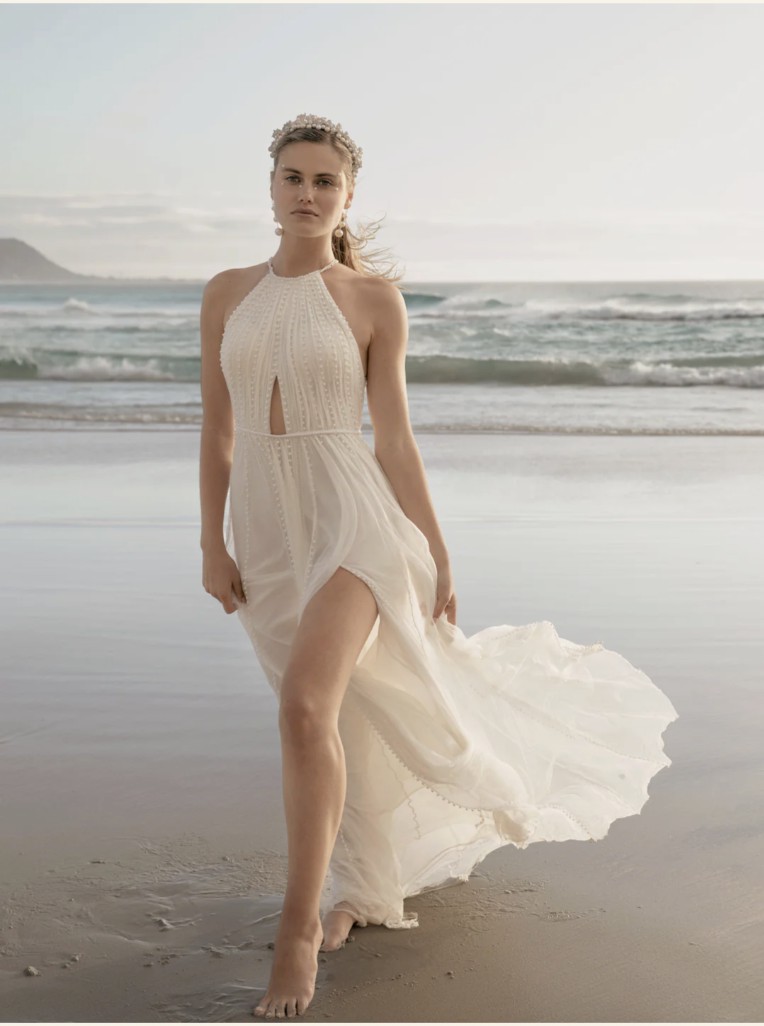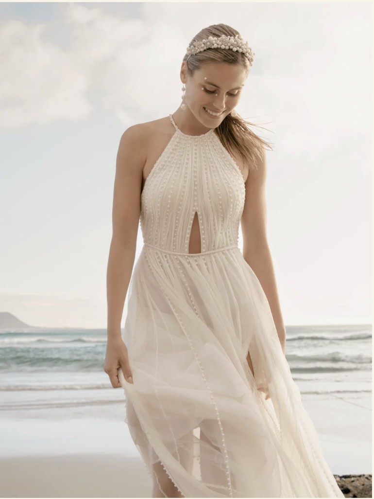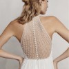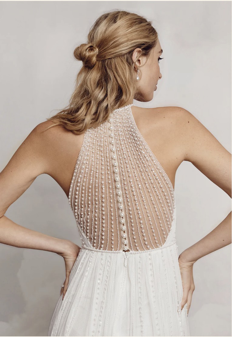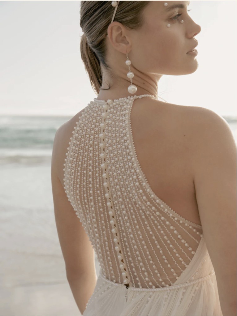 The beautiful Ramona wedding gown is the epitome of bohemian romance. Crafted from luxuriously soft silk tulle, this gown features an elegant halter neckline and silk back with sprays of pearl beading. The A-line skirt of this gown gently drapes over the hips and falls softly to the floor, with elegant rows of pearls adding a whimsical touch. For added support, the Ramona gown features built-in bust cups and is secured with a row of elegant silk buttons at the center back.