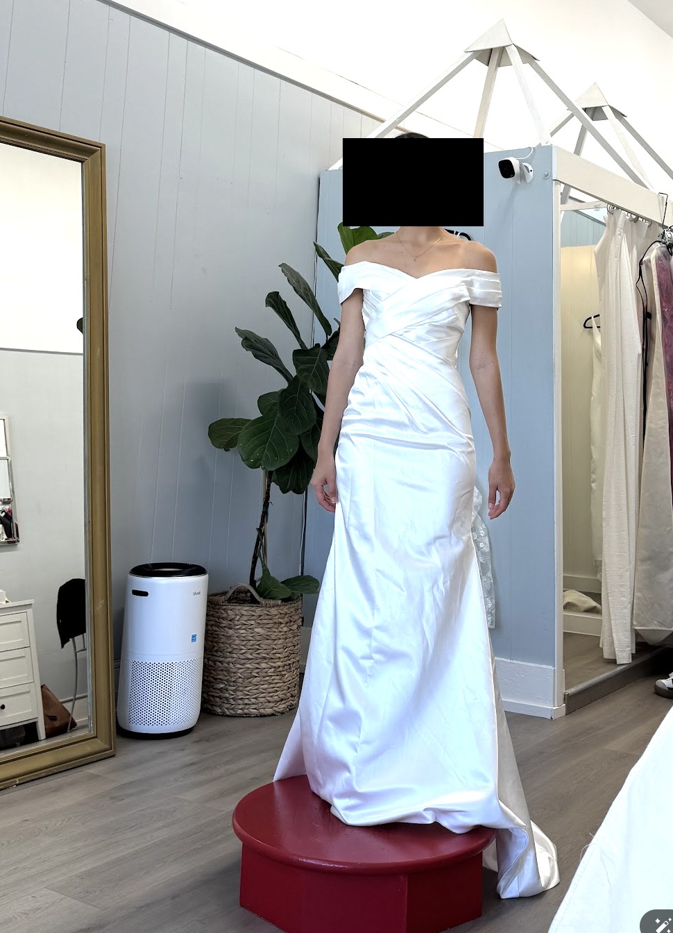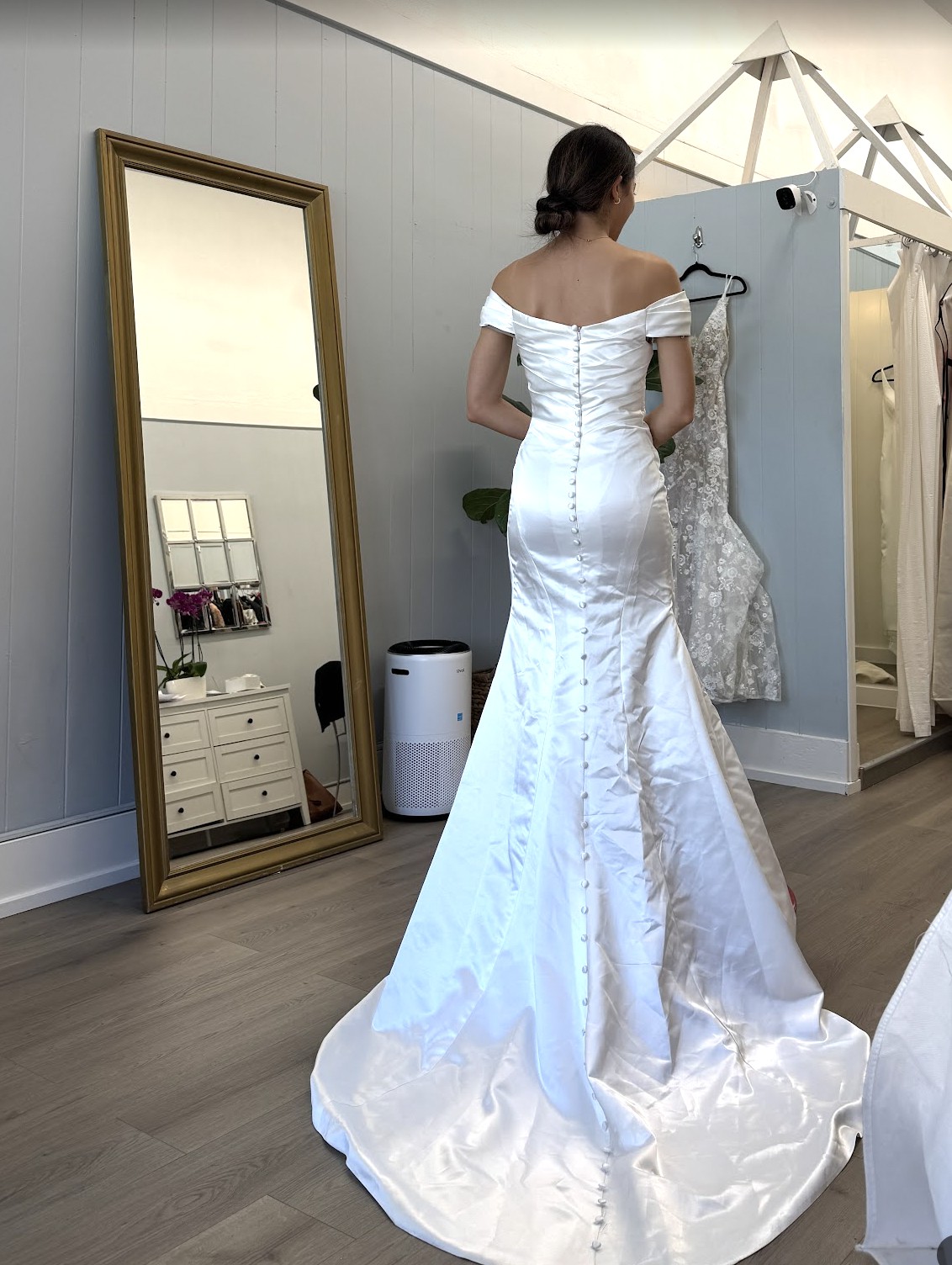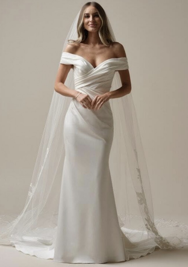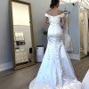 I loved this custom-tailored trumpet wedding dress is pure elegance with its off-the-shoulder neckline