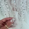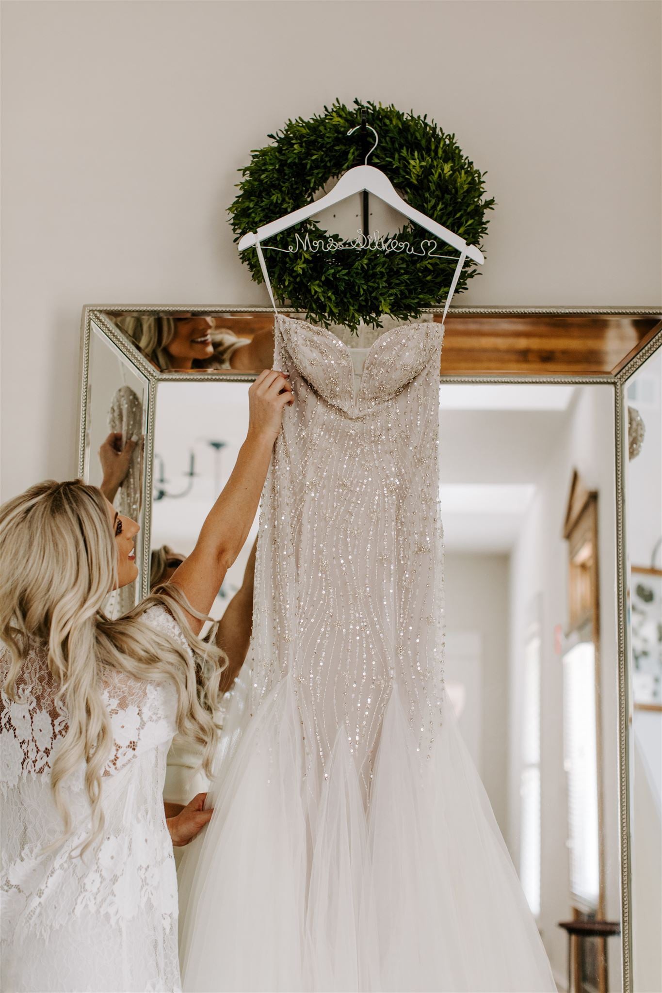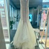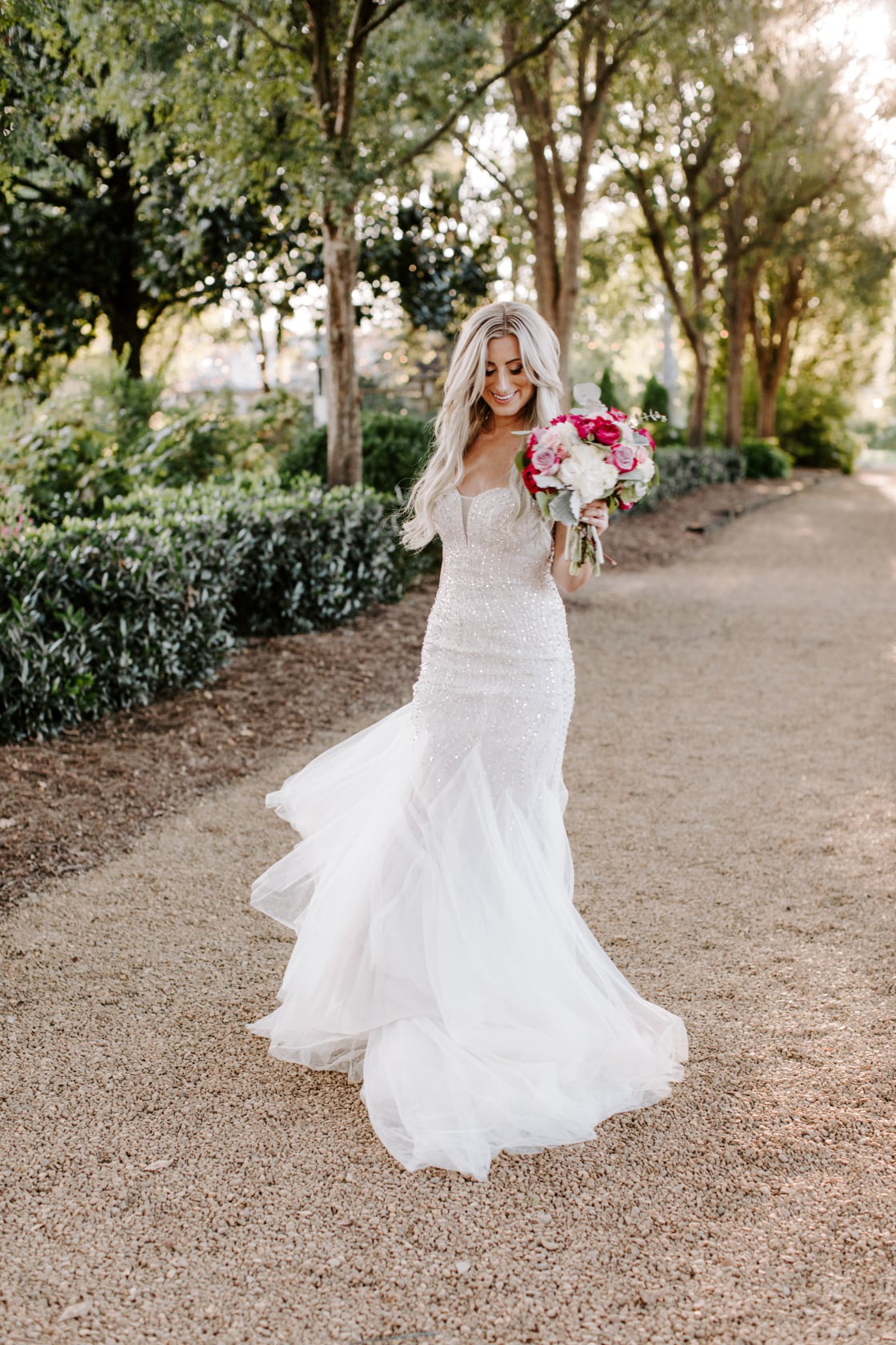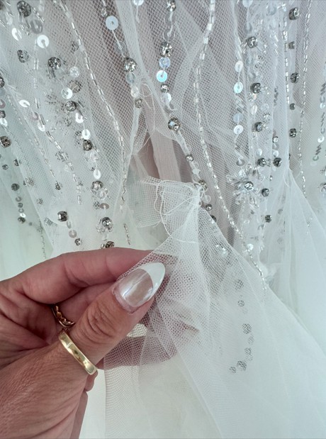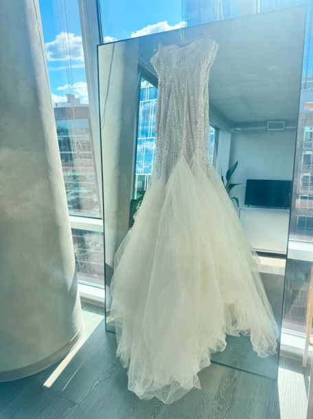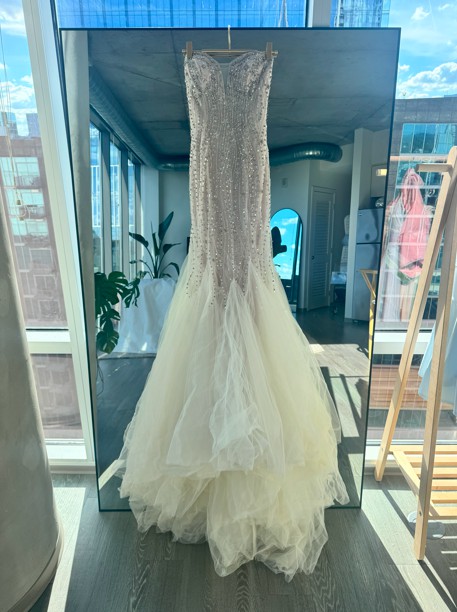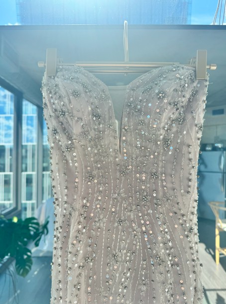 The intricate beading, shimmering crystals, and delicate sequins dance across the fabric, capturing the light in a breathtaking way as you move. The flattering silhouette hugs my curves and flares out at the bottom, creating an elegant and timeless aesthetic. With a mid-back detail that adds just the right amount of allure, this gown is perfect for the bride looking to feel stunning on her big day.