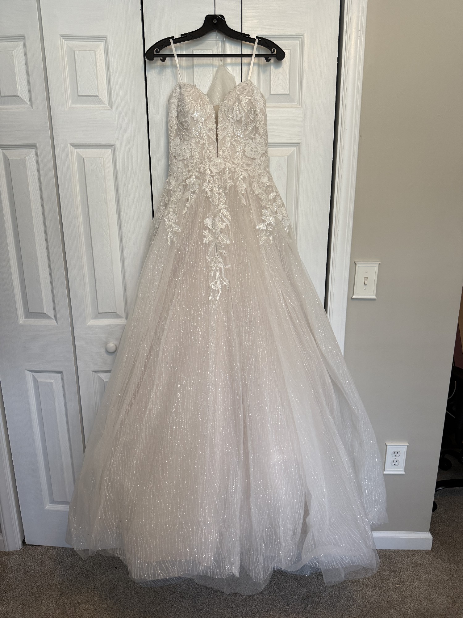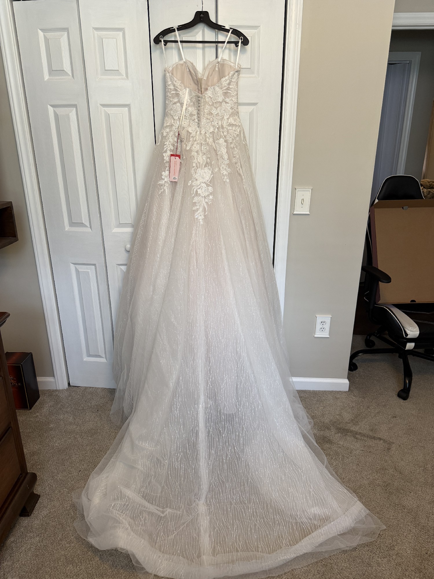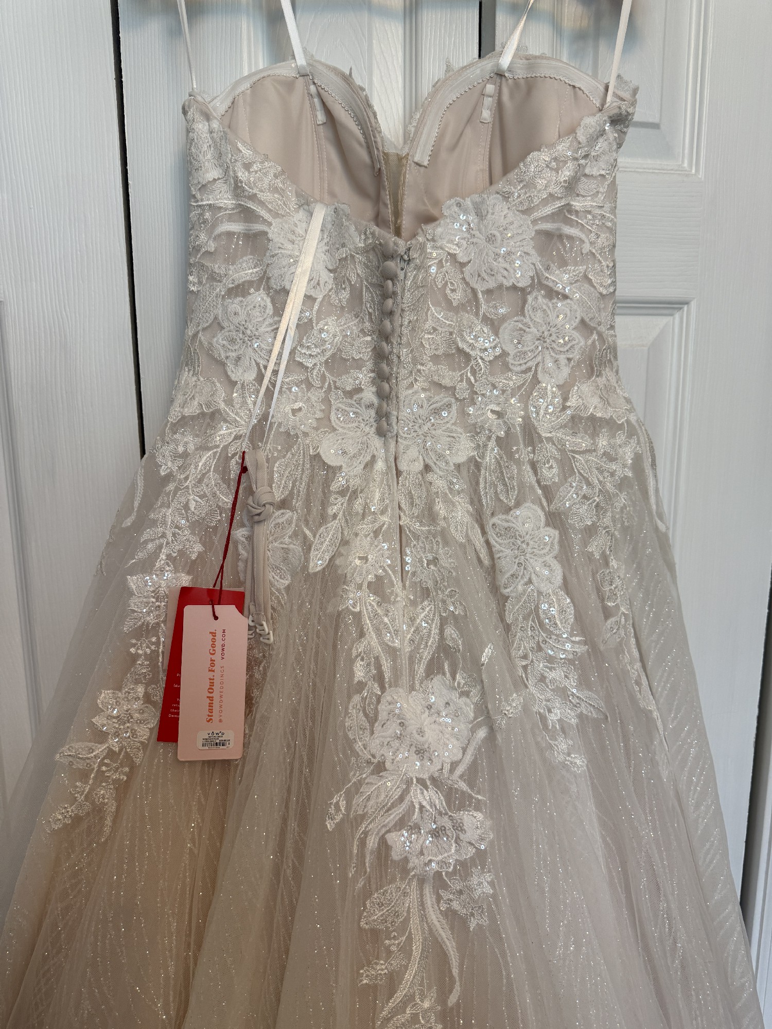 Brand new with tags, original bag and box. This Neptune wedding dress by Vow’d embodies ethereal elegance and timeless romance. This dress is no longer available making it even more desirable! With a captivating A-line silhouette, this gown gracefully flatters your figure, allowing for graceful movement as you walk down the aisle. The sweetheart neckline and strapless design add a touch of allure, perfectly complementing your natural beauty.