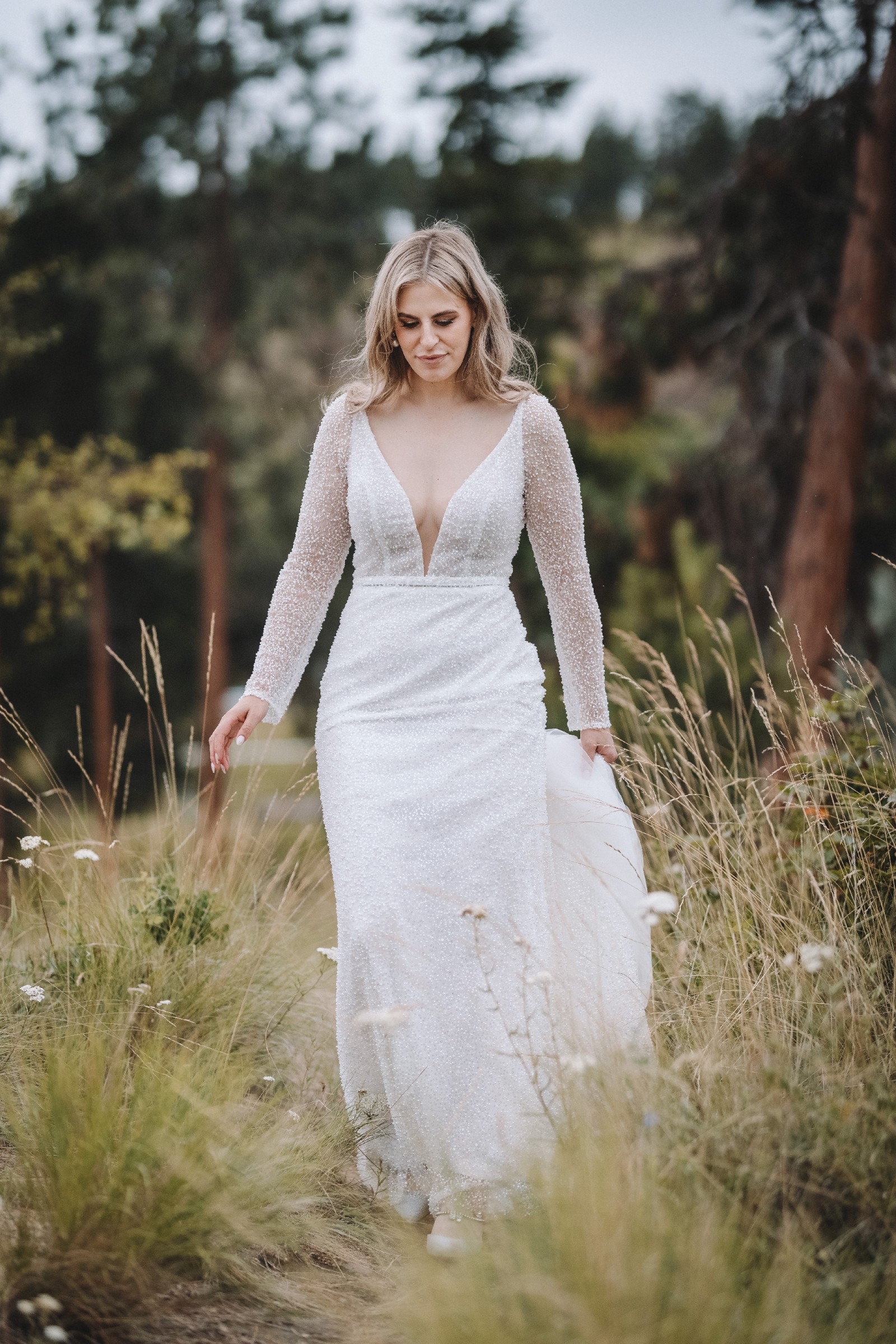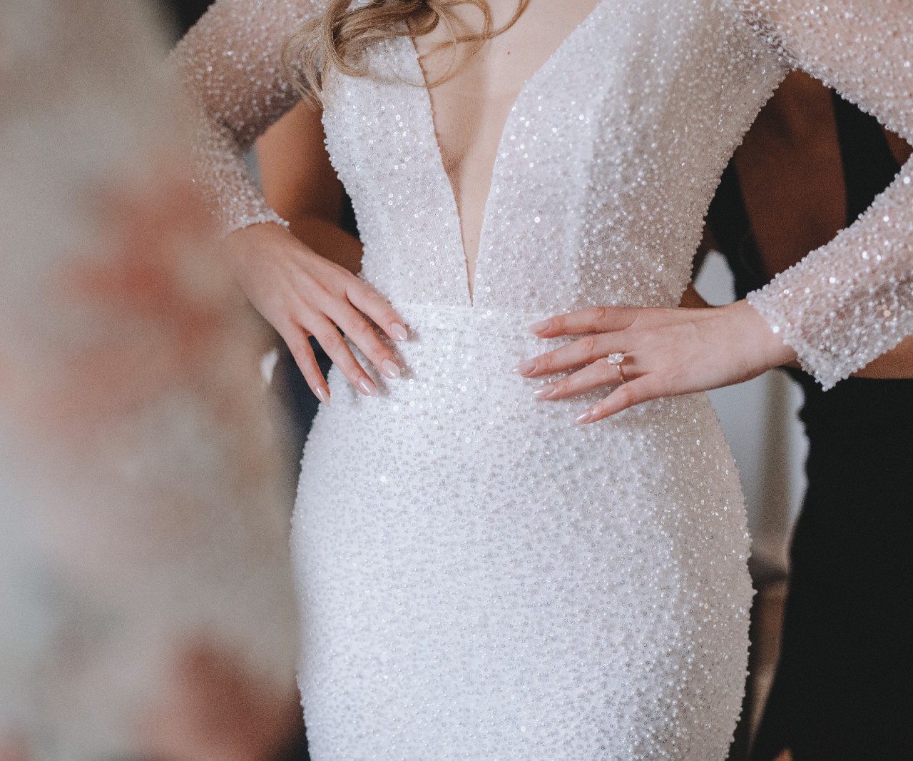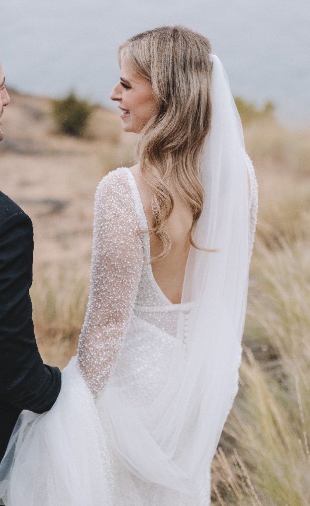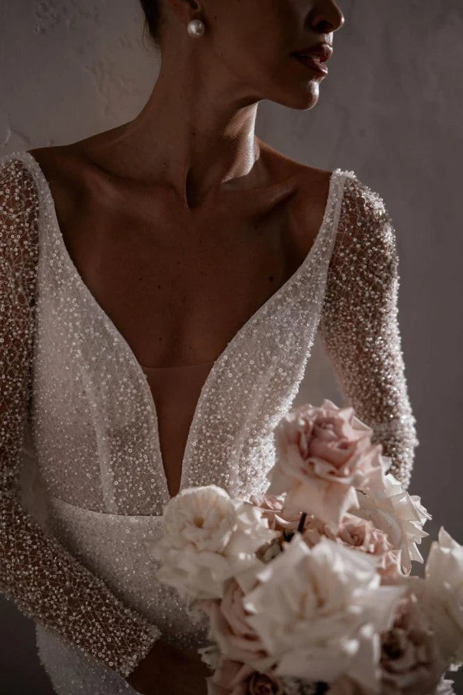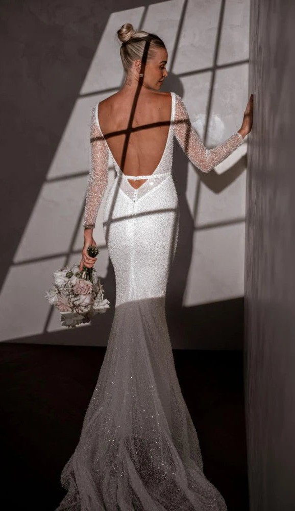 Featuring exquisite pearlescent beading, Margot shimmers with every movement, with her long sheer sleeves. A contoured low back enhances the silhouette, offering a modern edge that feels both bold and effortlessly chic.