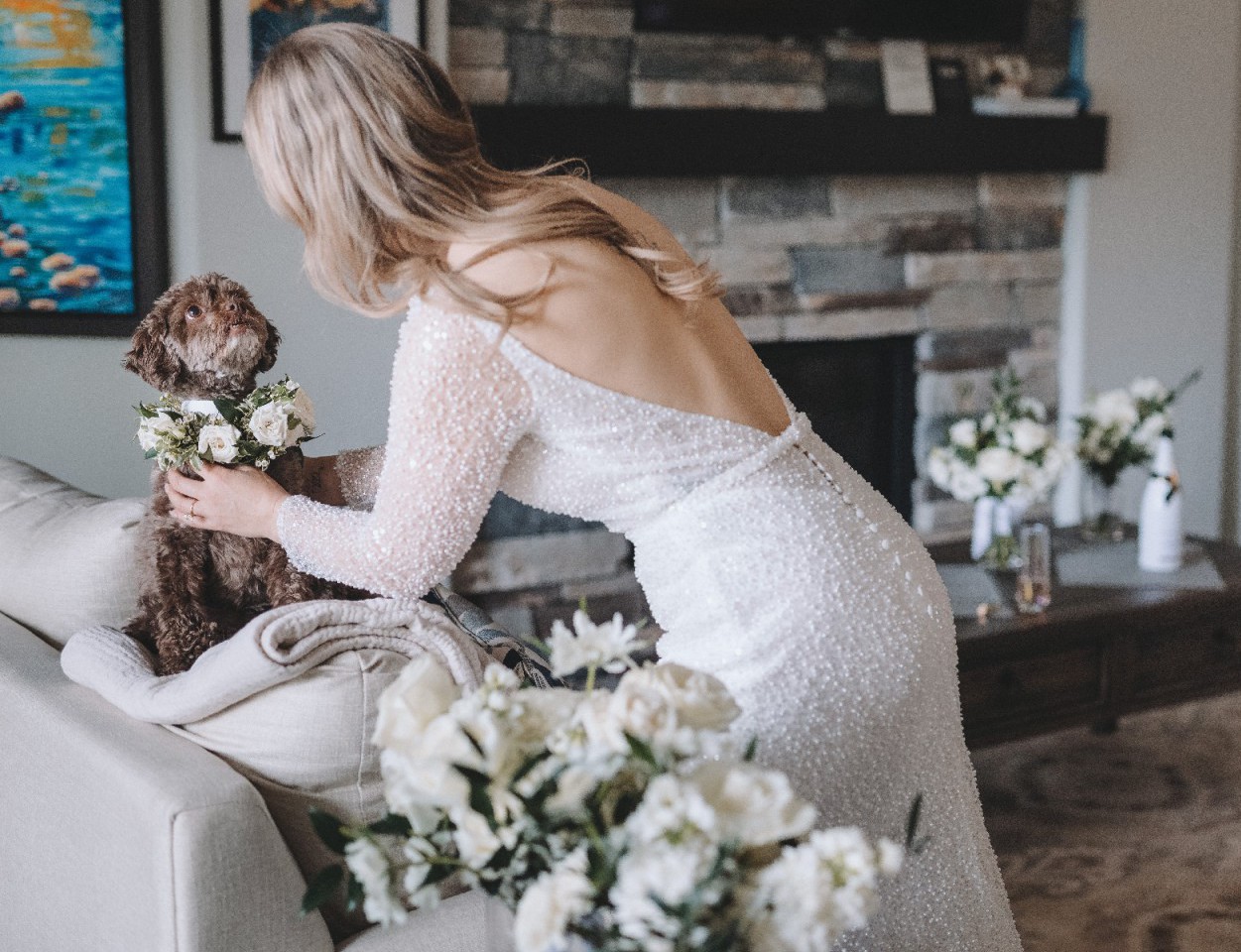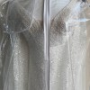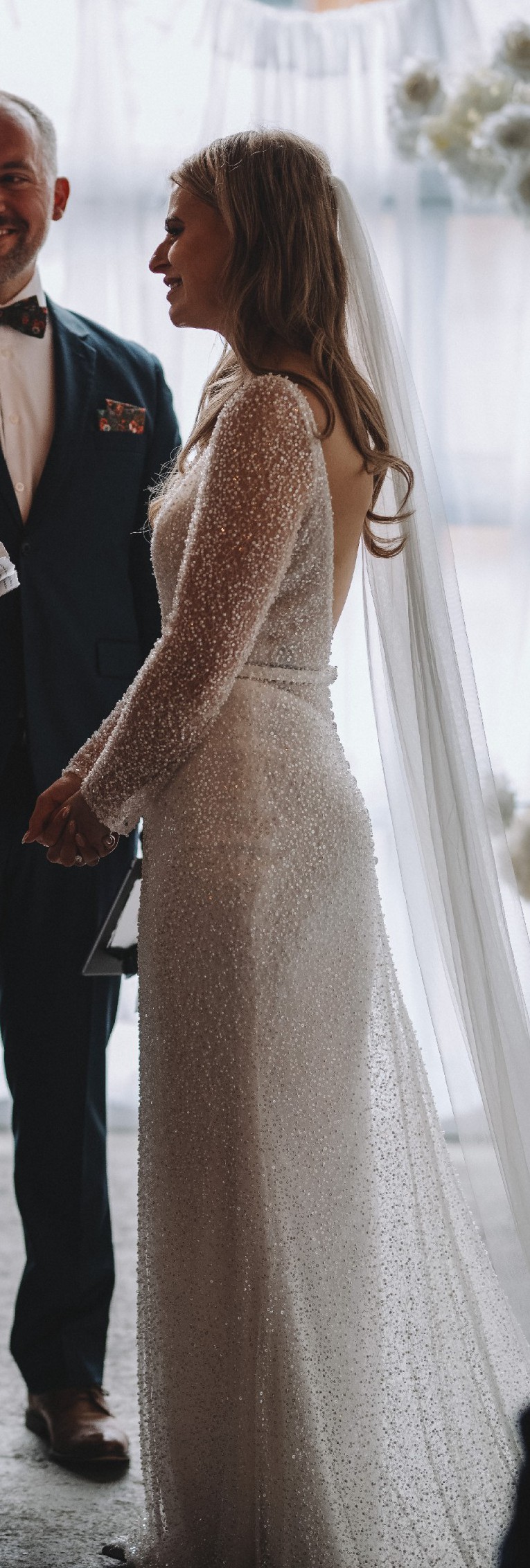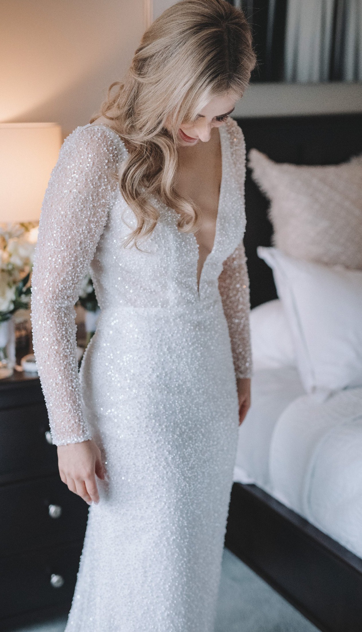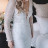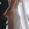 - features long sleeves, low back, sequins and pearls.