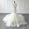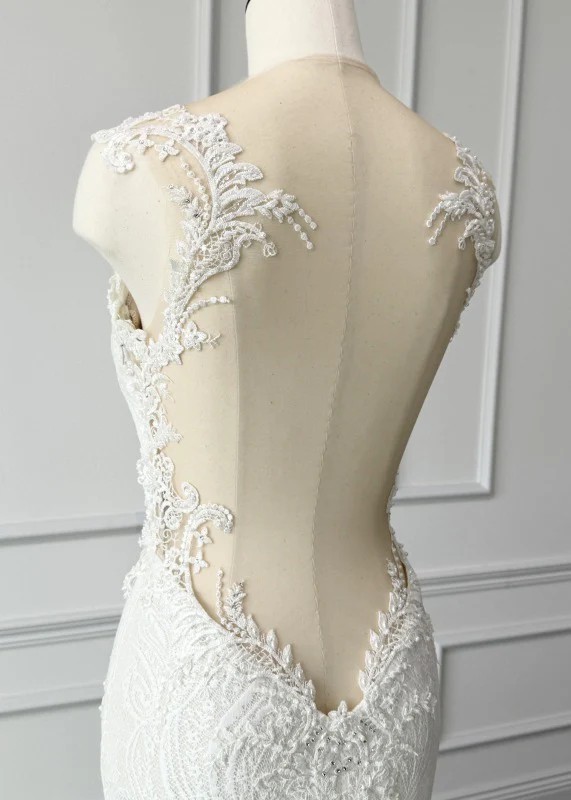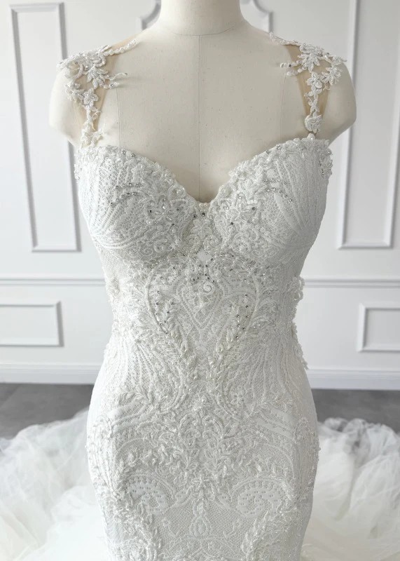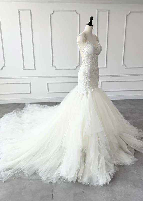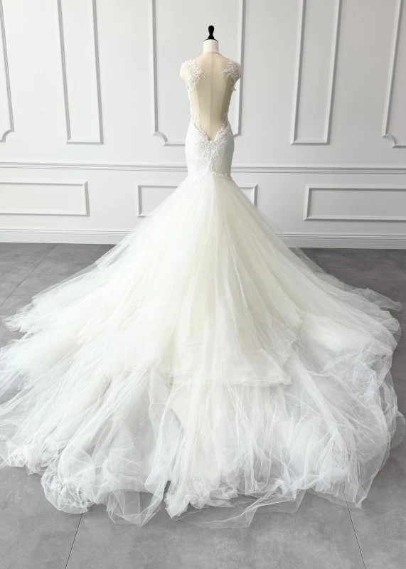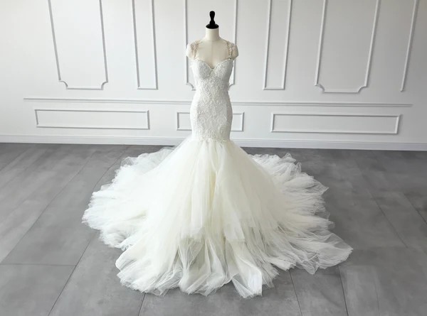 Once at a wedding in September 2024. Condition: Cleaned. Overall in good condition. There are about 5 small holes in the tulle (the trailing part of the dress), but they are on the inside, so they should be unnoticeable.If you are able to visit us in Michigan, you can try on items for free.