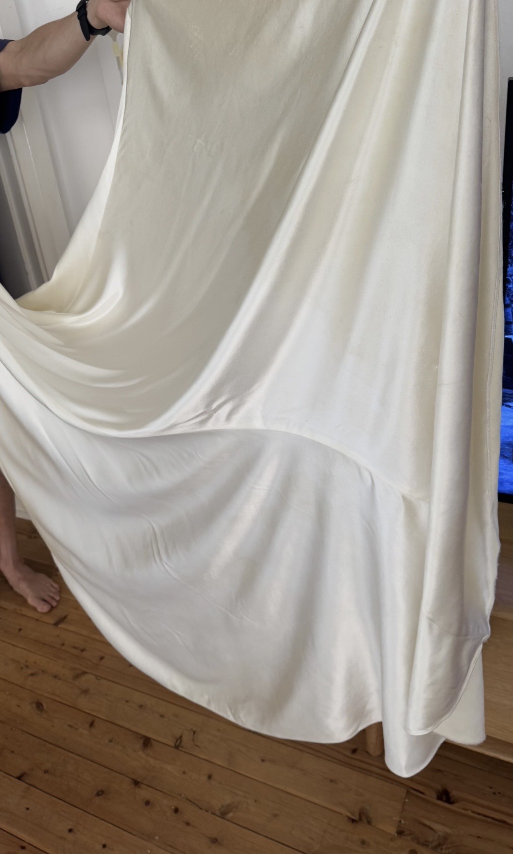 Specifications are exactly as described on the Danielle Frankel website for a US size 4 dress. This dress is in good condition - there are some small pulls on the dress given the nature of the silk/wool blend fabric. There are also marks along the bottom of the dress, mostly visible on the inside, from wearing the dress outdoors, the dry cleaners have done a nice job of getting majority of the marks out. Both the small pulls and marks on the dress are not visible unless looking extremely close up to the dress, and would not be visible in photos. I'm very happy to FaceTime and show the dress, or provide closer pictures upon request.