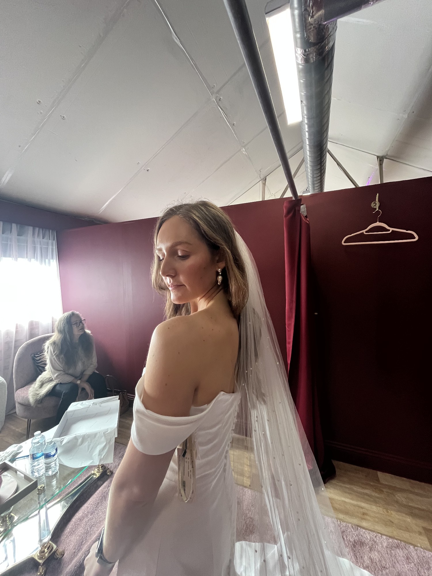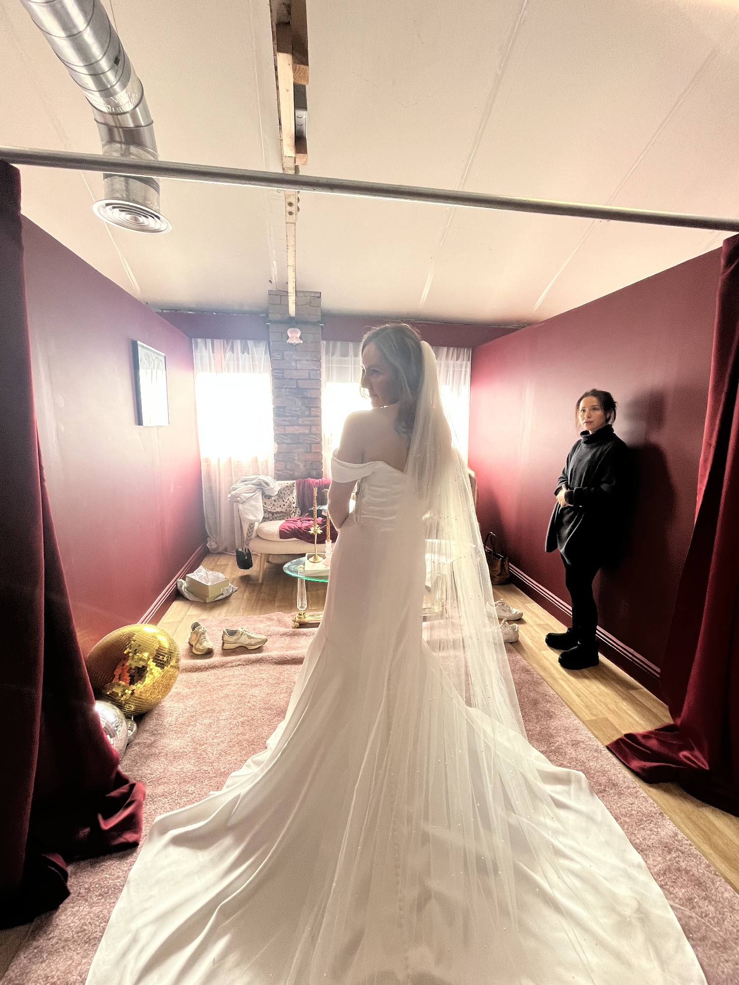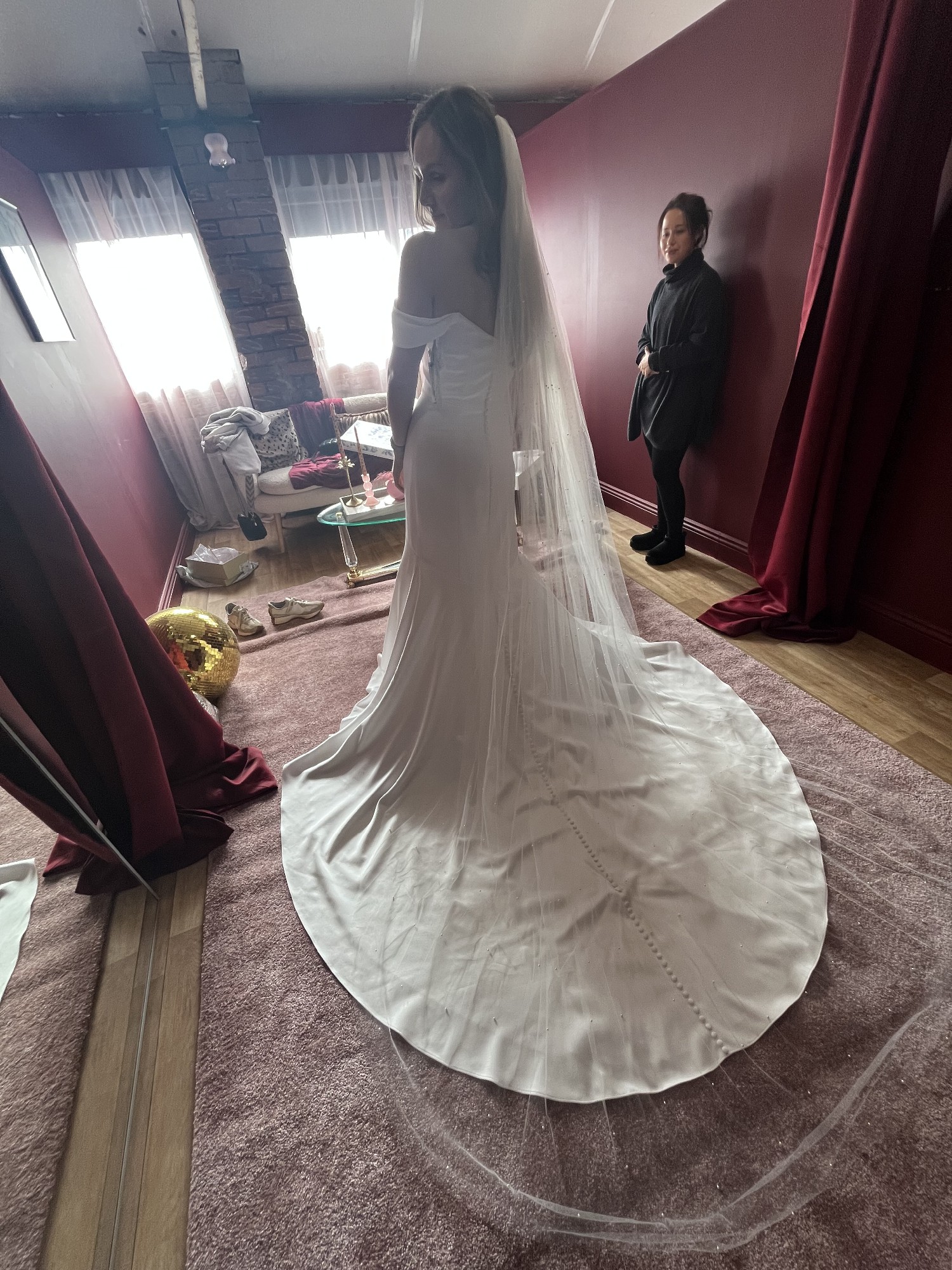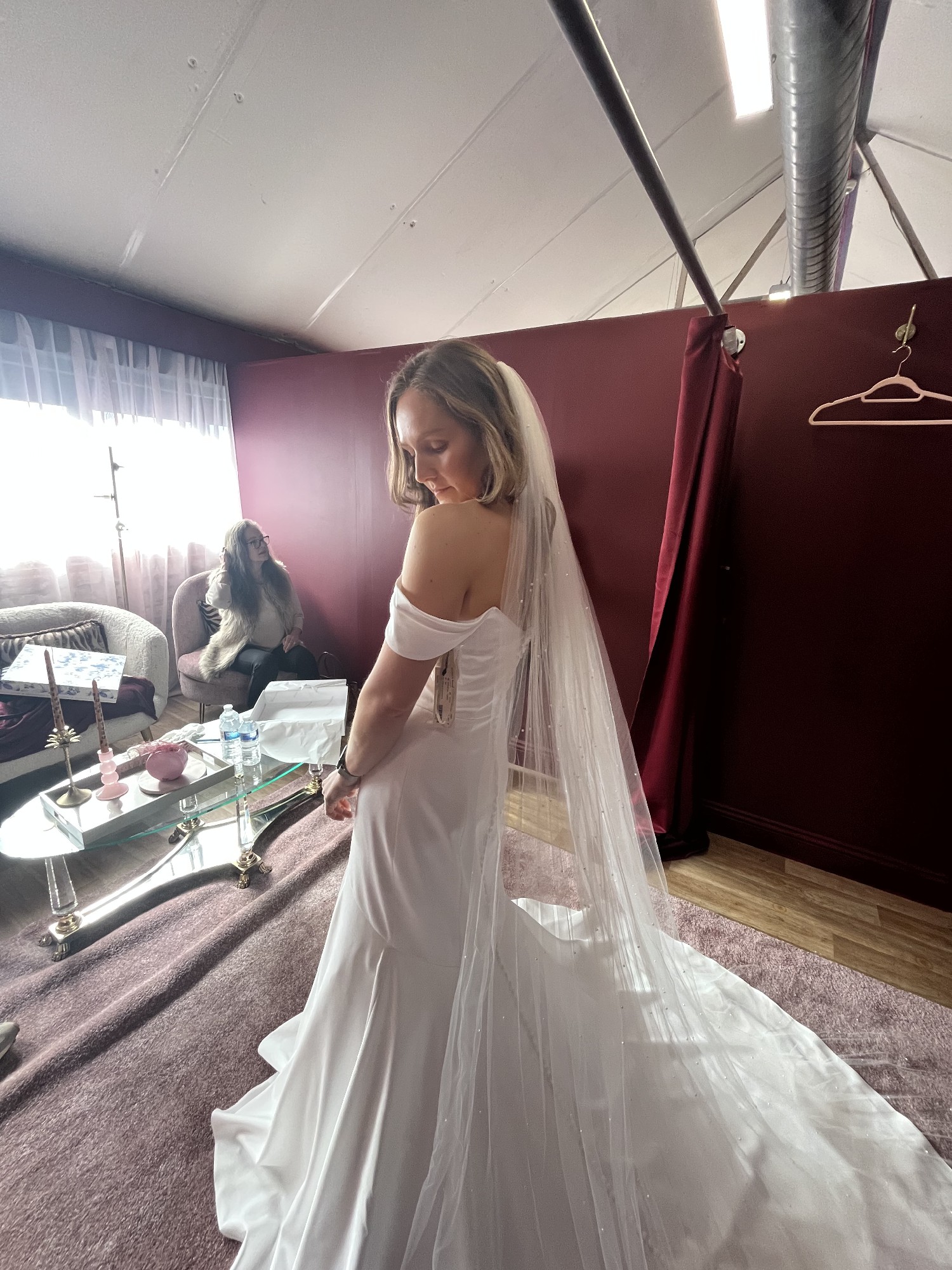 Jenny Yoo Meredith with Sleeves. Draped sleeves can be made detachable for 2 looks in 1. Clean and Classic fit and flare, crafted from a gorgeous soft mikado fabric. Draped, cowl neckline. Internal corsetry for secure support around the bust and waist.