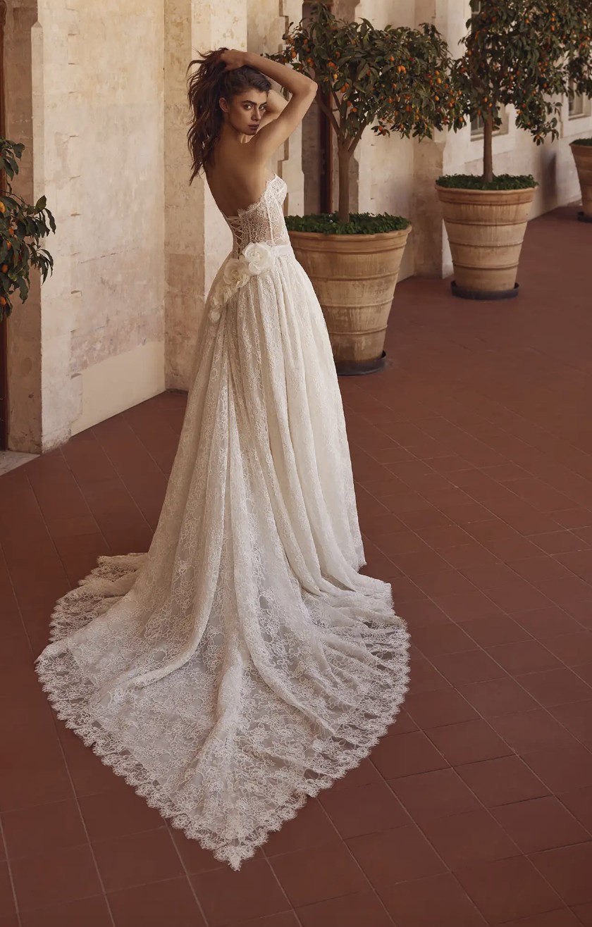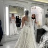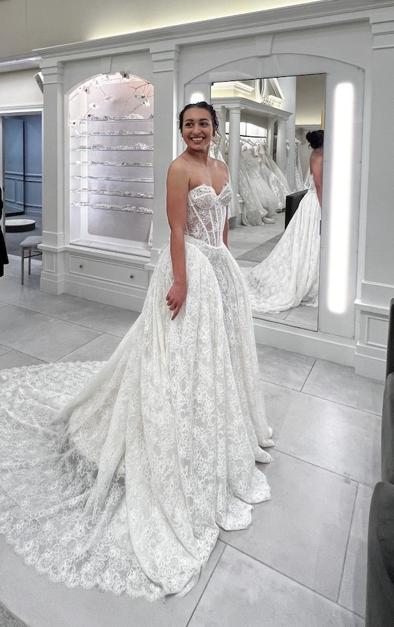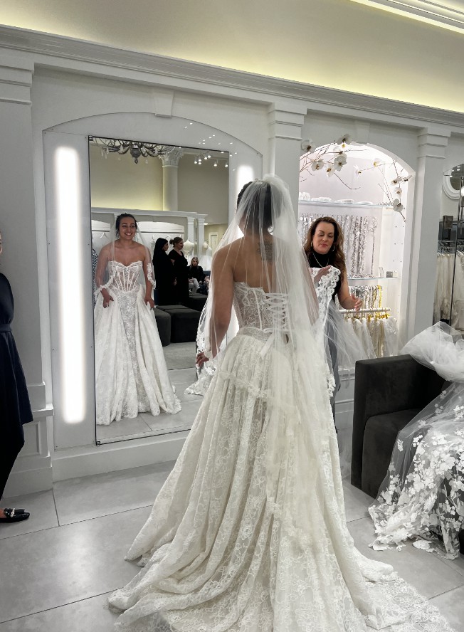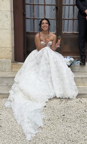 This exquisite gown is the Love by Pnina Tornai, bought in 2024 from Kleinfelds in New York for around $8000. It is a stunning creation that perfectly captured my heart on my wedding day. The beautiful A-Line silhouette with a long train, is both flattering and comfortable, allowing me to move gracefully while celebrating with my loved ones. The straight/sweetheart neckline adds an elegant touch, while the strapless design showcases my shoulders and collarbone perfectly.