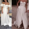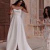 The dress was only worn for a few hours and has been professionally dry cleaned with no stains. The A-line dress comes with a strapless, sweetheart neckline and voluptuous draping. The skirt features a dynamic front slit and long train. The dress is super versatile as it can be worn 3 ways - strapless, with off shoulder sleeves and puff sleeves.