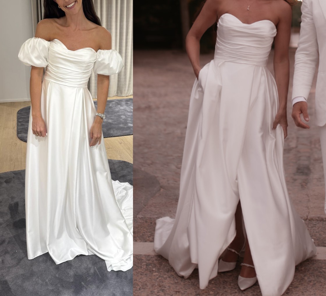 Sleeves - The dress comes with two detachable sleeve options, one of which is off the shoulder, the other is puff sleeve (created custom from the original sleeve with the long sleeve cut off).