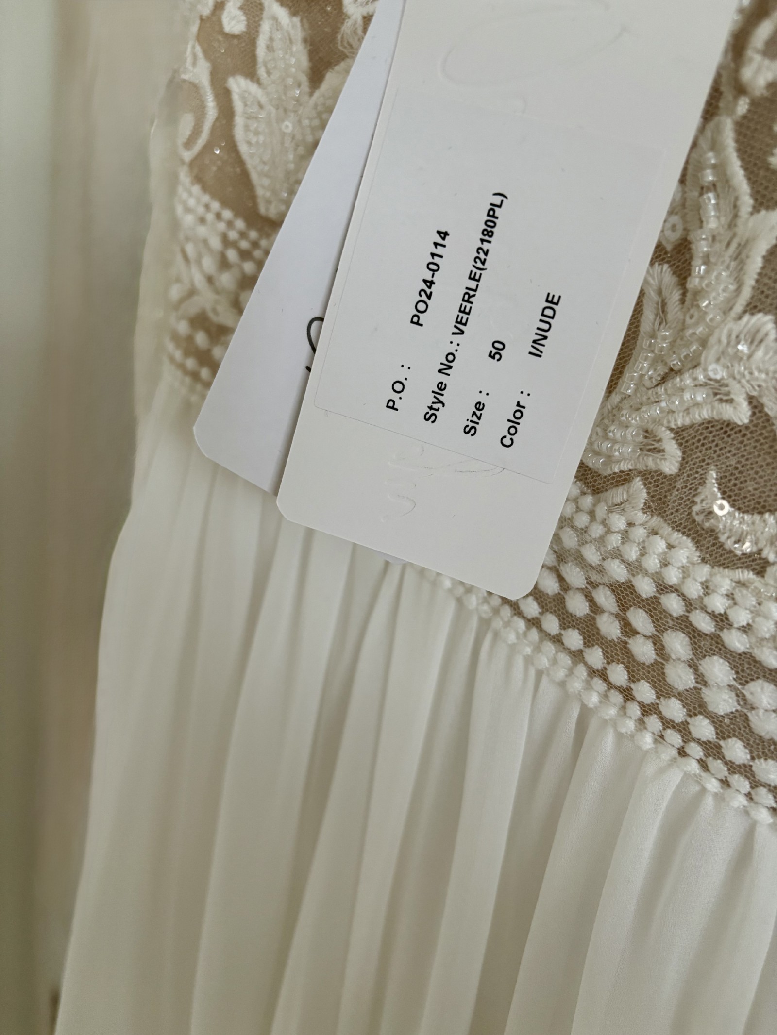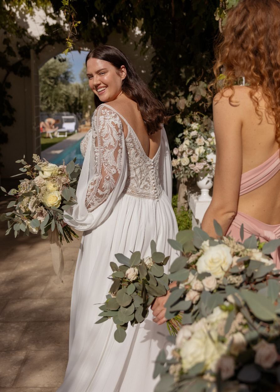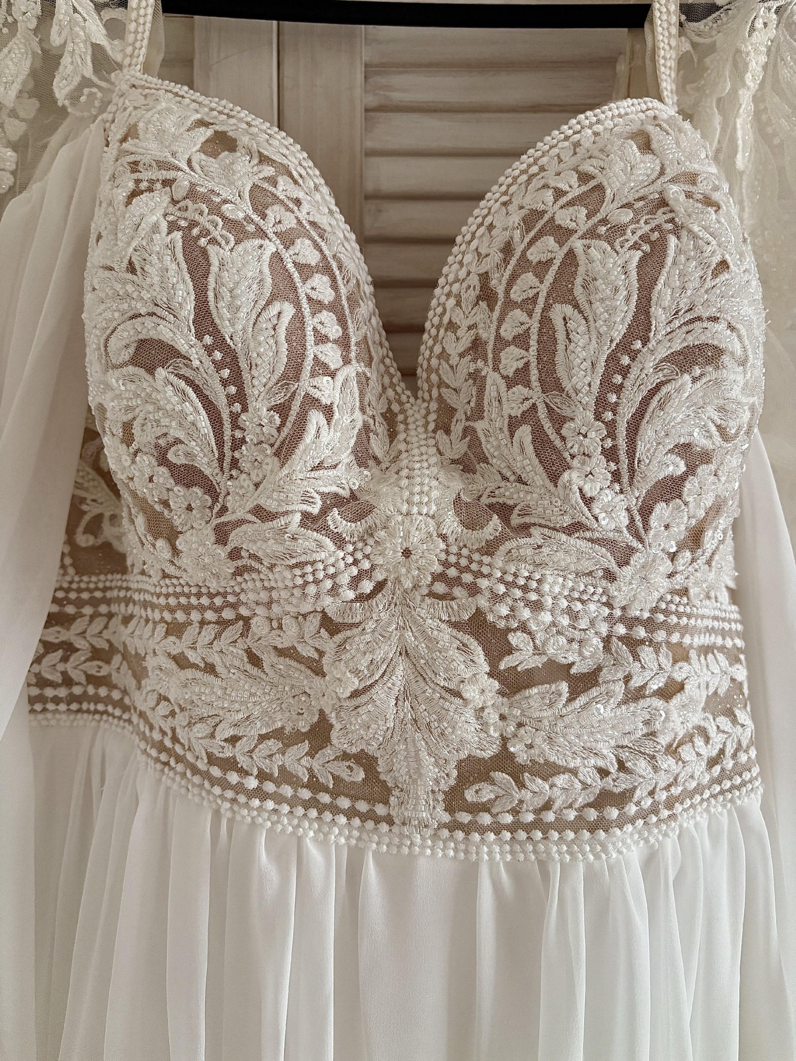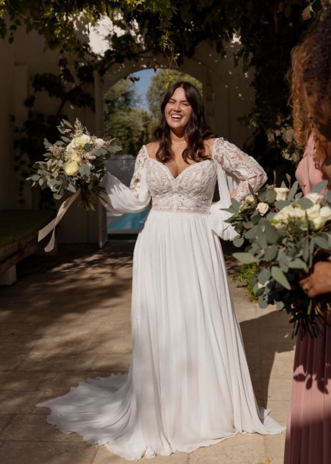 An added bonus of this dress is its detachable sleeves, giving you the versatility to transform your look from ceremony to reception effortlessly. With Veerle, you’ll embrace your curves beautifully, radiating confidence and grace as you step into forever. This dress is not just a gown; it’s a statement of love and your unique style.