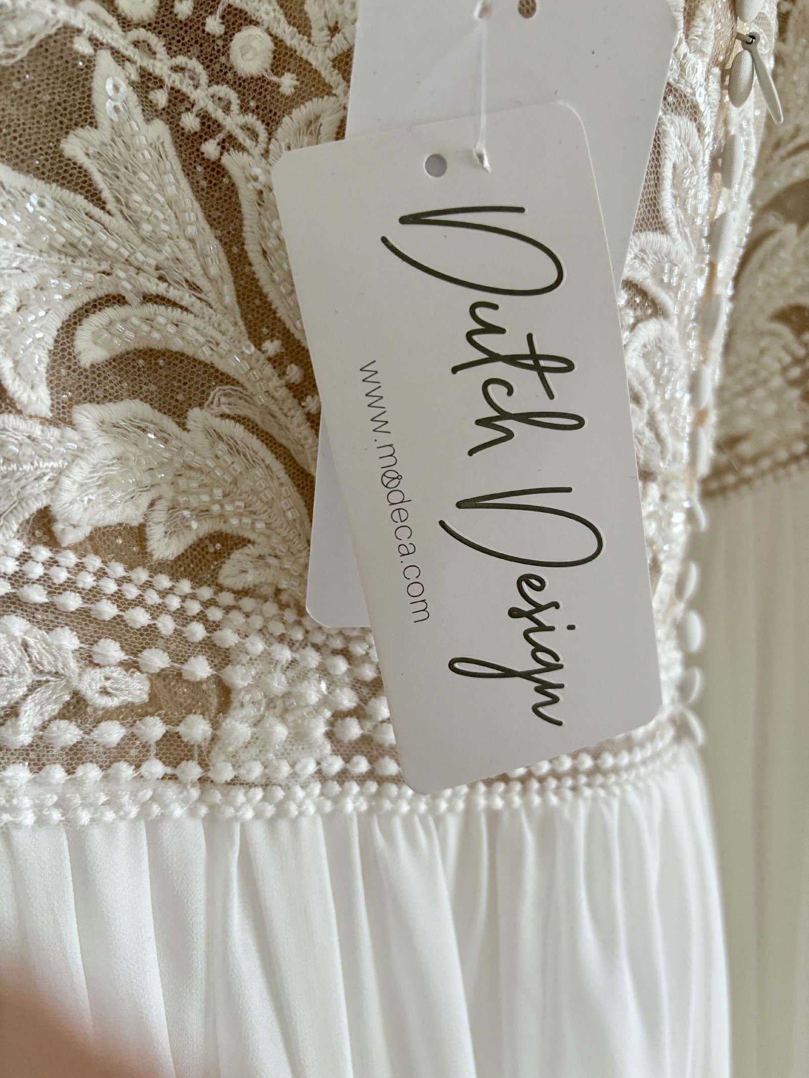 The long sleeves lend a sense of timeless charm, while the backless design adds an element of surprise and allure. This unique combination makes the Veerle dress an unforgettable choice for any wedding season. The floor-length gown is adorned with exquisite beading and delicate embroidery, ensuring you sparkle with every movement. The intricate pearls add a luxurious touch that echoes the dreamlike atmosphere of your celebration.
