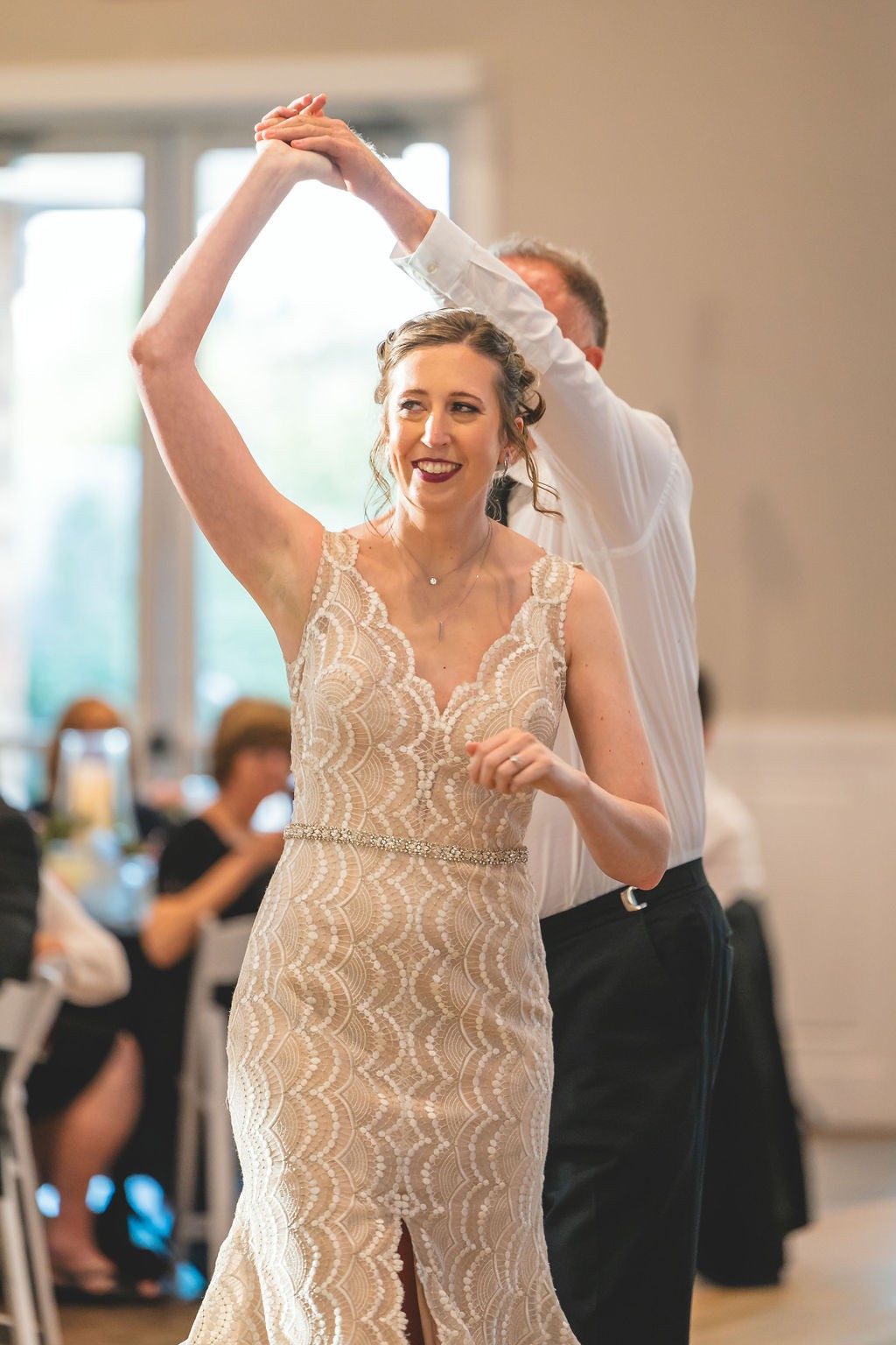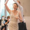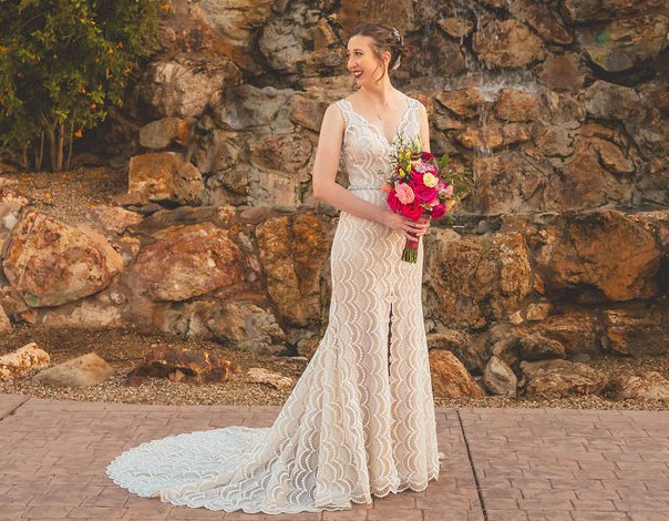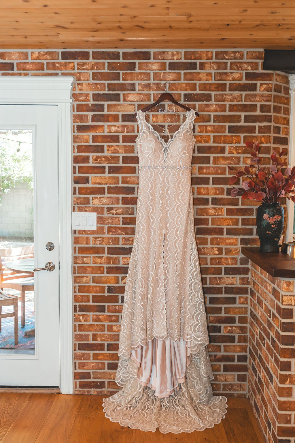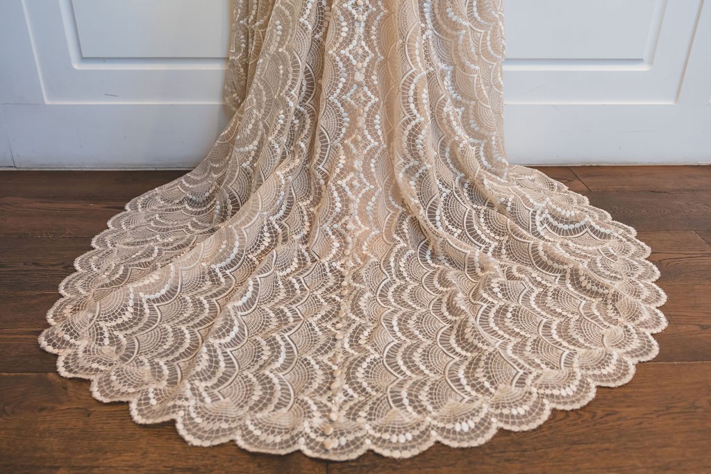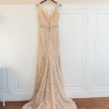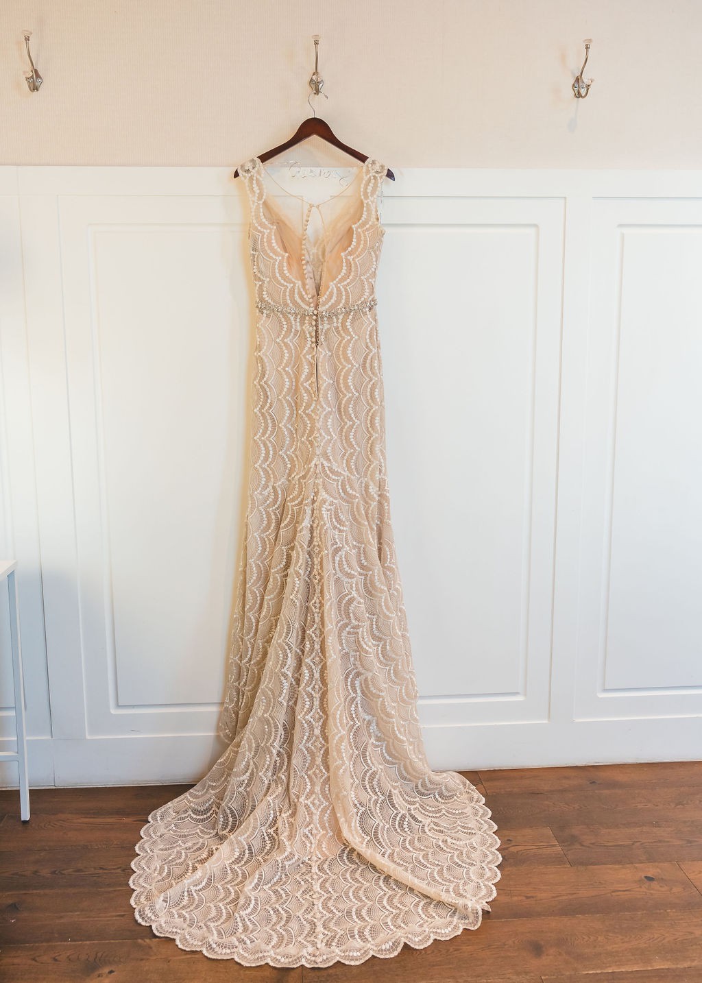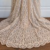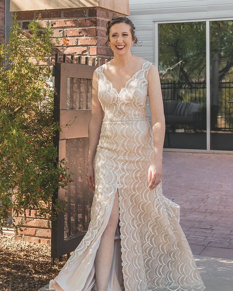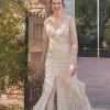 The Madison James MJ 303 is a bridal gown with a fit-and-flare silhouette, a sweetheart neckline, and a natural waist. It features all-over lace with beading, a chapel-length train, straps, and a low, sheer/illusion back. Key features include a scalloped neckline, a thigh/front slit, and a belt, with a silky lining for comfort, notes Nearly Newlywed.
