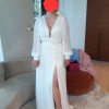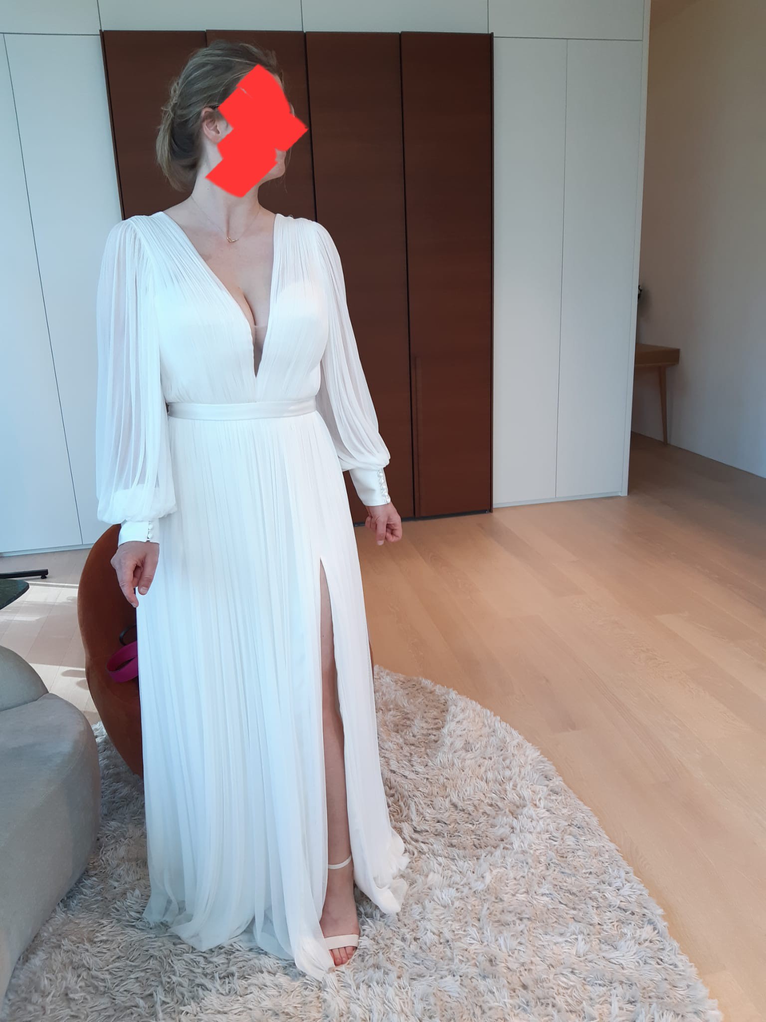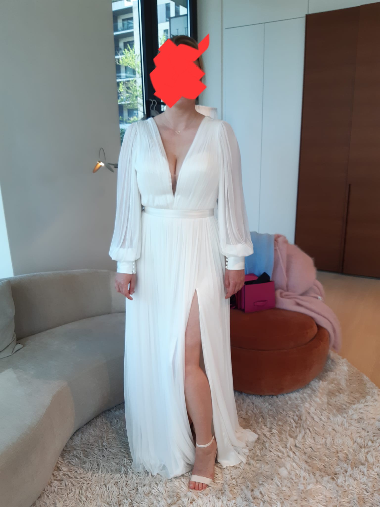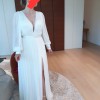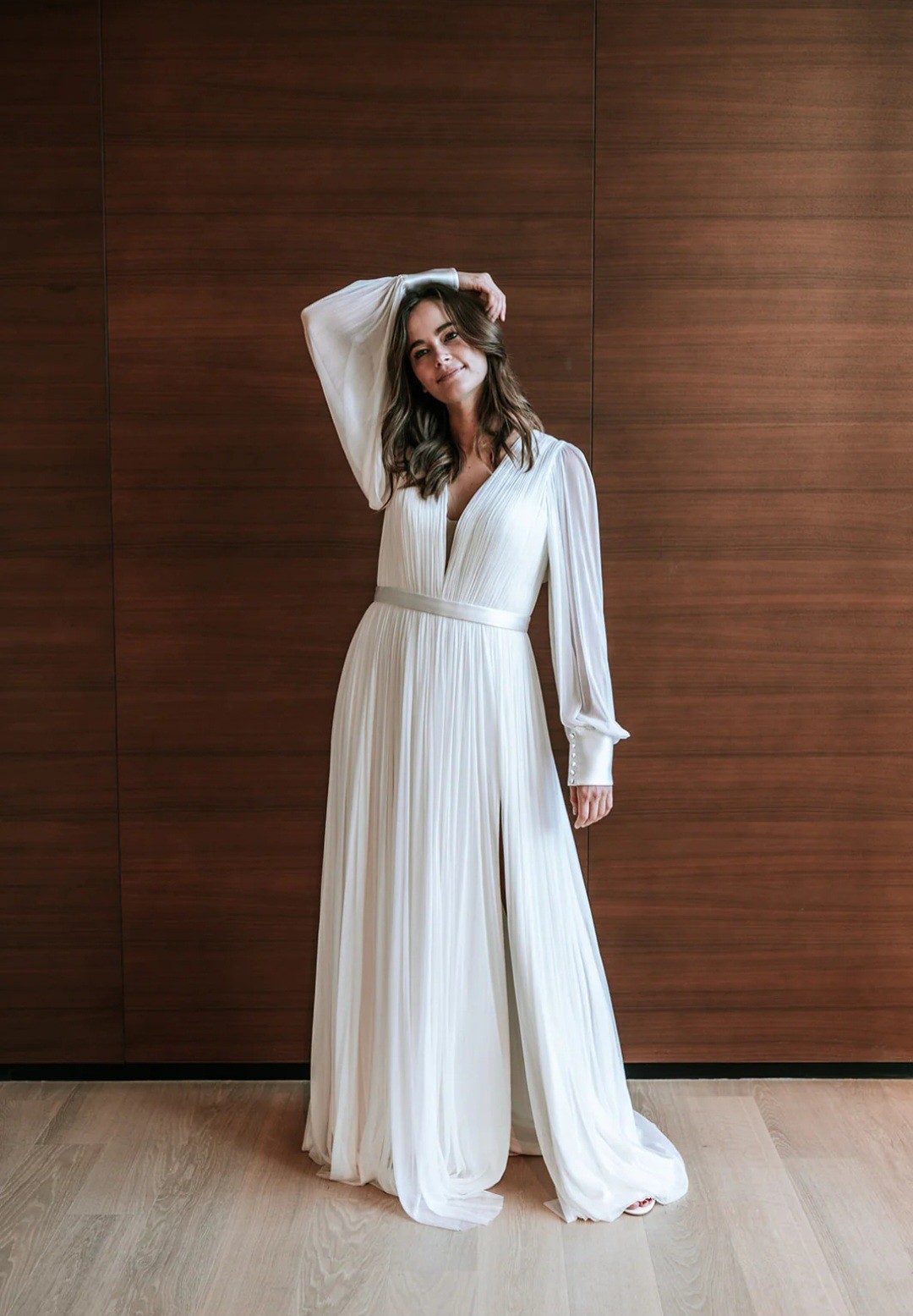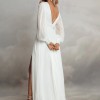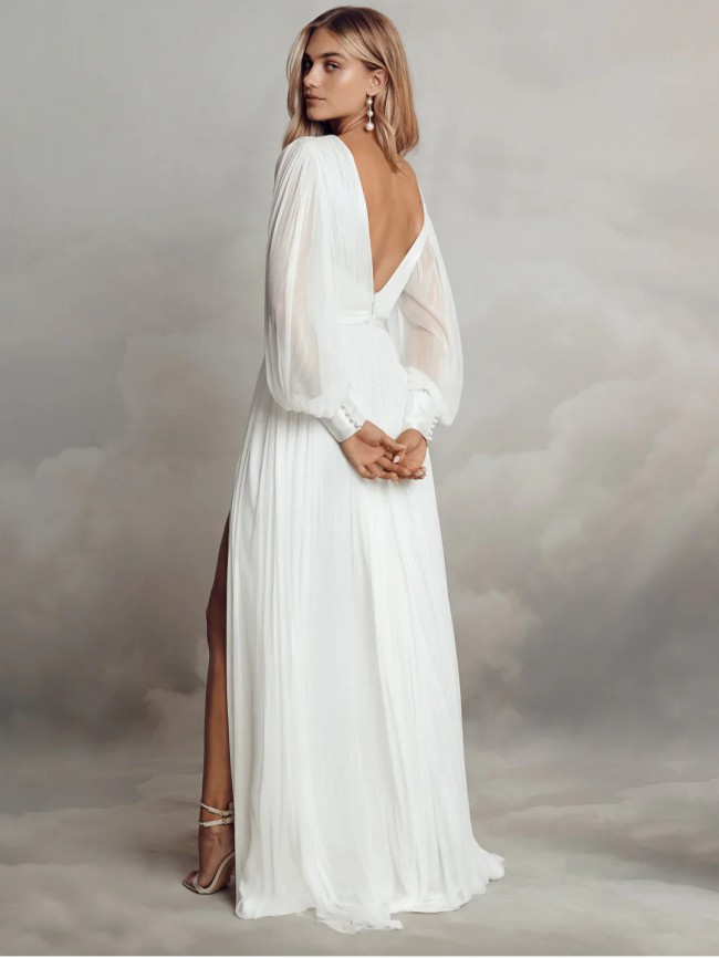 With its long puff sleeves, this gown is perfect for a romantic wedding, adding an element of whimsy while providing coverage. The floor-length design flows effortlessly, with a daring high slit that allows for graceful movement and a hint of daring sophistication. Whether you’re walking down the aisle or dancing the night away, the Levi Gown will make you feel both enchanting and empowered.