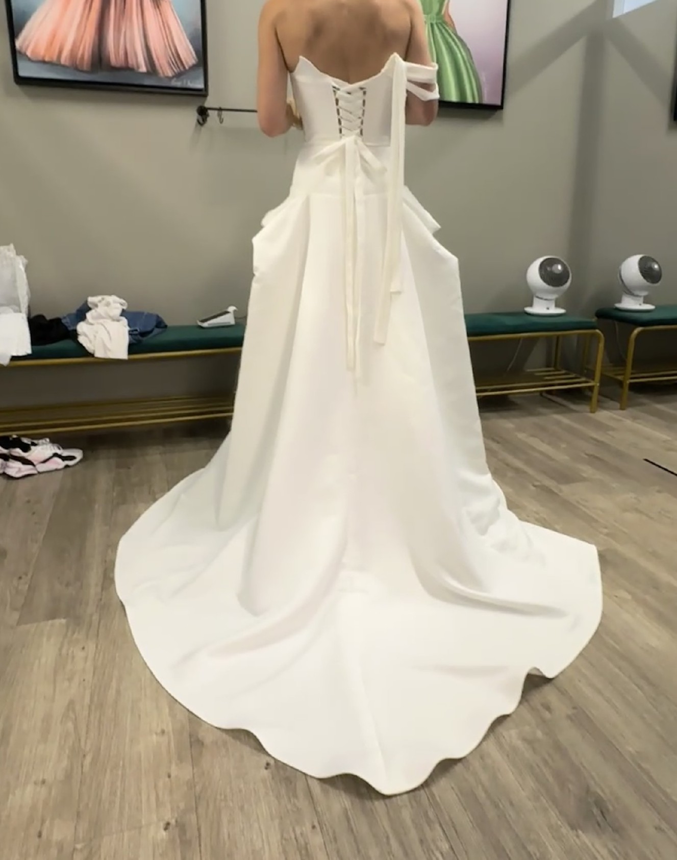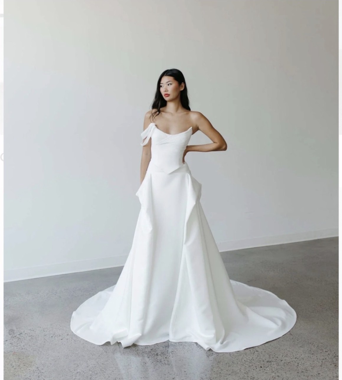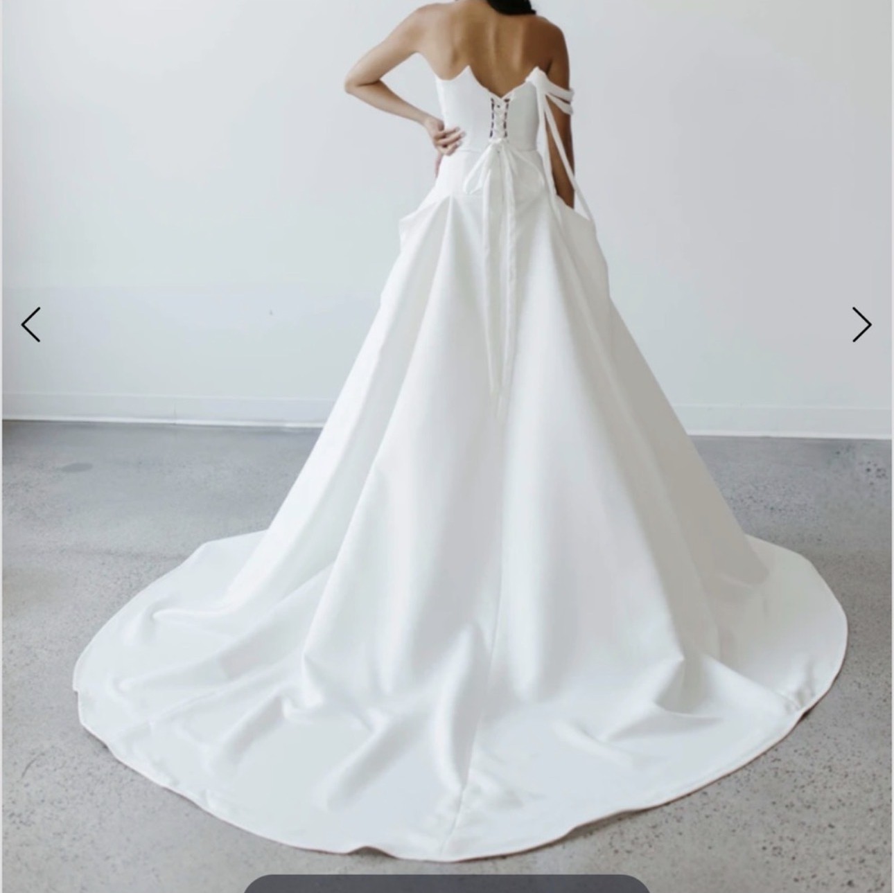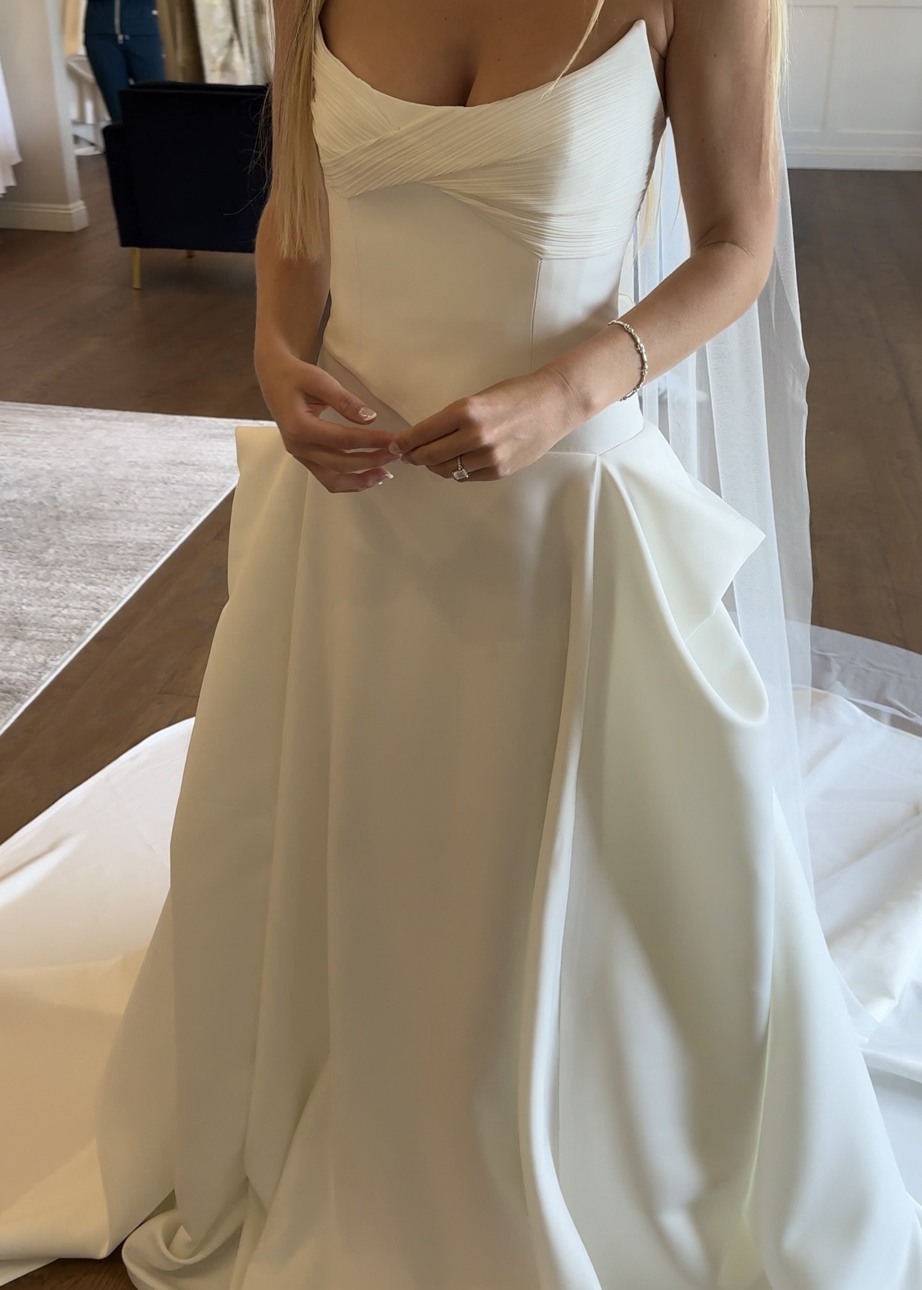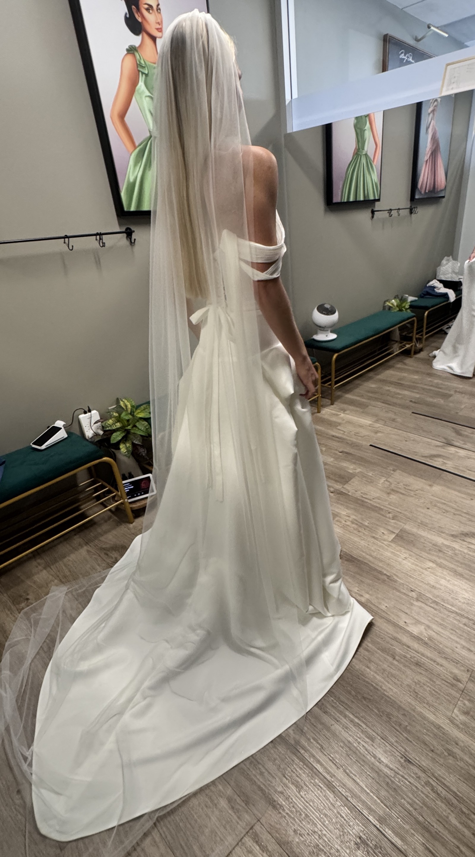 This Tara LaTour Penelope gown is the kind of dress that makes you feel instantly bridal. It’s a two-piece design with a structured strapless corset and a flowing matte satin skirt. The corset has soft pleated crepe detailing, a flattering scoop neckline, and a removable off-the-shoulder swag that lets you switch between a sleek or romantic look. The dropped-waist skirt drapes beautifully with pick-up folds and a sweeping train that moves like a dream. I fell in love with this dress the moment I tried it on. It’s lightweight, comfortable, and photographs beautifully. I recently chose a different style for our venue, so I’d love to pass this special gown on to another bride. Details: • Brand new, never worn, pristine condition • Tara LaTour 2025 Designer Collection • Two-piece corset and skirt with removable swag • Flattering structured fit with soft satin movement • Matching veil available • Open to offers Happy to share more photos, videos, or fit details!