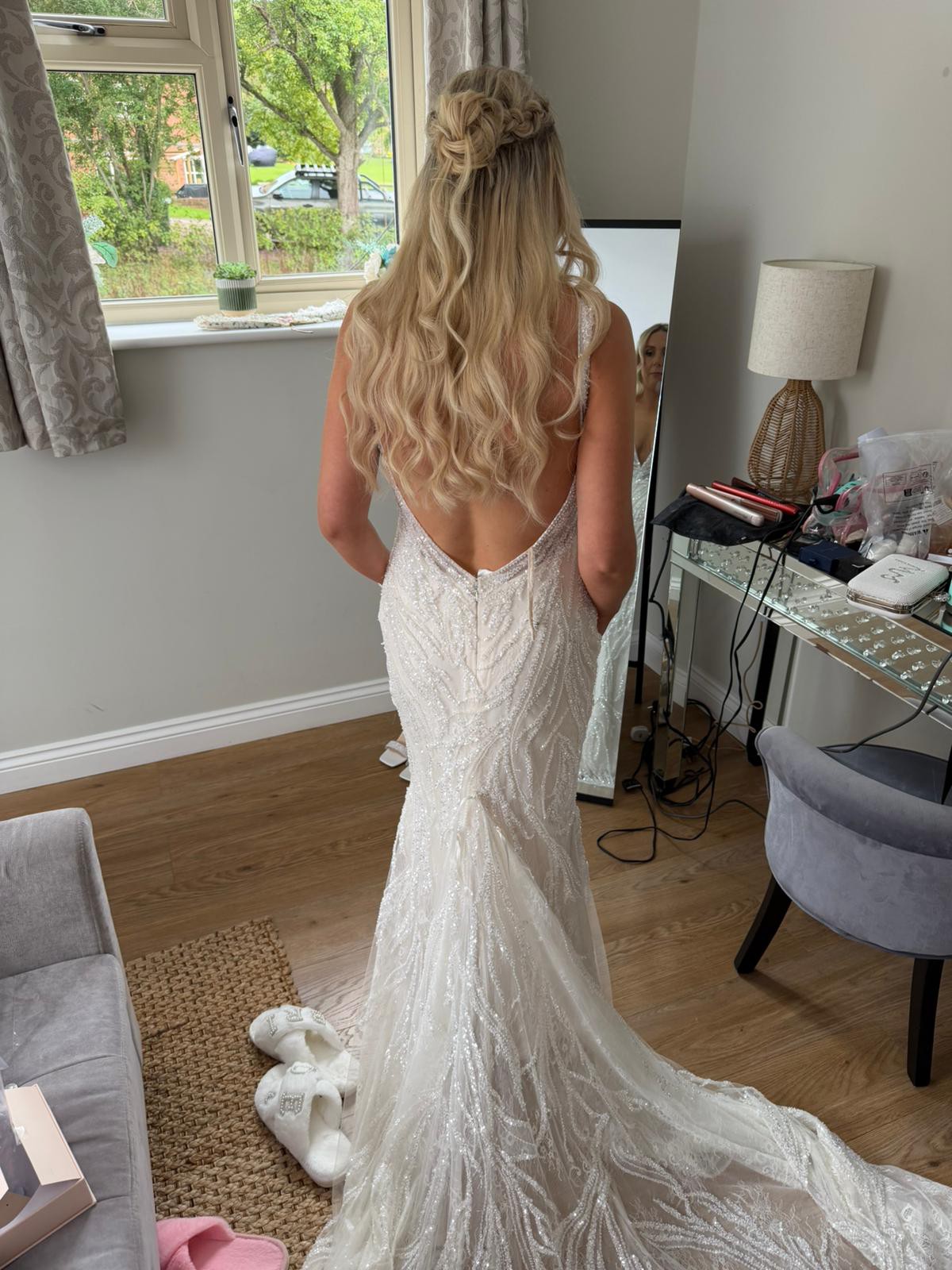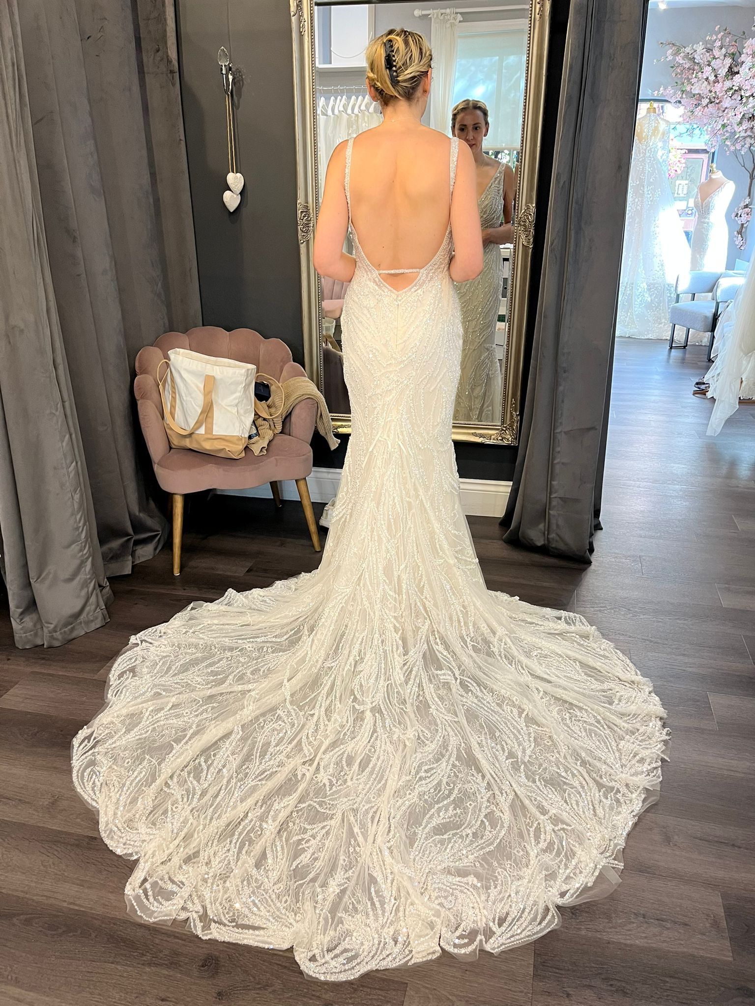 The alluring V-neckline shows just the right amount of skin, while the backless design adds a touch of glamour and sophistication. I particularly loved the delicate straps that provide support without overshadowing the stunning details. Adorned with exquisite beading and crystals, this dress sparkles in any light, making every photograph a testament to its beauty.