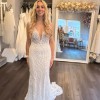 SILVIA is all about the luxurious, unique details that flatter the figure and provide picture-perfect sophistication. The bold yet delicate geometric beaded lace envelops the gorgeous bodice with a plunging illusion V-neckline and low, open V-back with a sexy, sparkling thin strap detail. The eye-catching lace trickles down the tulle mermaid skirt into lush organic motifs at the hem of the jaw-dropping train.