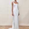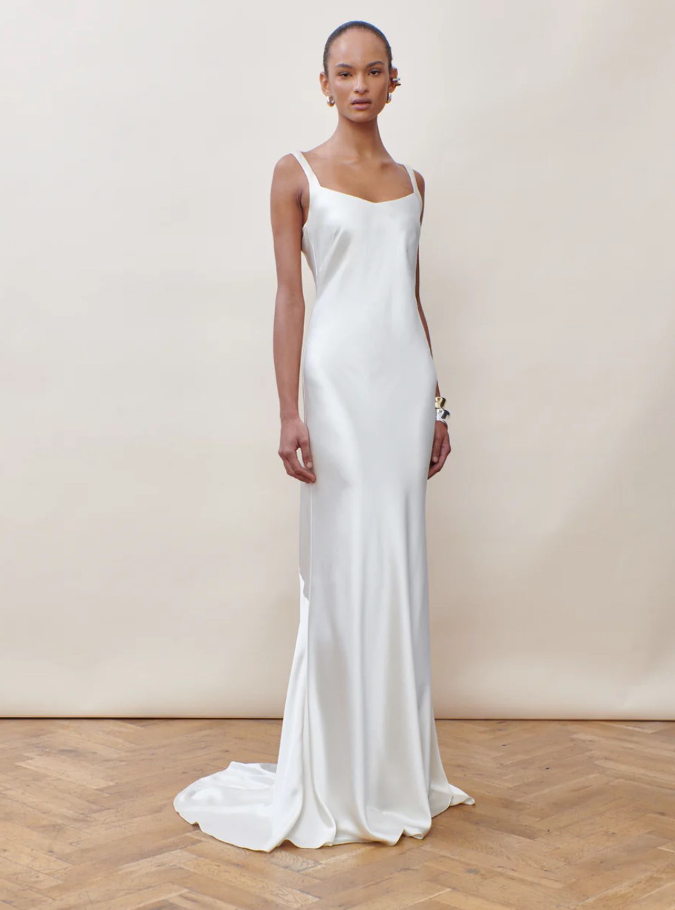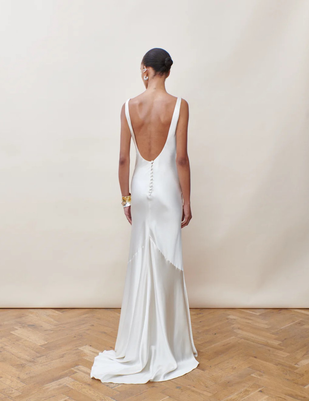 This stunning show-stopping wedding gown in lustrous silk satin for a figure skimming fit. Shown here in our signature ivory silk satin, it has wide straps and a daring back with simple covered buttons which skim your lower back, creating an incredibly beautiful and flattering shape. An exquisitely crafted, beautifully chic wedding gown.