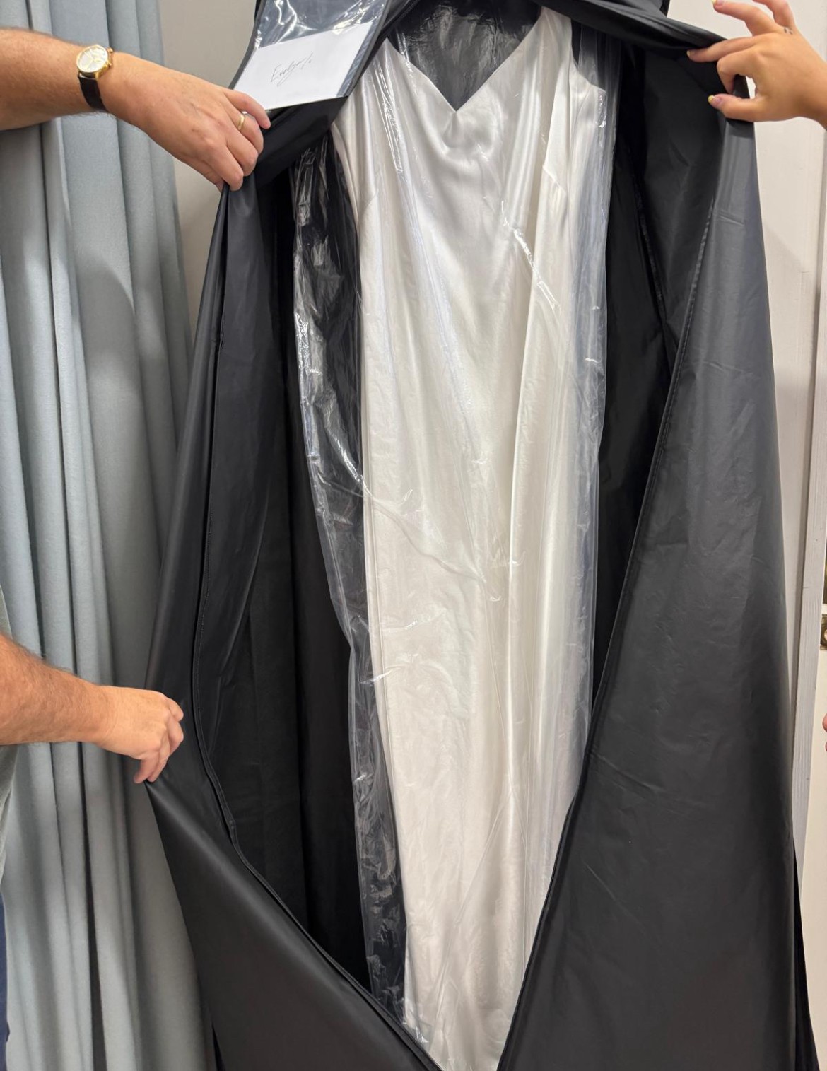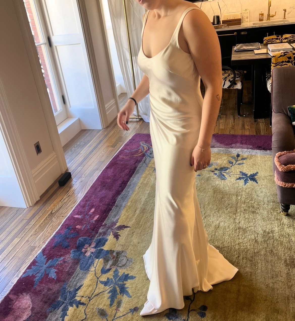Never worn dress. The third photo is me in the sample because I haven't tried on the actual dress.
