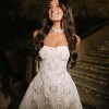 A feminine A-line gown with half circle structured skirt featuring an inner corset bodice made by a layered variety of hand sewn lace applications to create an illusion effect on the body.