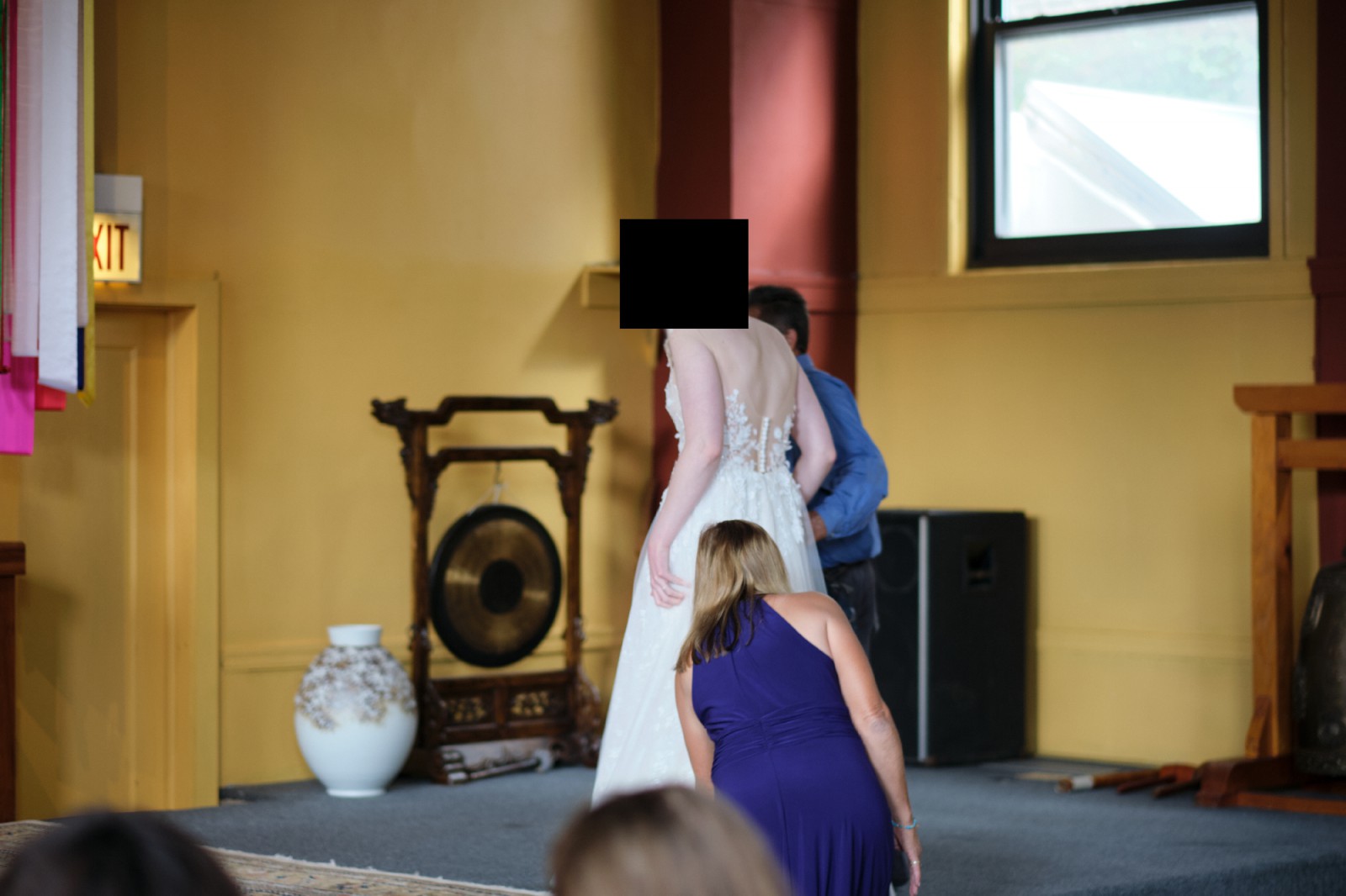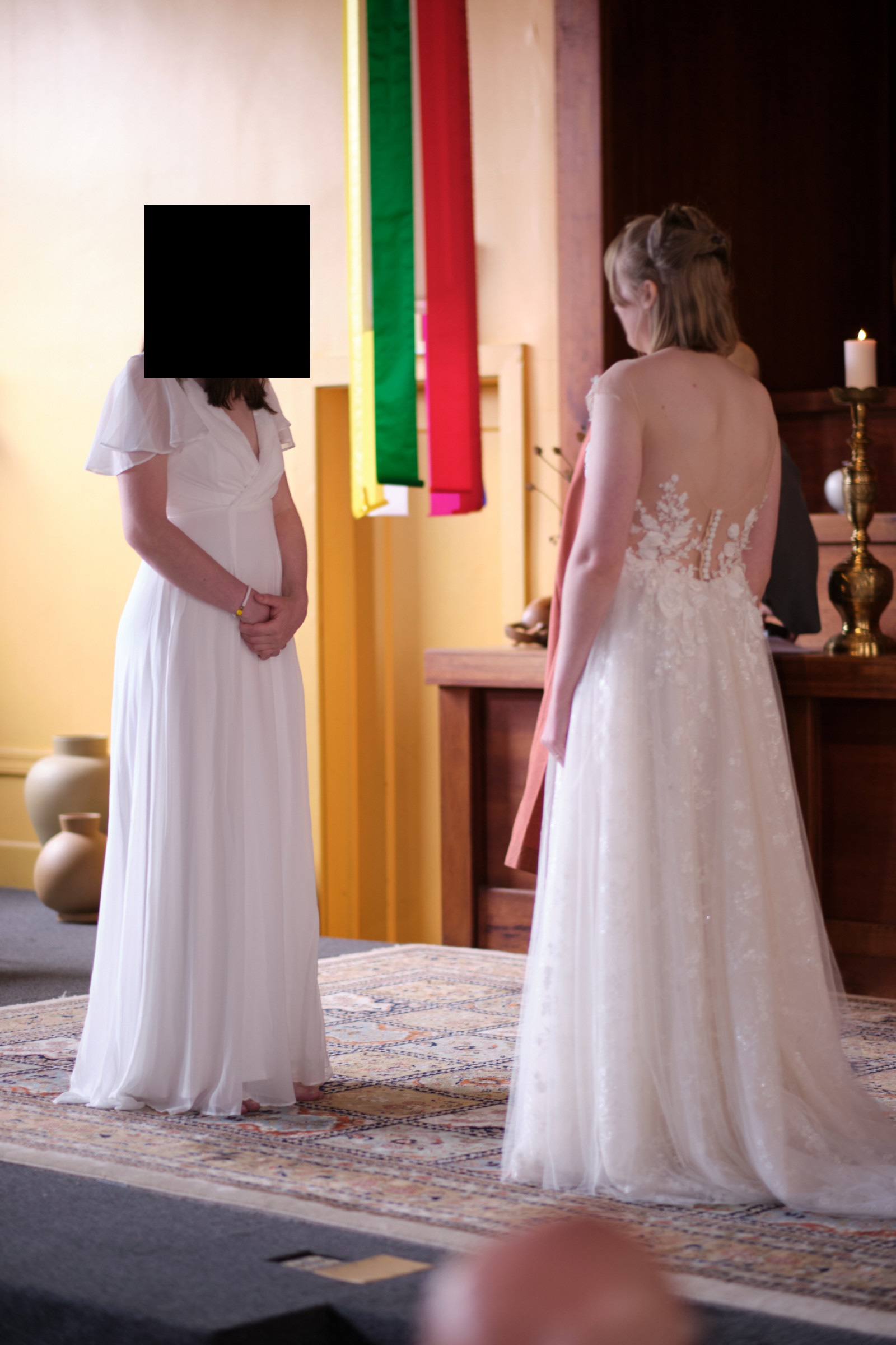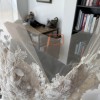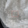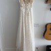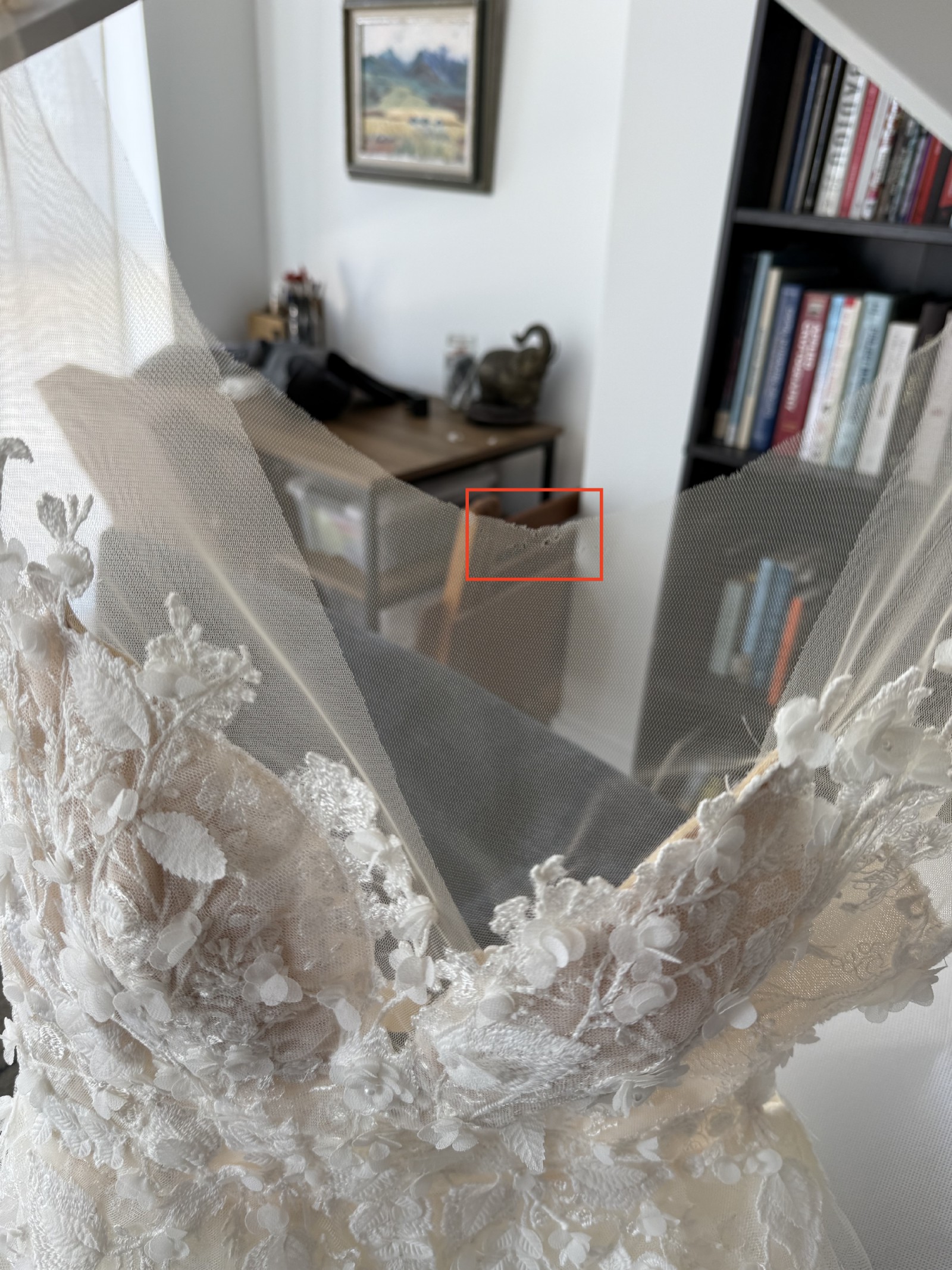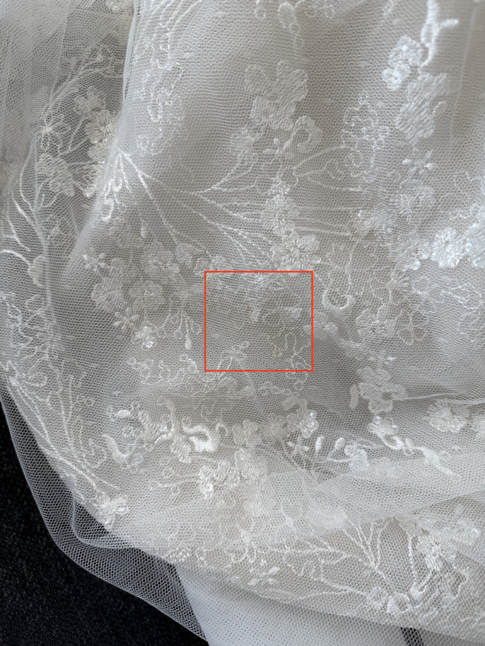 Minor flaws: (1) French lace has minor wear in the top of the front side, see second-to-last photo, and (2) the bottom of the gown has a slight discoloration on one of the flowers, though it is hardly noticeable.