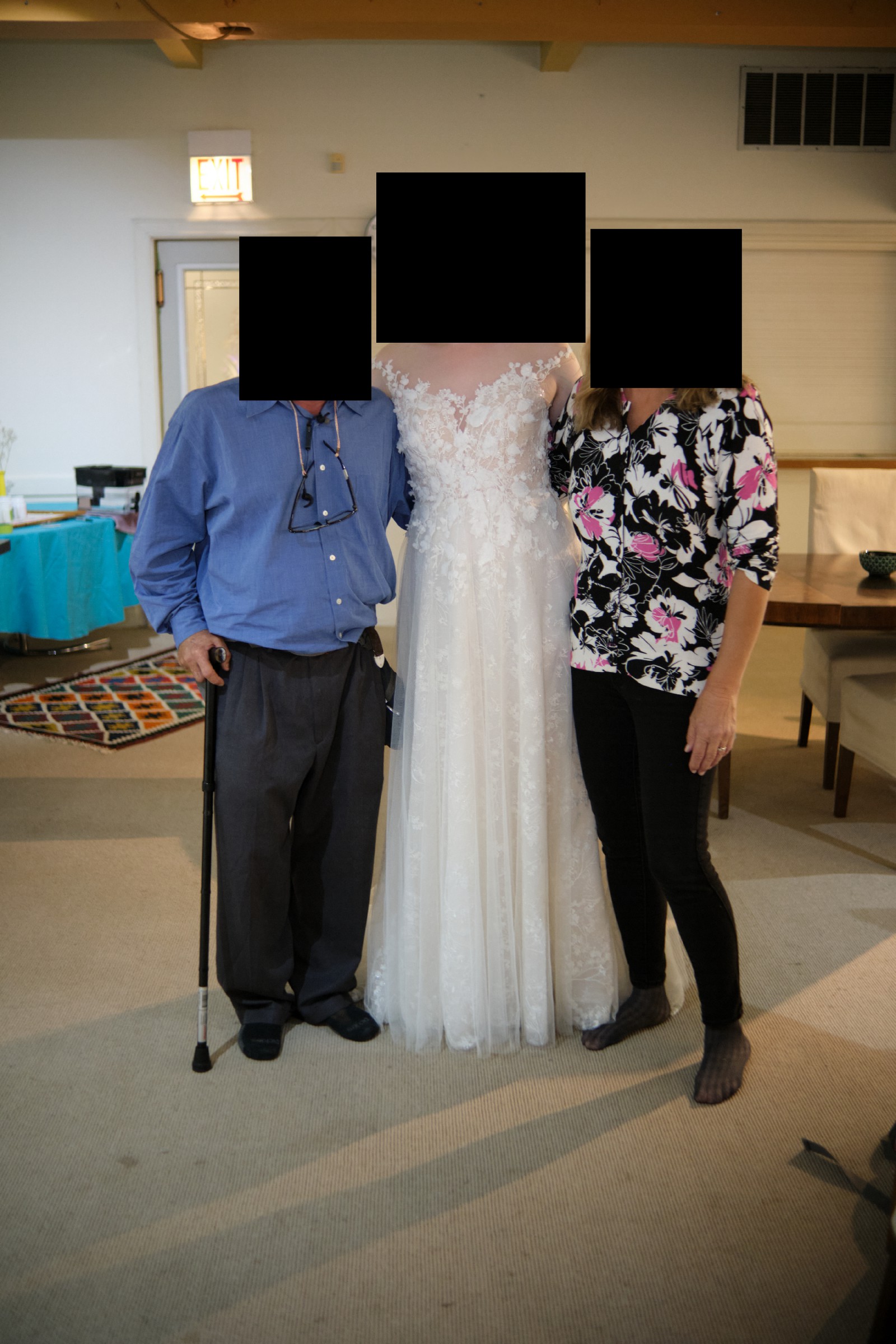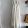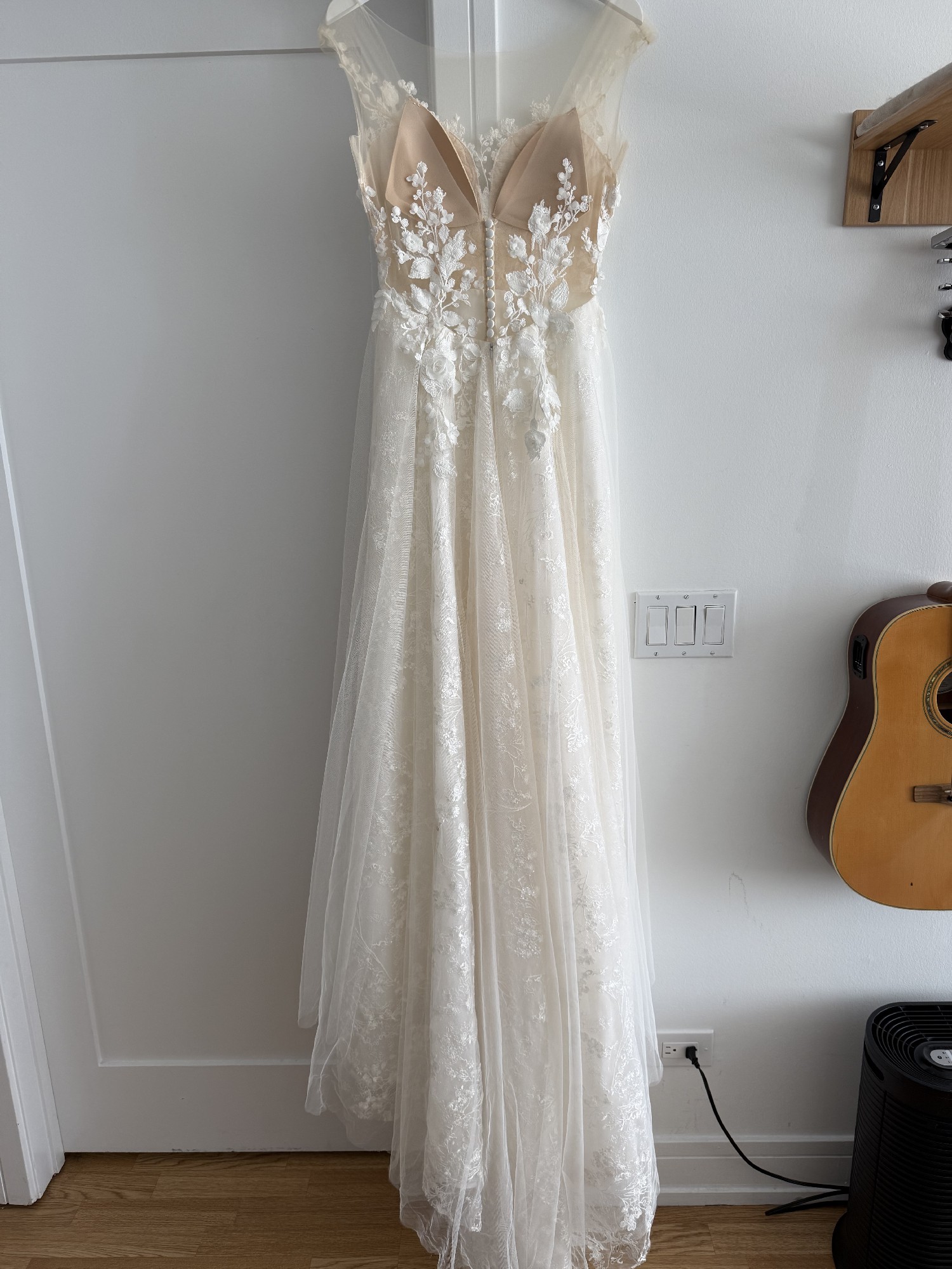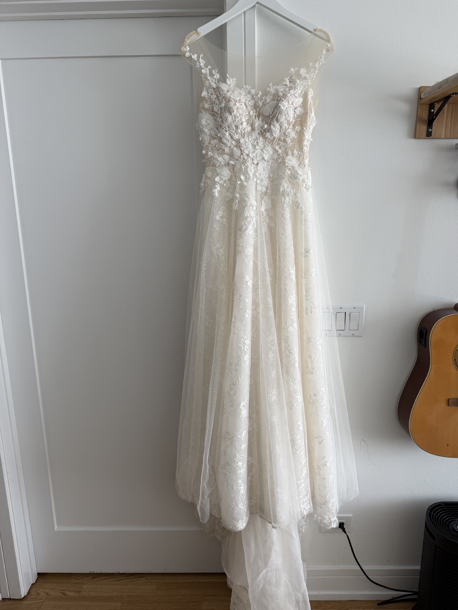 Stunning and elegant A-Line wedding dress that hugs your silhouette. Adorned with 3D flowers, shimmering beads, and crystals. I am beyond pleased with this gown, I couldn't have chosen a more beautiful wedding dress.