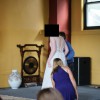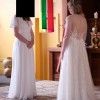Description from designer's website: Long ball gown. Top with invisible neckline made of French lace. Flared skirt made of slightly shiny tulle with a train.
