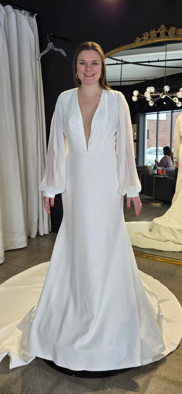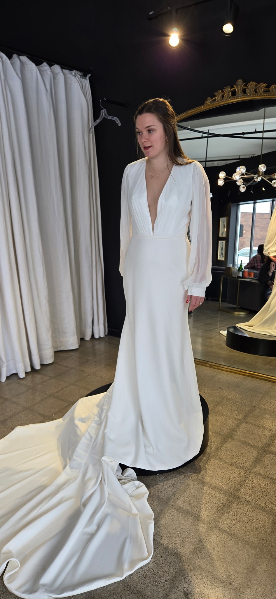 This exquisite Colby John wedding dress redefines elegance with its enchanting fit and flare silhouette. The dress boasts a dreamy V-neckline, elegantly complemented by enchanting long puff sleeves that add a whimsical touch to the overall design. Perfectly crafted for the modern bride, the high back creates a sophisticated and flattering profile while offering support and comfort throughout your special day.
