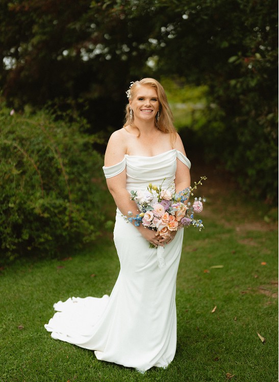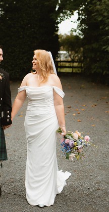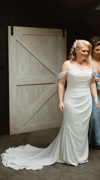A beautiful dress from Jess Couture that was incredible to wear on the day. I tried on so many before I found this one. I loved it because it was so light to wear, hugged my curves and did a great job of hiding my food bloat after dinner. It was so hard to find dresses my size secondhand, so I had to go new. Hoping I can now help a fellow bride!