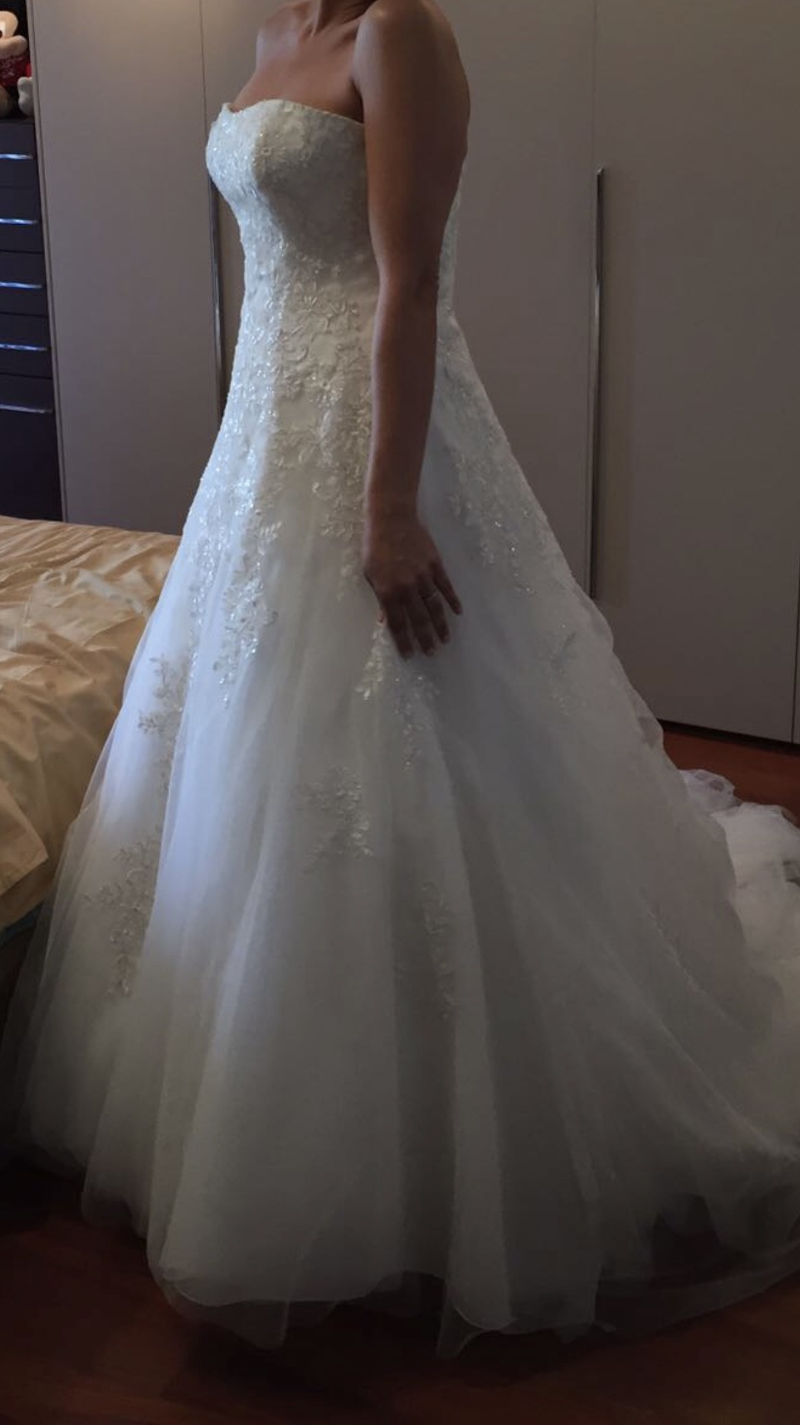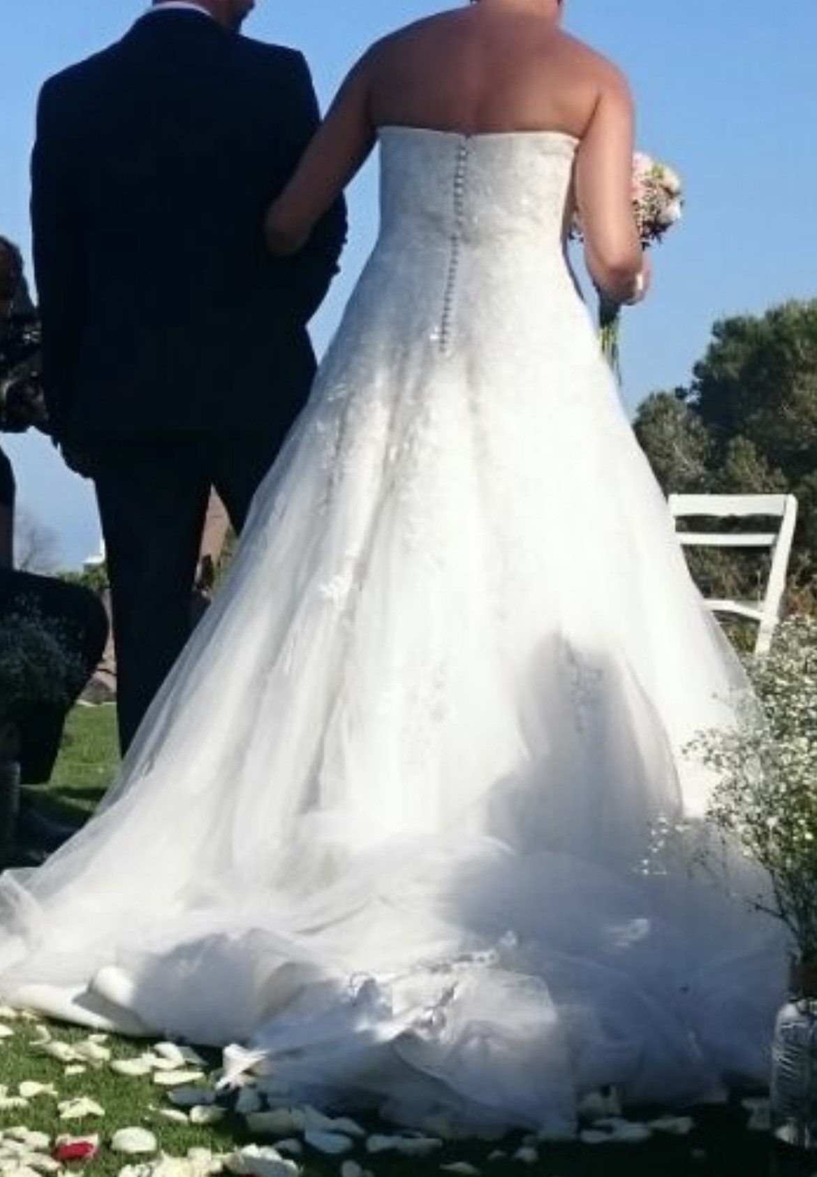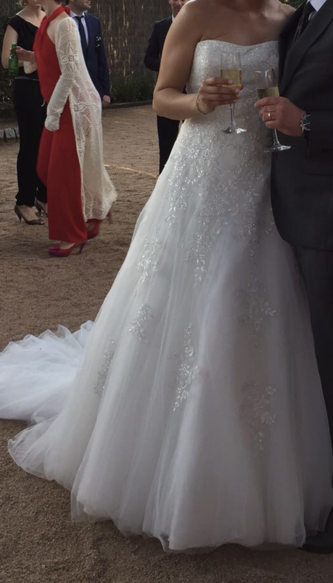 I'm selling a beautiful Aire Barcelona wedding dress, worn only once. Romantic princess style, with a full skirt, fitted bodice, and exquisite details. Dry-cleaned, includes a can-can and original bag. Only a few buttons on the bodice need to be sewn on, which are included. Perfect for a bride who wants to feel like a princess without spending a fortune. 👑