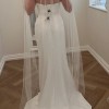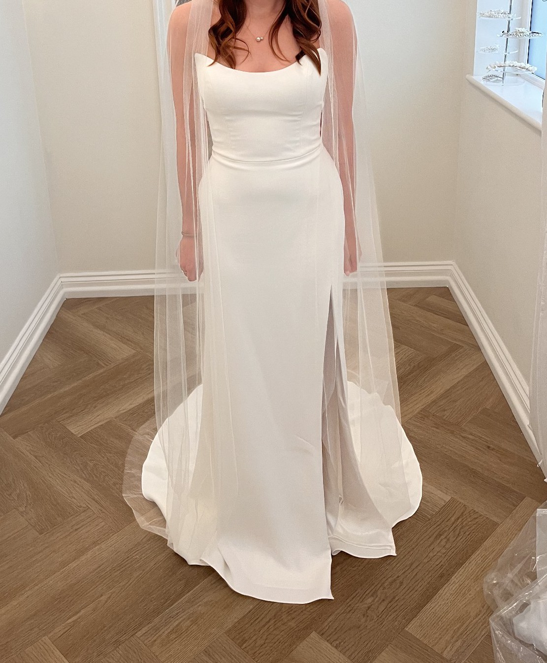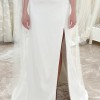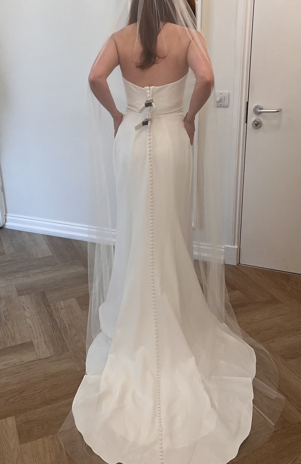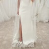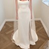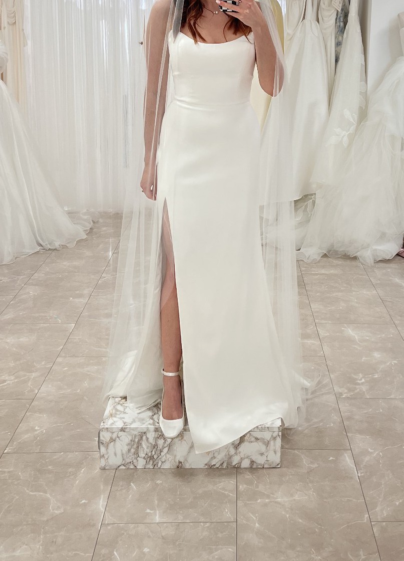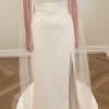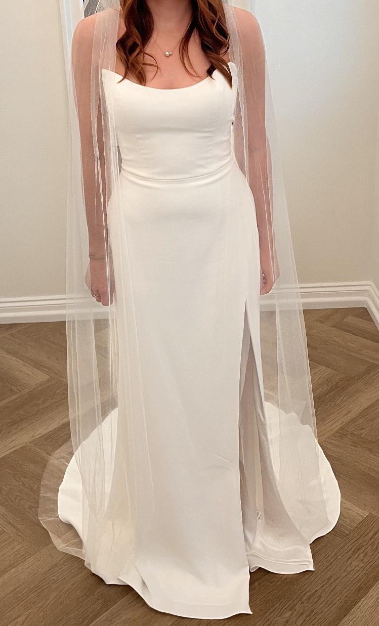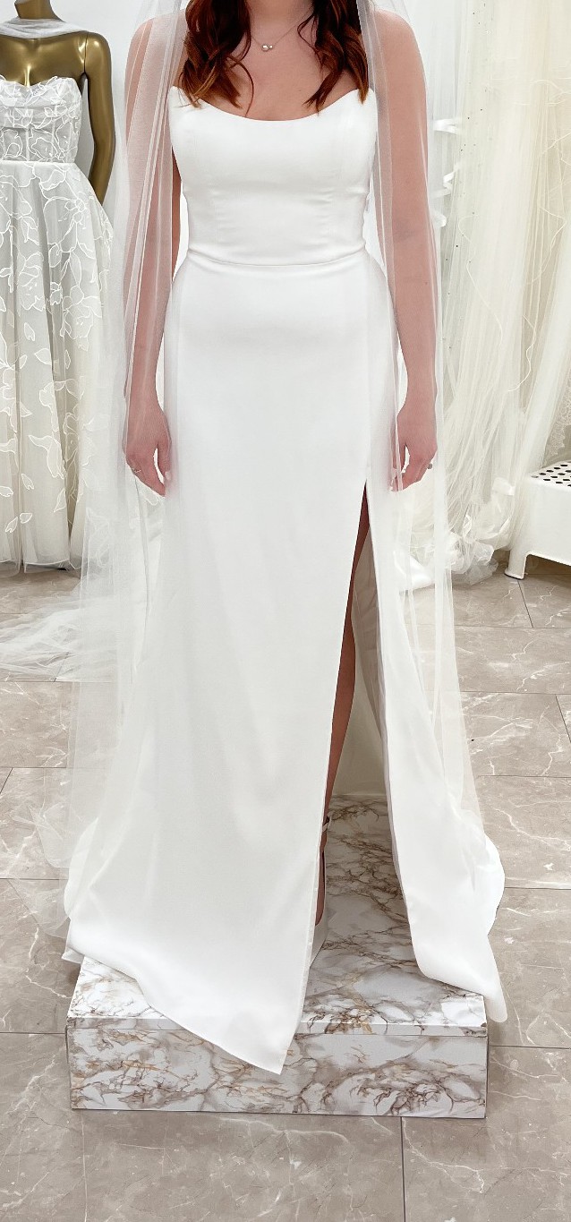 “The Bryant strapless wedding gown takes a modern approach to a timeless bridal silhouette. A beautifully sculpted scoop neck and fully boned bodice effortlessly flatters the décolletage and collarbone, while a daring slit cuts across the slim fit and flare skirt. Covered buttons down to the hem add a classic bridal element.”