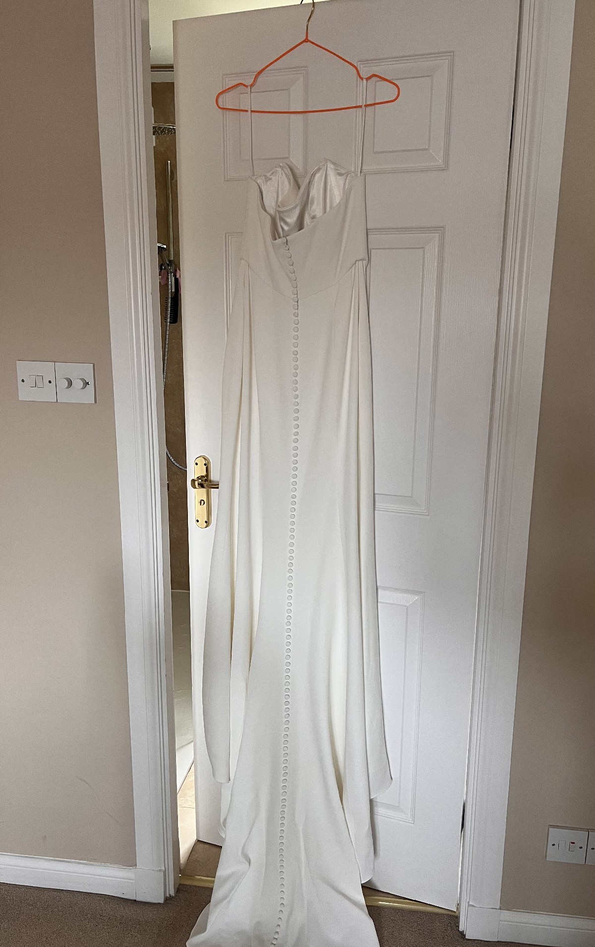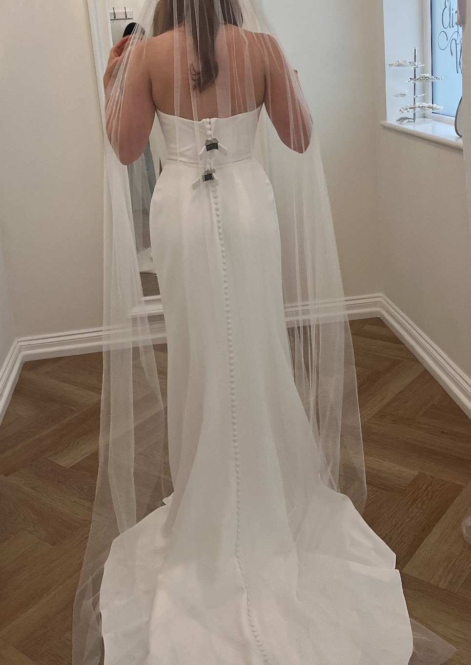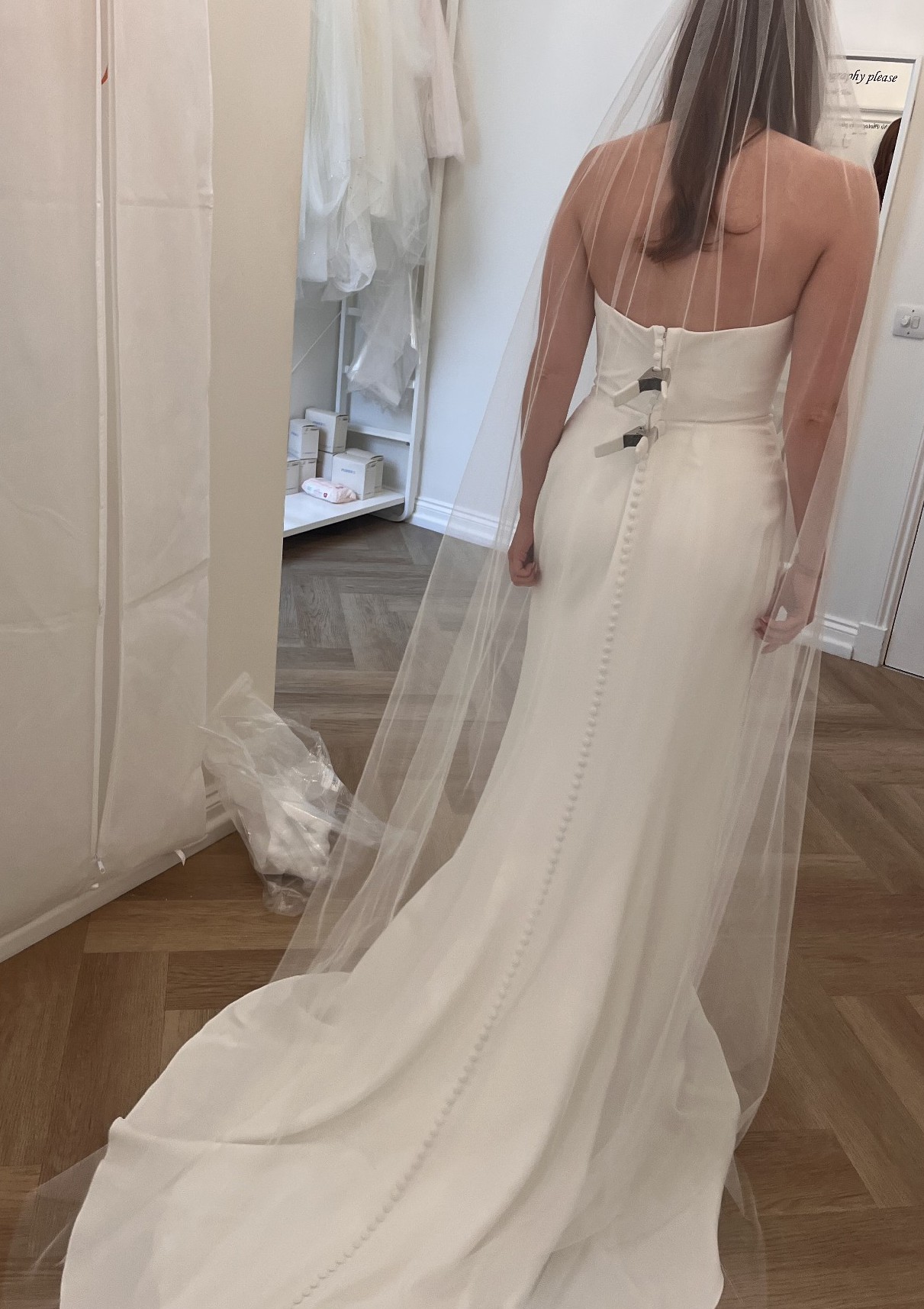 The dress has been tried on twice, tags were removed, but has never been worn properly.