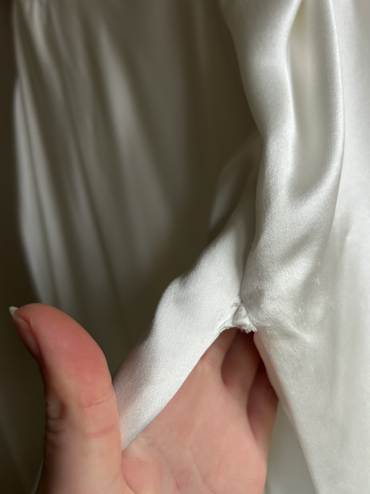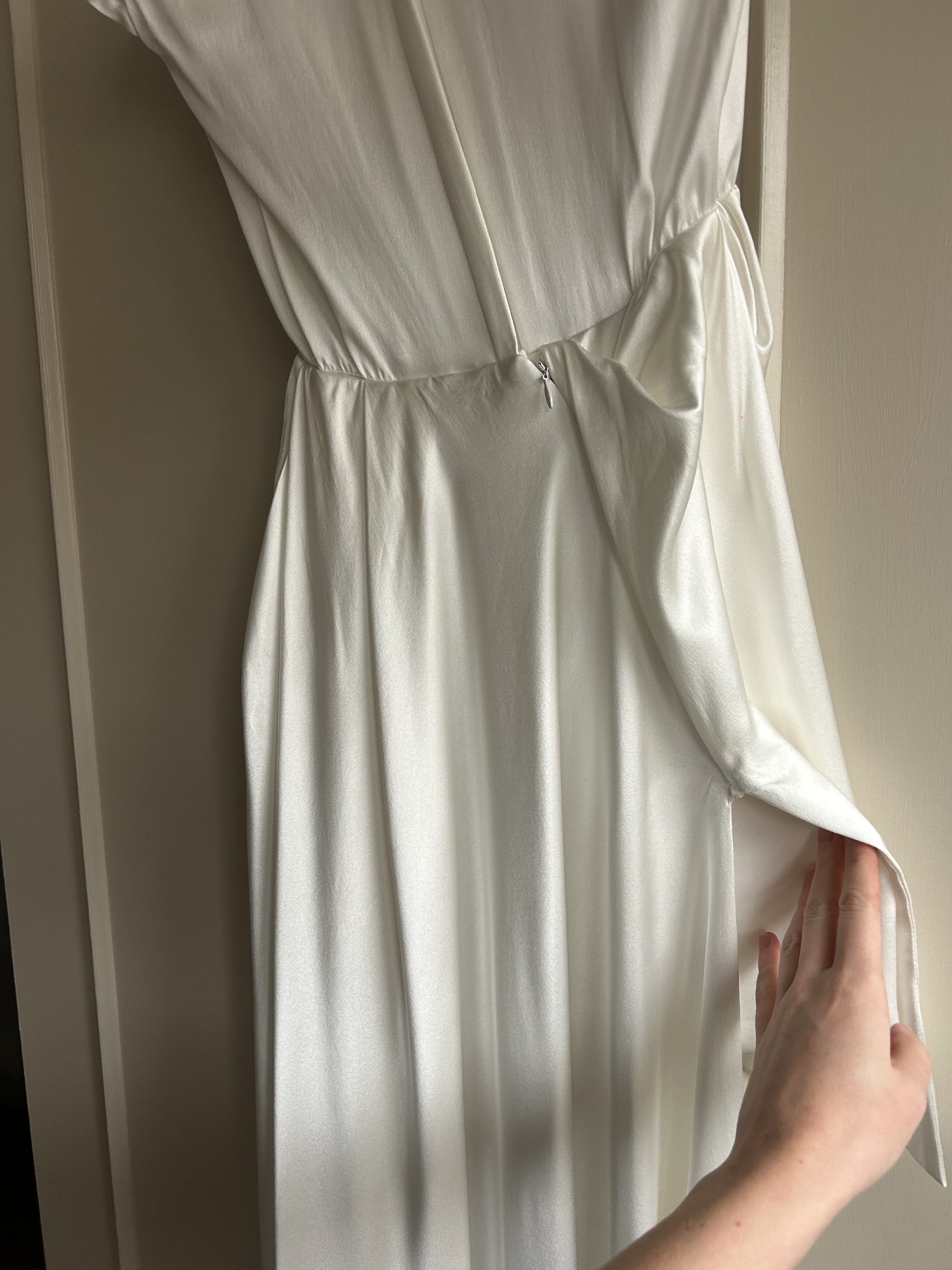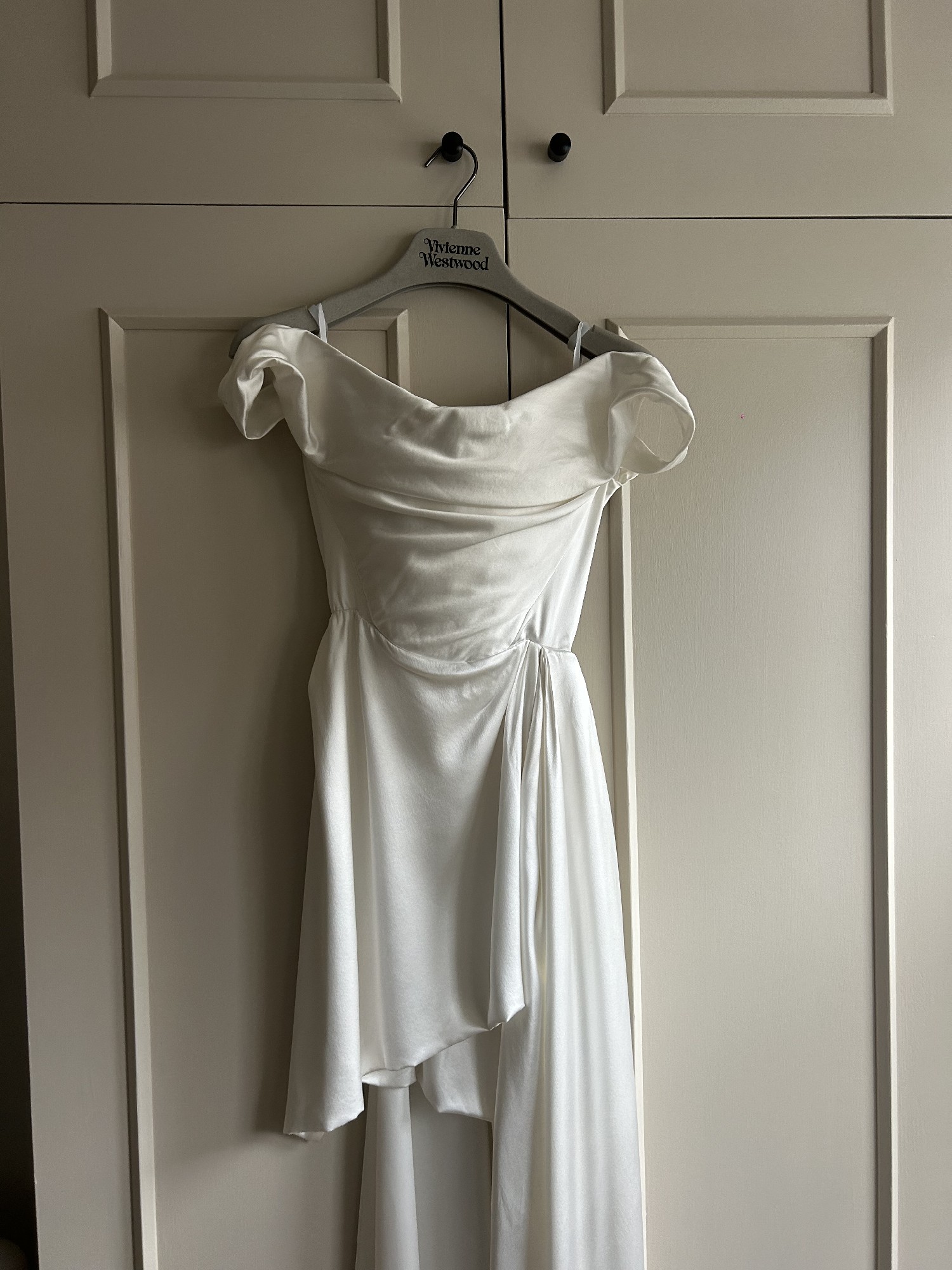 Shipping within UK only. Coming to view the dress in person in London is an option. Ideal for a bride on a tight turnaround (there is a 8 month + lead time). Selling my unaltered Vivienne Westwood Comet in Heavy Silk Satin. The rounded regal neckline of the Comet sweeps across the shoulders and cinches the waist, developed from the classic Vivienne Westwood Bagatelle style. The Comet is finished with an asymmetric skirt, the silhouette is almost toga-like with a cascading train, which can be bustled up or worn over the shoulders and styled with a belt – completely transforming the look. Purchased from Vivienne Westwood in summer 2024 and worn for my wedding in August 2025. It is in excellent condition and it comes with the original Vivienne Westwood packaging, including garment bag, carrier bag, tags and branded hanger. Size and alterations: Size 10. I recommend reviewing the size chart on the Vivienne Westwood website. There have been no alterations to the dress Condition: Worn once for a few hours at my wedding. The gown has been professionally dry cleaned by Vivienne Westwood recommended cleaners Elias at a cost of £400. It is in great condition, with a couple of minor imperfections as pictured; loop for the hook at the back has snapped, and small amount of fraying at corner of skirt. Please feel free to message me if you have any questions or would like more photos of the dress.