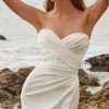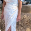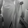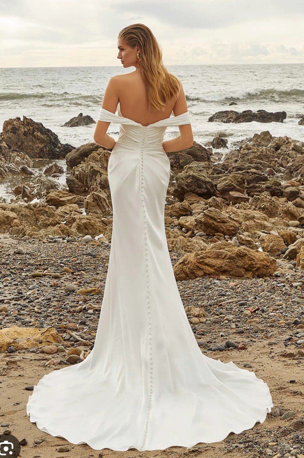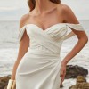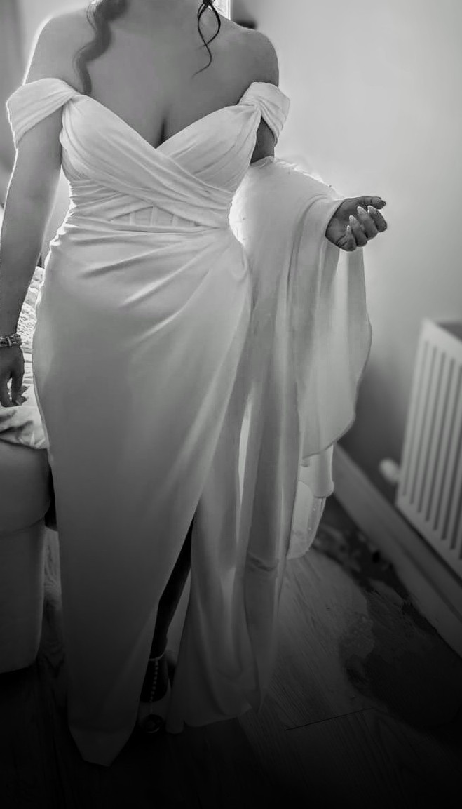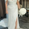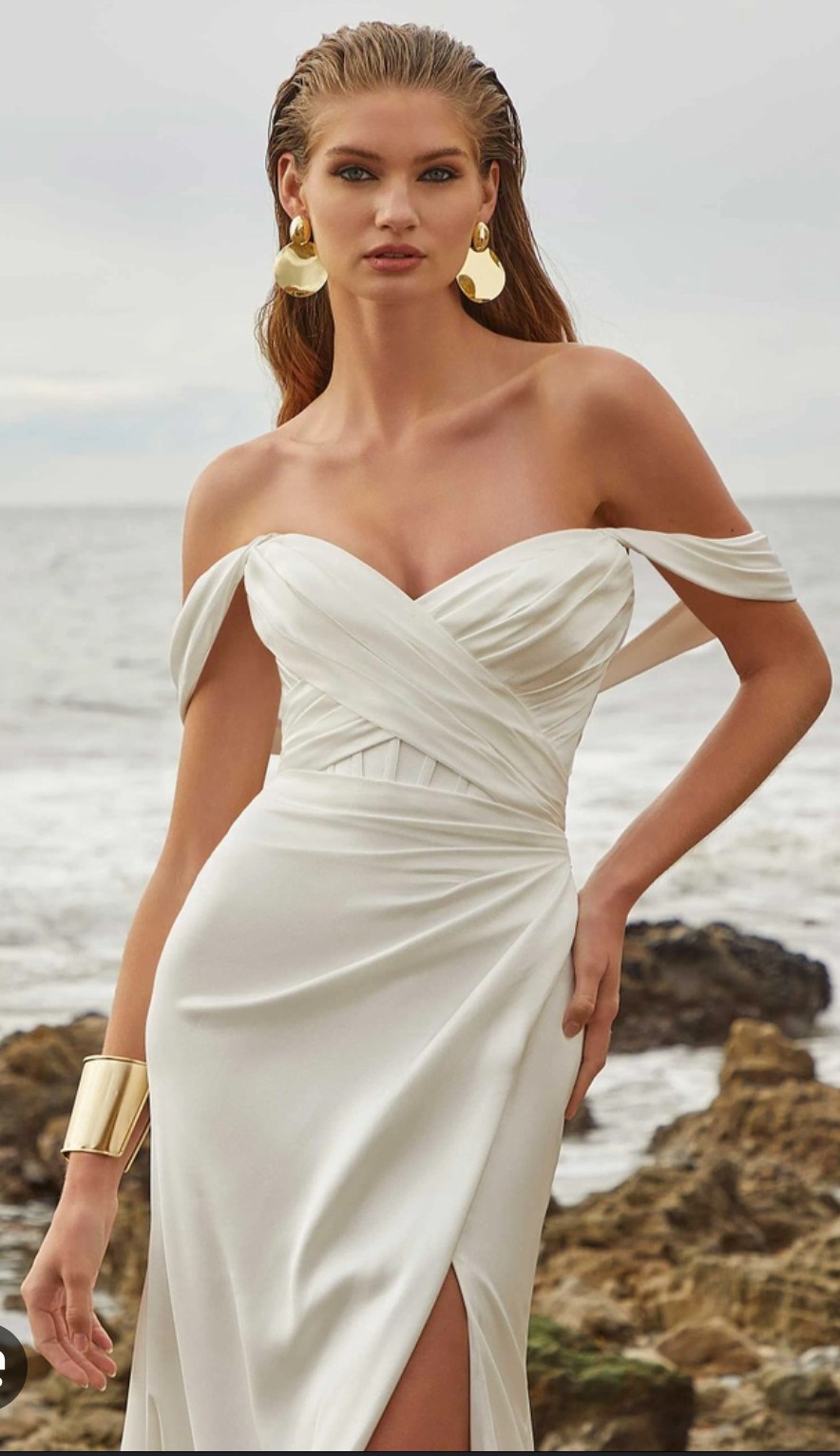 What truly sets this dress apart are the detachable sleeves and high slit, allowing you to switch up your style effortlessly between the ceremony and reception. The floor-length design adds a dramatic flair as you glide down the aisle, capturing the attention of everyone around.
