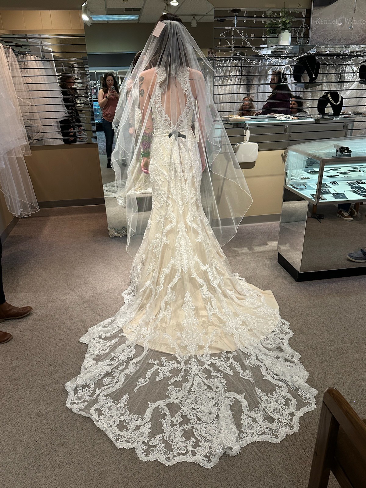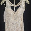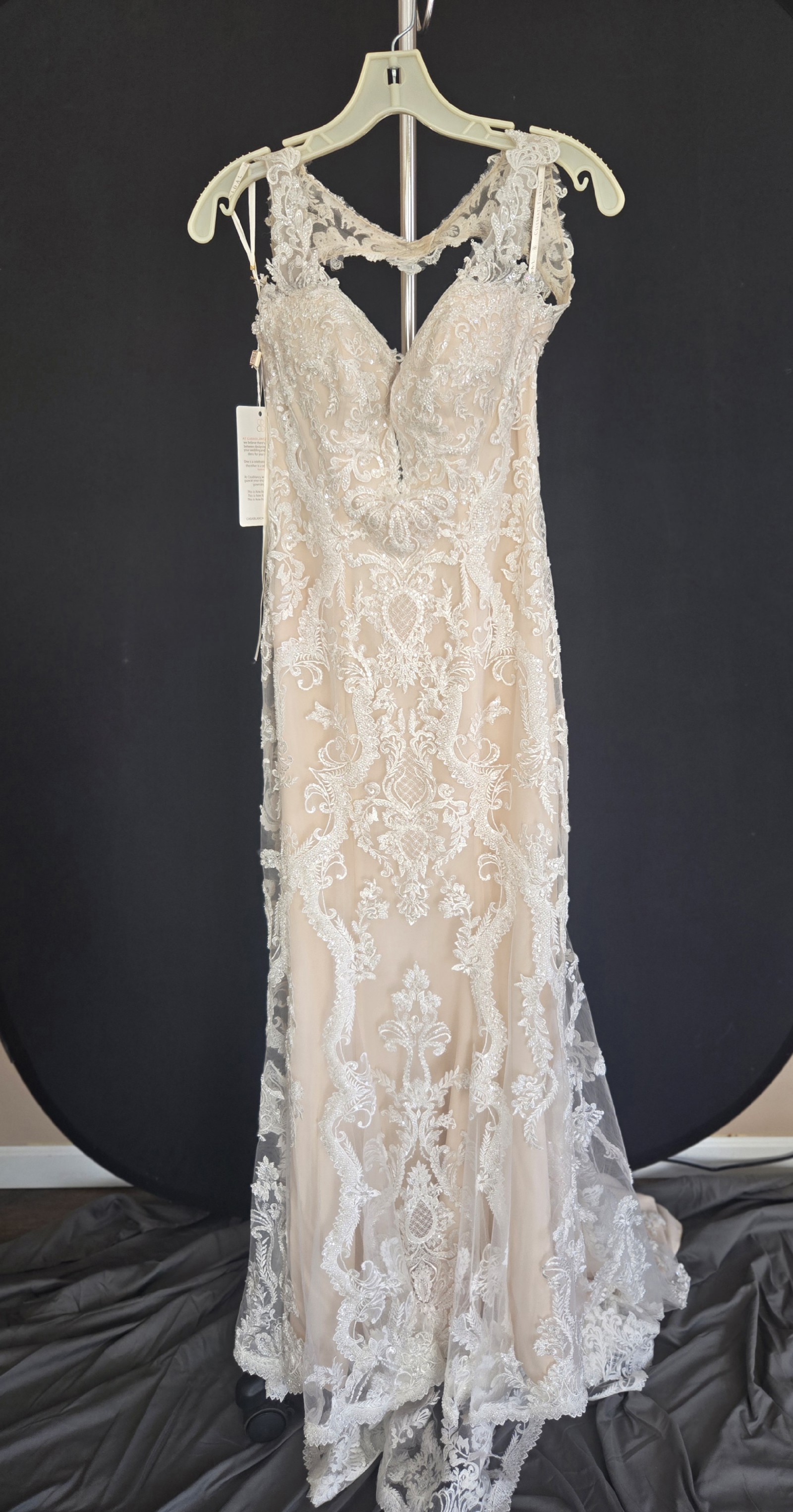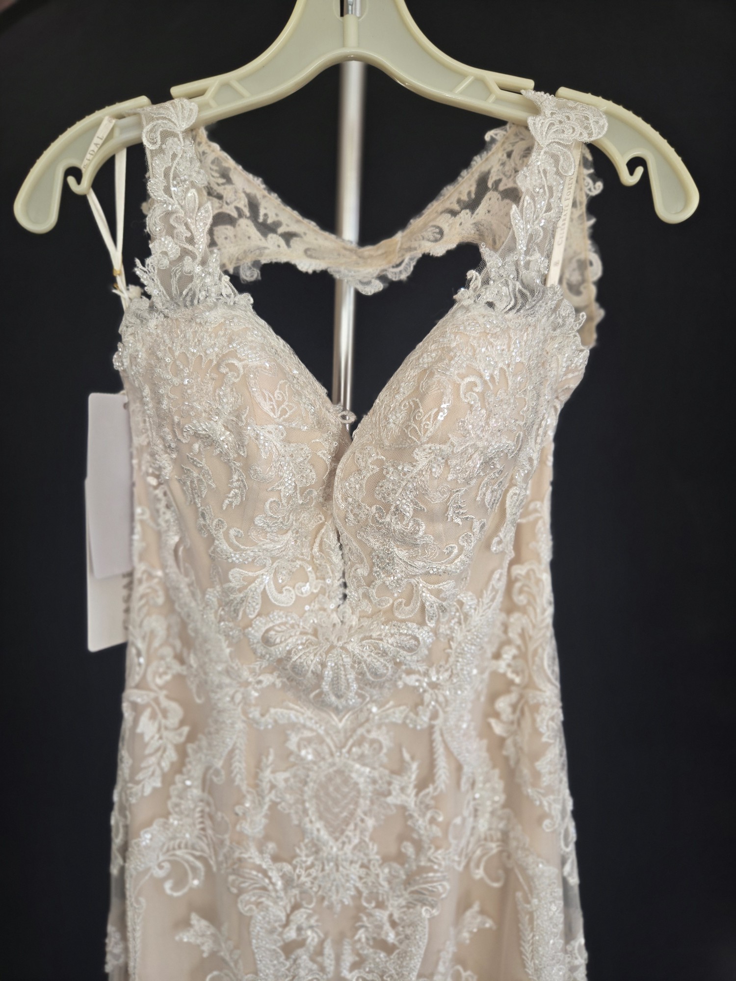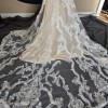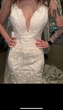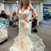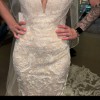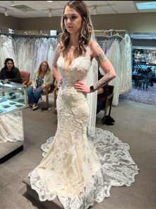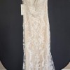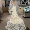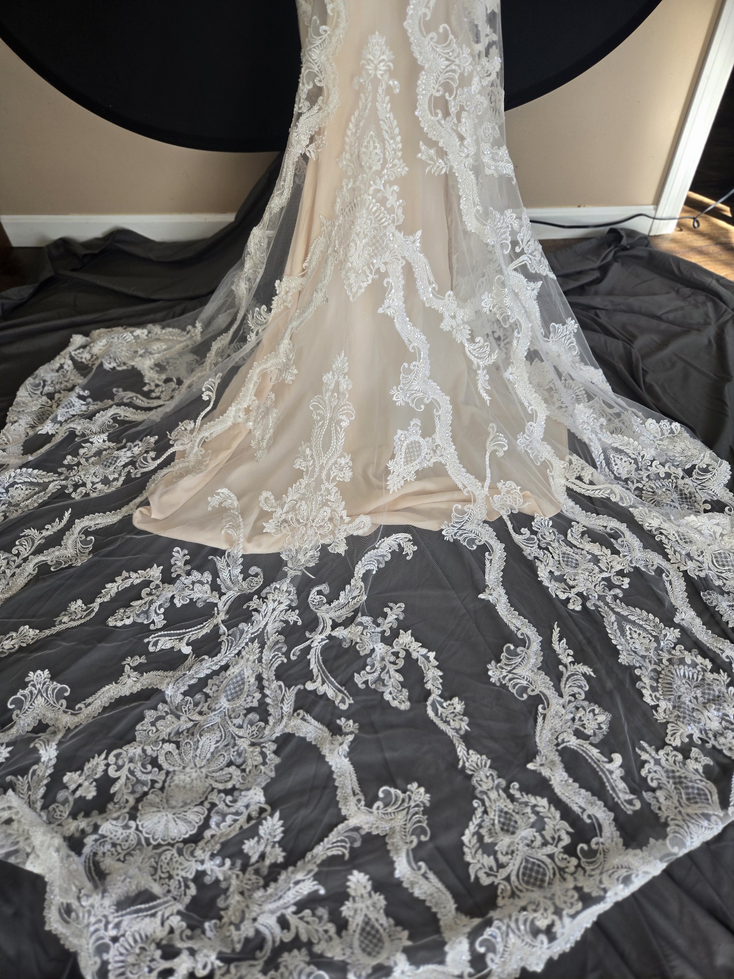 Beautiful lace and chiffon fit and flare silhouette wedding dress. It features a flattering plunging neckline and keyhole back. It has an 82 inch train.