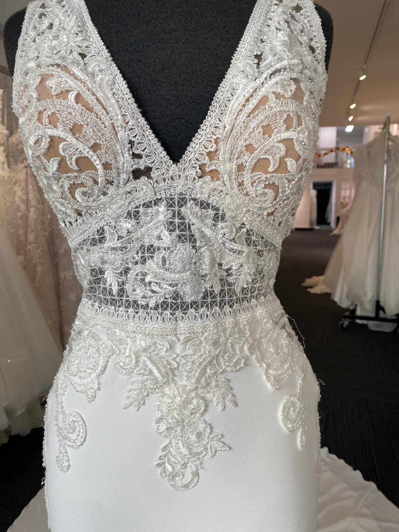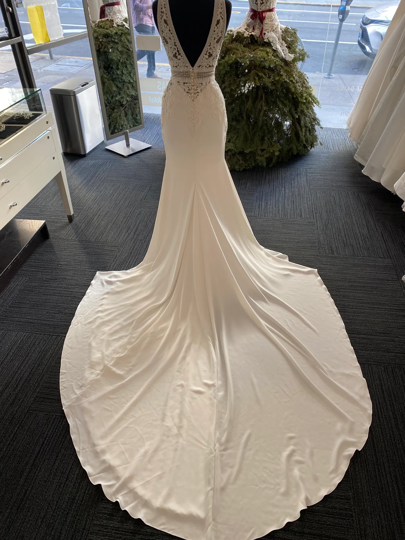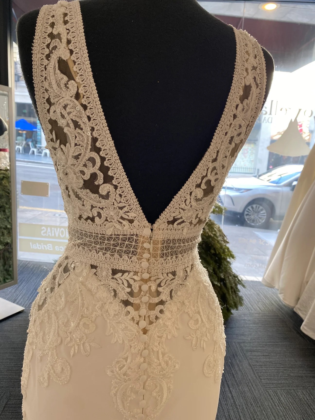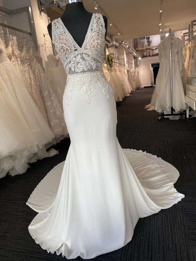 This wedding dress is the Emily style by Pronovias from the 2019 collection. It has not been professionally cleaned and is unaltered- the hanger straps are cut, though. It does not affect the dress, but I want to be transparent! I would describe it as a Bling, Boho, Elegant wedding dress featuring Amazing Back Details, Beading, a Fit-And-Flare silhouette, and a V-neck / Plunging neckline. Dress comes with a brand new travel dress bag from Amazon.