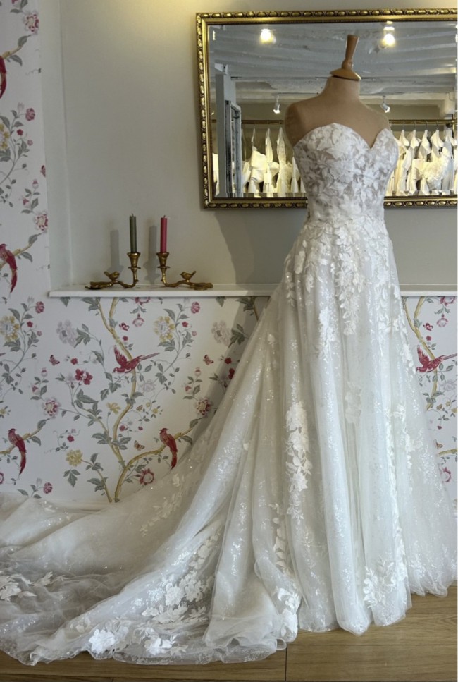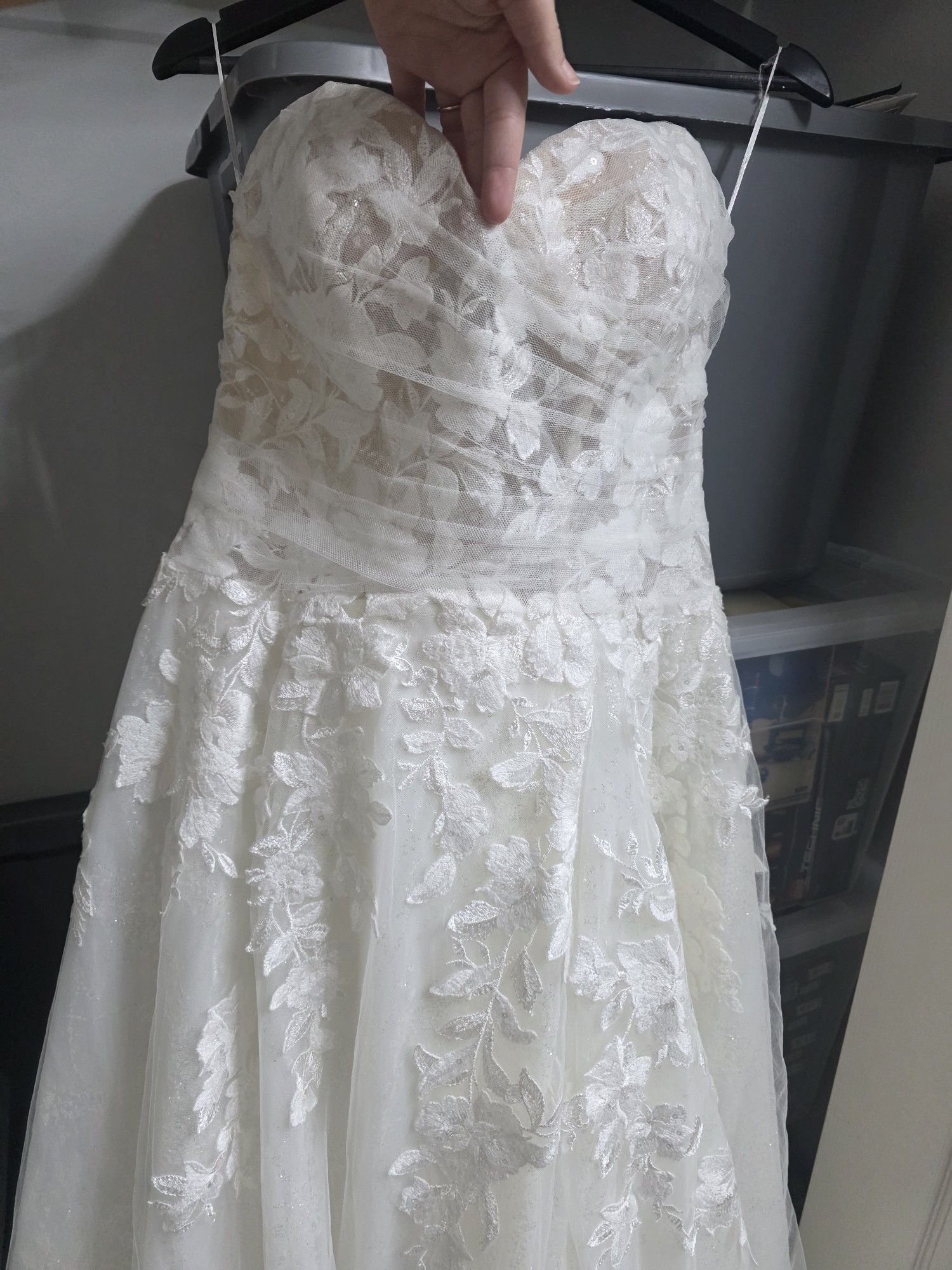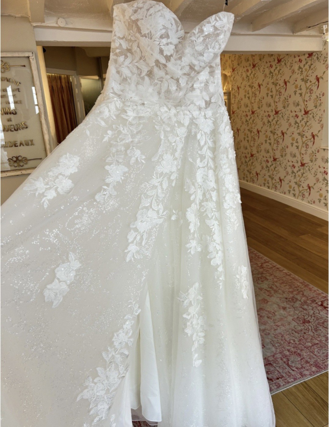Elegant Josephine Scott A-Line wedding dress. It has never been worn and is an altered sample. This features a timeless,strapless, sweetheart neckline, delicate floral lace applique, and stunning sparkle- infused tulle overlay that catches light beautifully. It is completed with a dramatic chapel-length train. I bought this from someone else on StillWhite and photos at the end are ones I took personally. The dress is in amazing shape still. It was originally bought in December 2024 as a sample gown and has been altered to 5'4". It comes with a storage bag and has stayed safely stored inside.