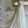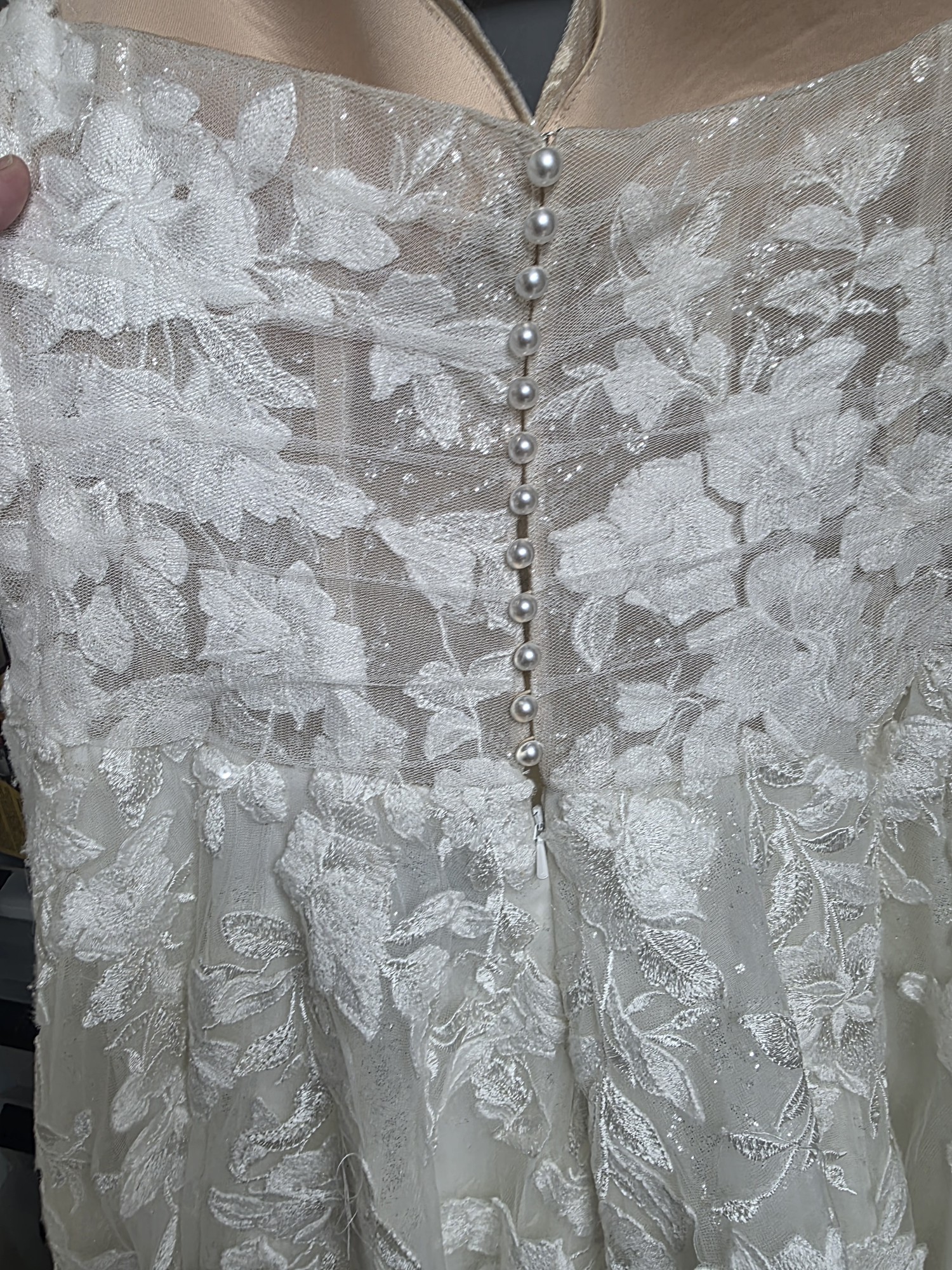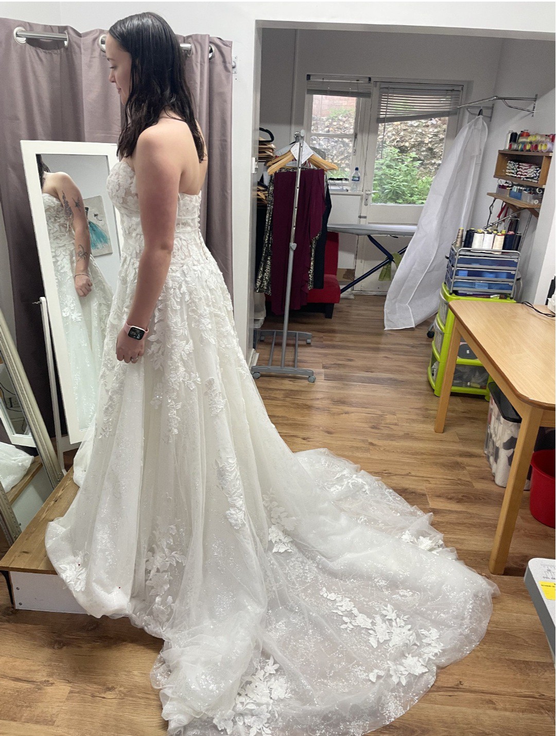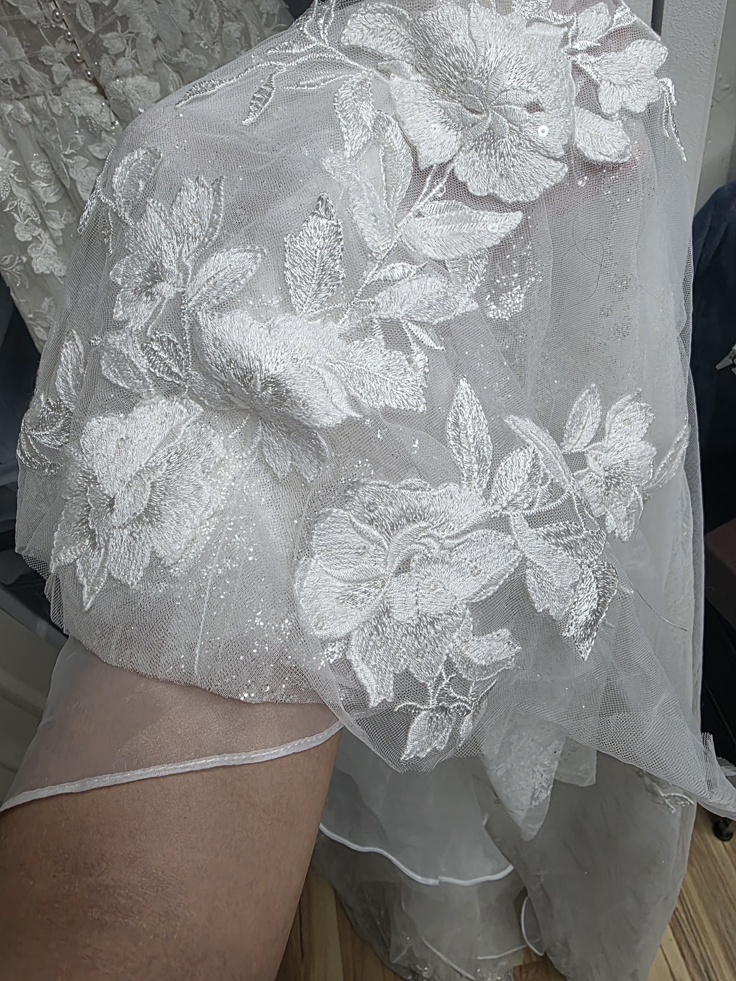 Elegant Josephine Scott A-Line wedding dress. It has never been worn and is an altered sample. This features a timeless,strapless, sweetheart neckline, delicate floral lace applique, and stunning sparkle- infused tulle overlay that catches light beautifully. It is completed with a dramatic chapel-length train. I bought this from someone else on StillWhite and photos at the end are ones I took personally. The dress is in amazing shape still. It was originally bought in December 2024 as a sample gown and has been altered to 5'4". It comes with a storage bag and has stayed safely stored inside.