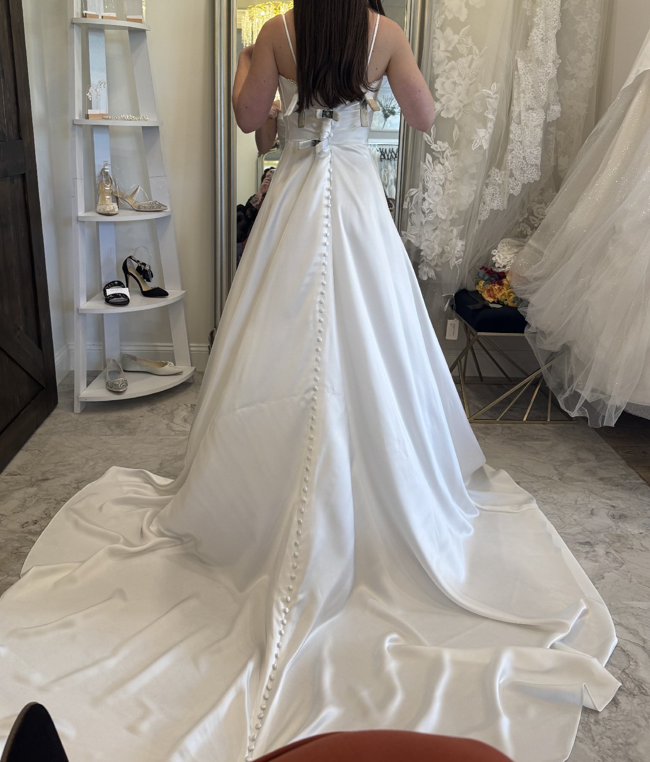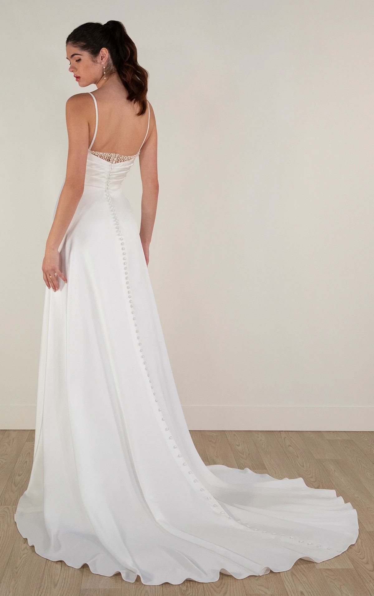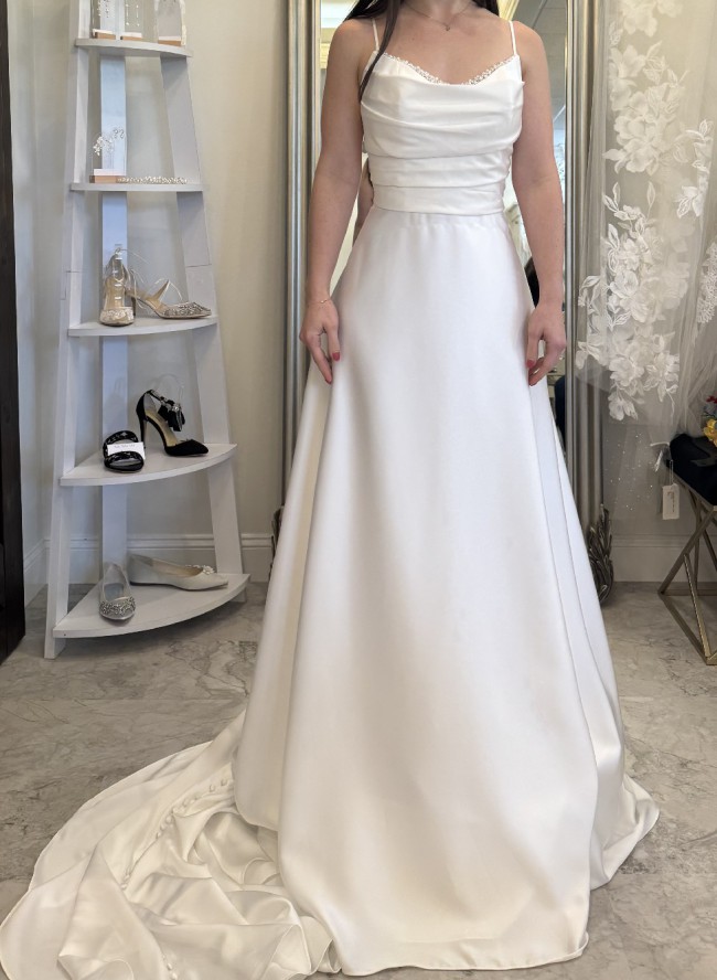 Description from website : Style 7915 radiates majestic splendor fit for the modern-day princess. This pearl-embellished wedding dress features an A-line silhouette in a lustrous, high shine satin. Delicate spaghetti straps complement a softly draped scoop neckline accented by graceful pearl strands for a subtle yet opulent touch. The royal and refined aesthetic hugs the torso in an impeccably tailored fit, complemented by a pearl back detail and full-length row of fabric-covered buttons down the back. Timeless and elegant, this princess wedding gown promises an unforgettable wedding day look.