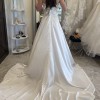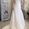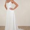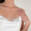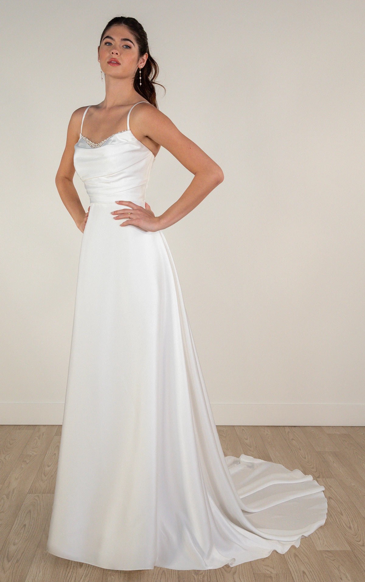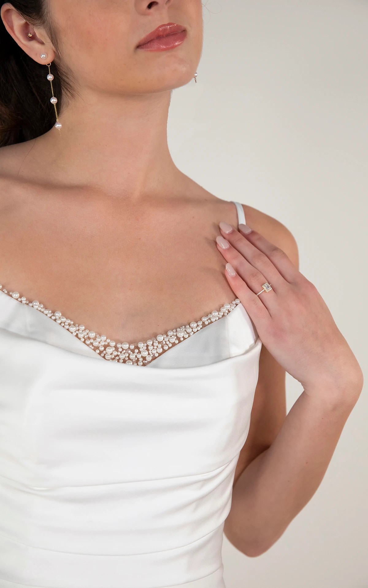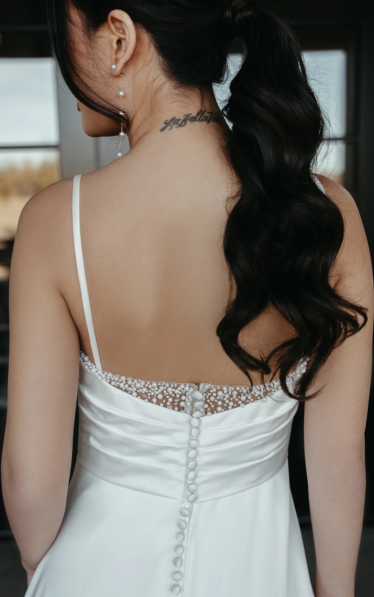 Description from website : Style 7915 radiates majestic splendor fit for the modern-day princess. This pearl-embellished wedding dress features an A-line silhouette in a lustrous, high shine satin. Delicate spaghetti straps complement a softly draped scoop neckline accented by graceful pearl strands for a subtle yet opulent touch. The royal and refined aesthetic hugs the torso in an impeccably tailored fit, complemented by a pearl back detail and full-length row of fabric-covered buttons down the back. Timeless and elegant, this princess wedding gown promises an unforgettable wedding day look.