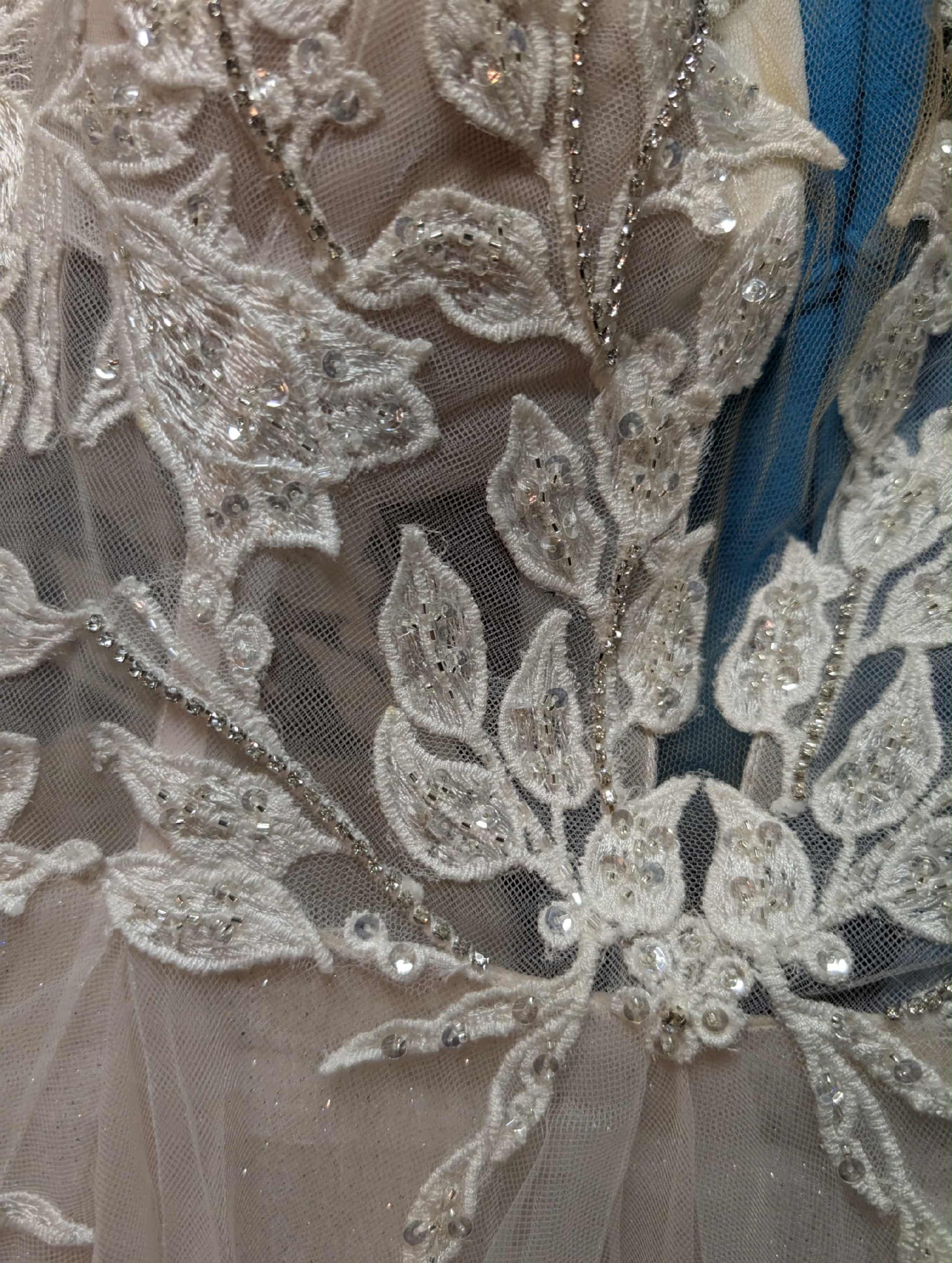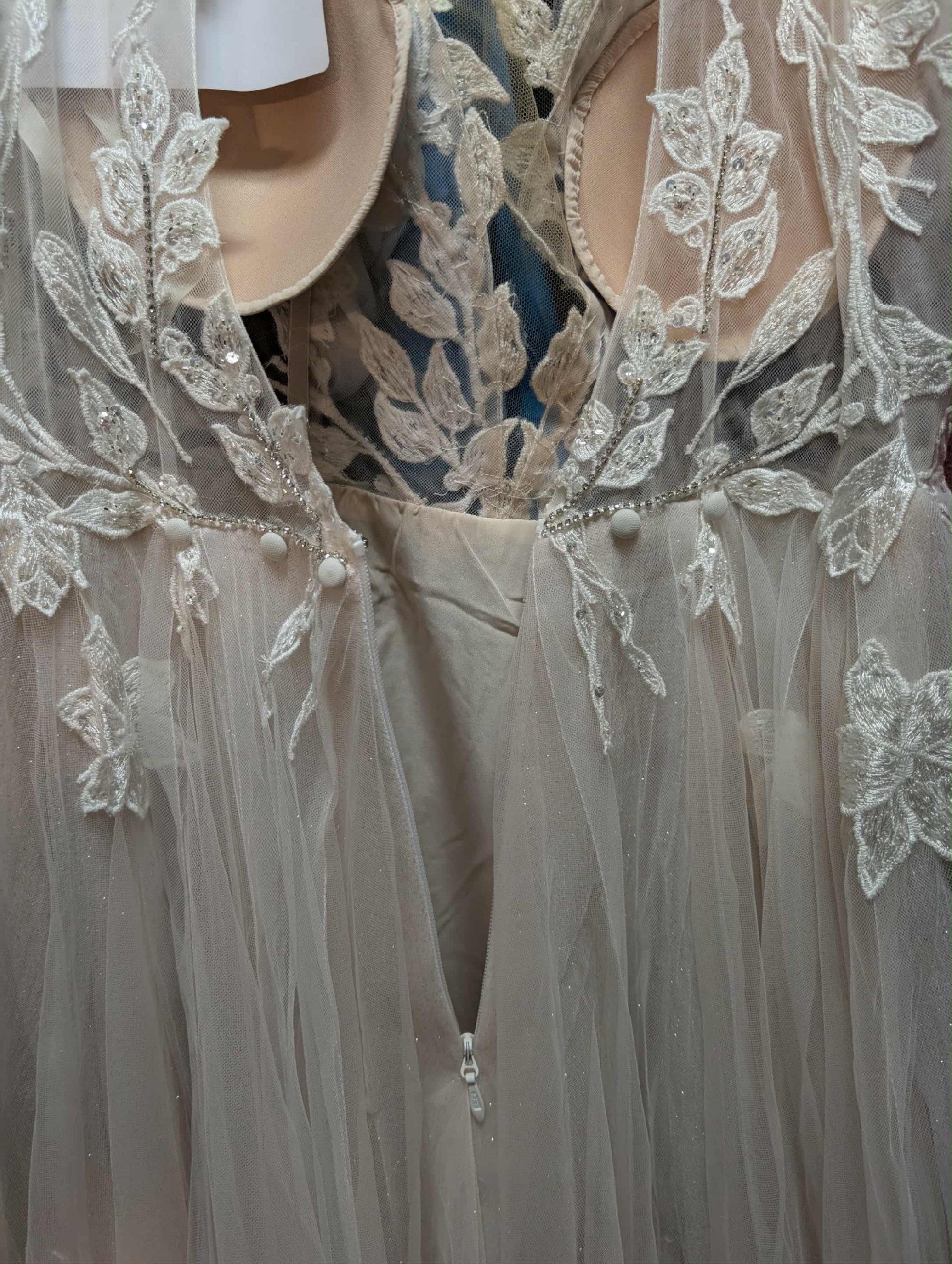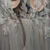 The V-Neck design enhances the illusion plunge, adding a touch of romance, while the delicate lace appliques and twinkling crystals catch the light beautifully, making you feel like a true queen. The unique keyhole back reveals just the right amount of skin, and the capped sleeves add a classic charm that complements the dreamy ivory fabric.