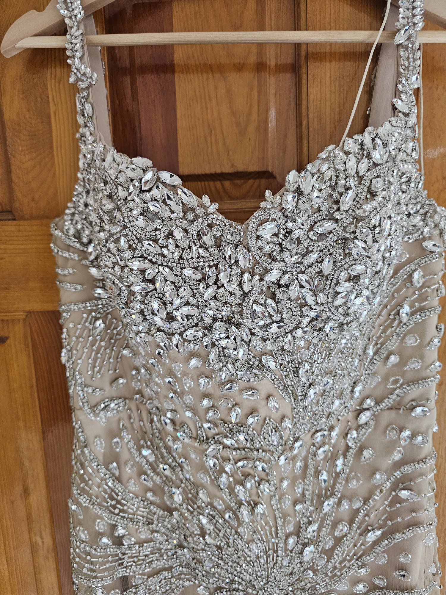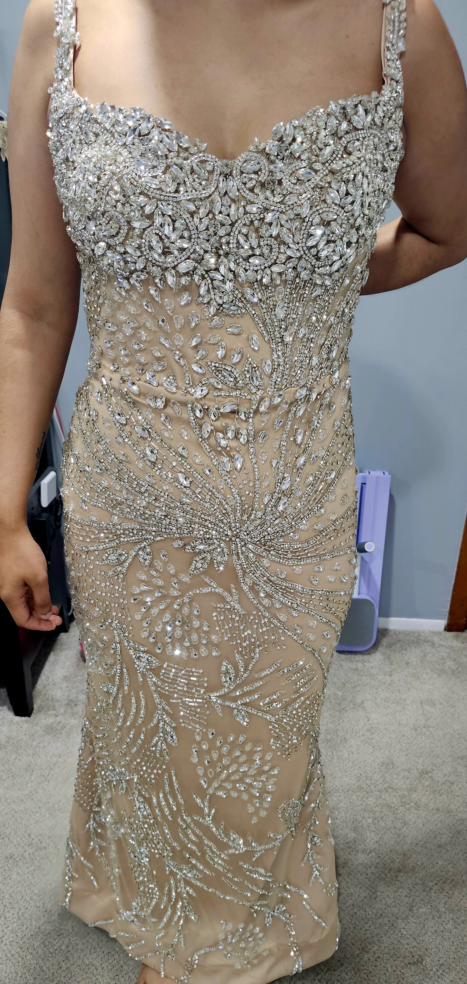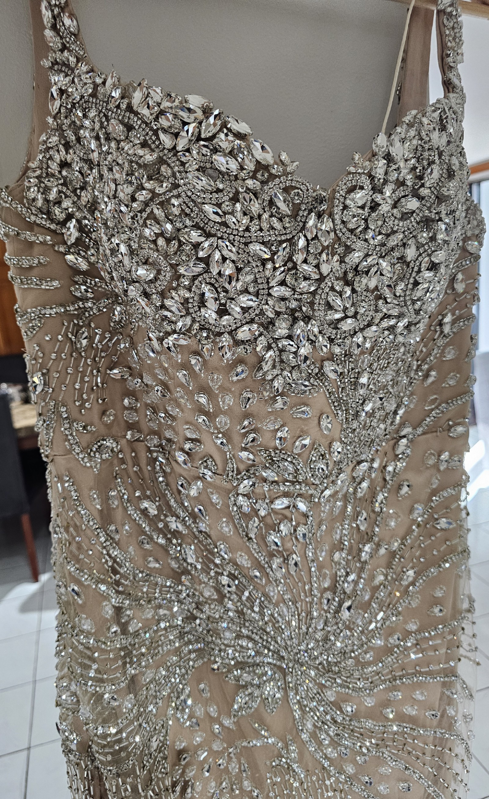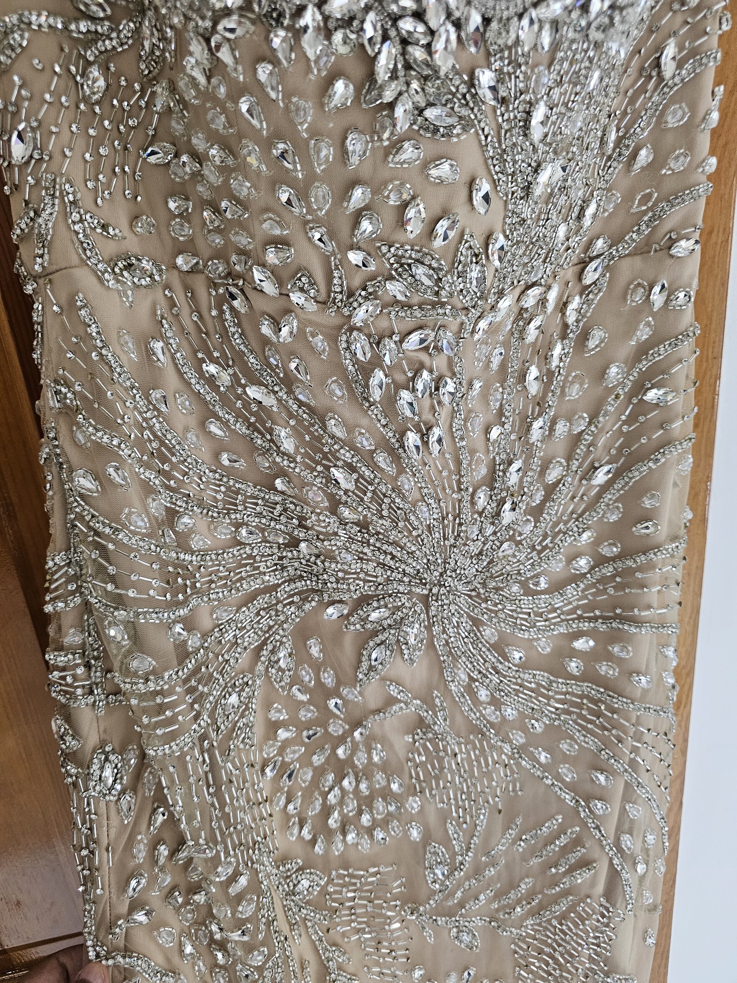 Adorned with exquisite beading, sparkling crystals, and shimmering sequins, this floor-length gown catches the light beautifully, creating a breathtaking effect that you'll love in every photograph. The intricate details truly elevate this dress, transforming it from a mere garment into a work of art.