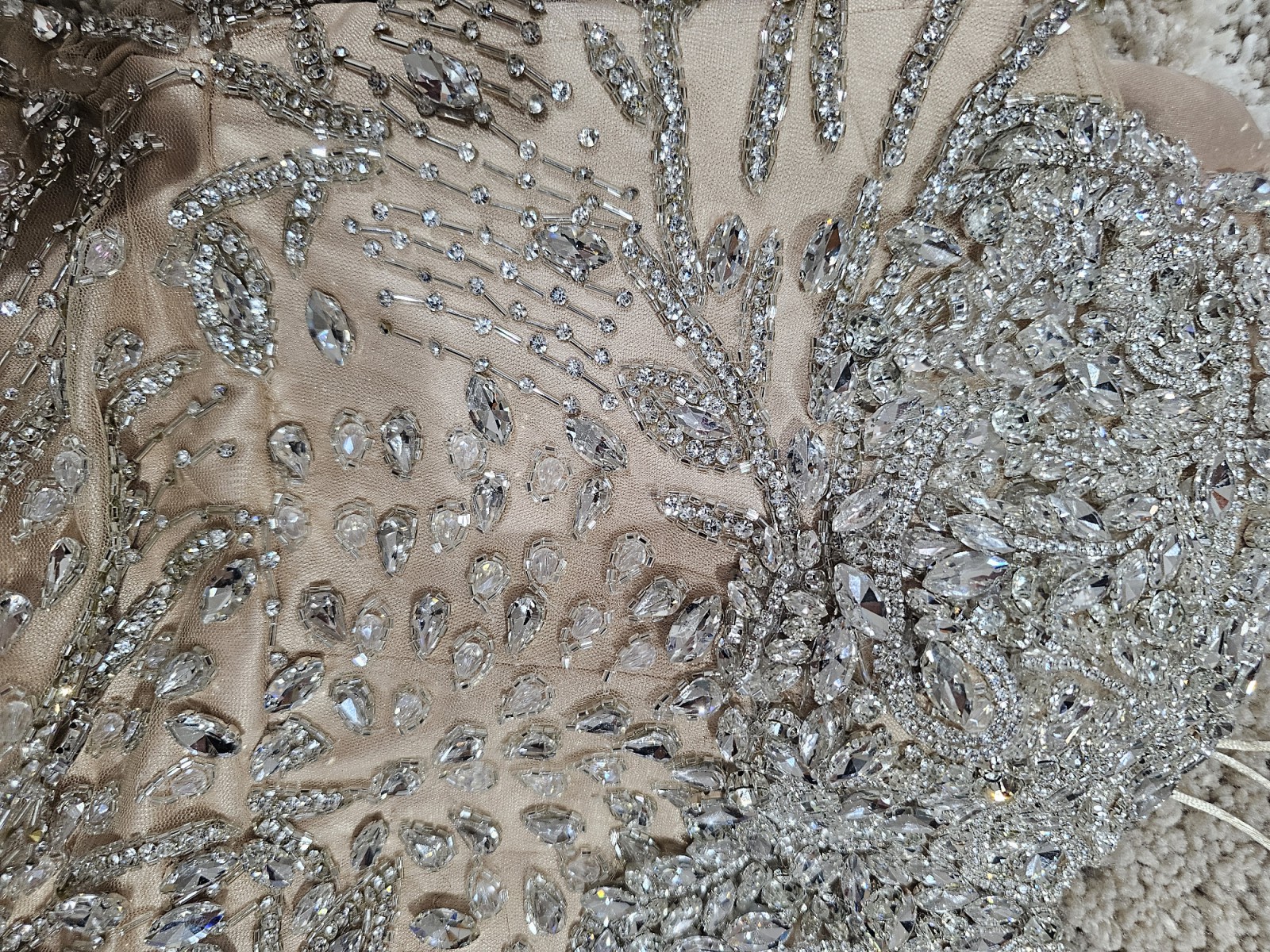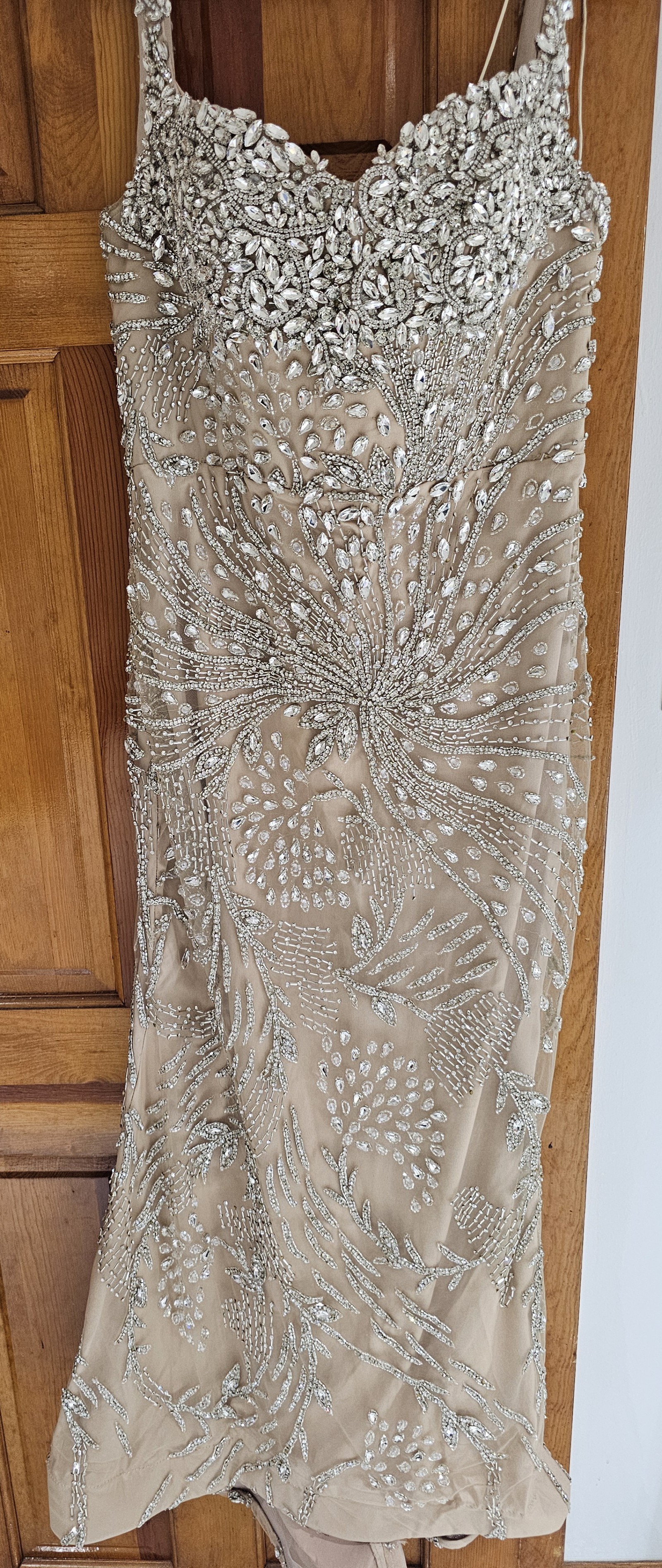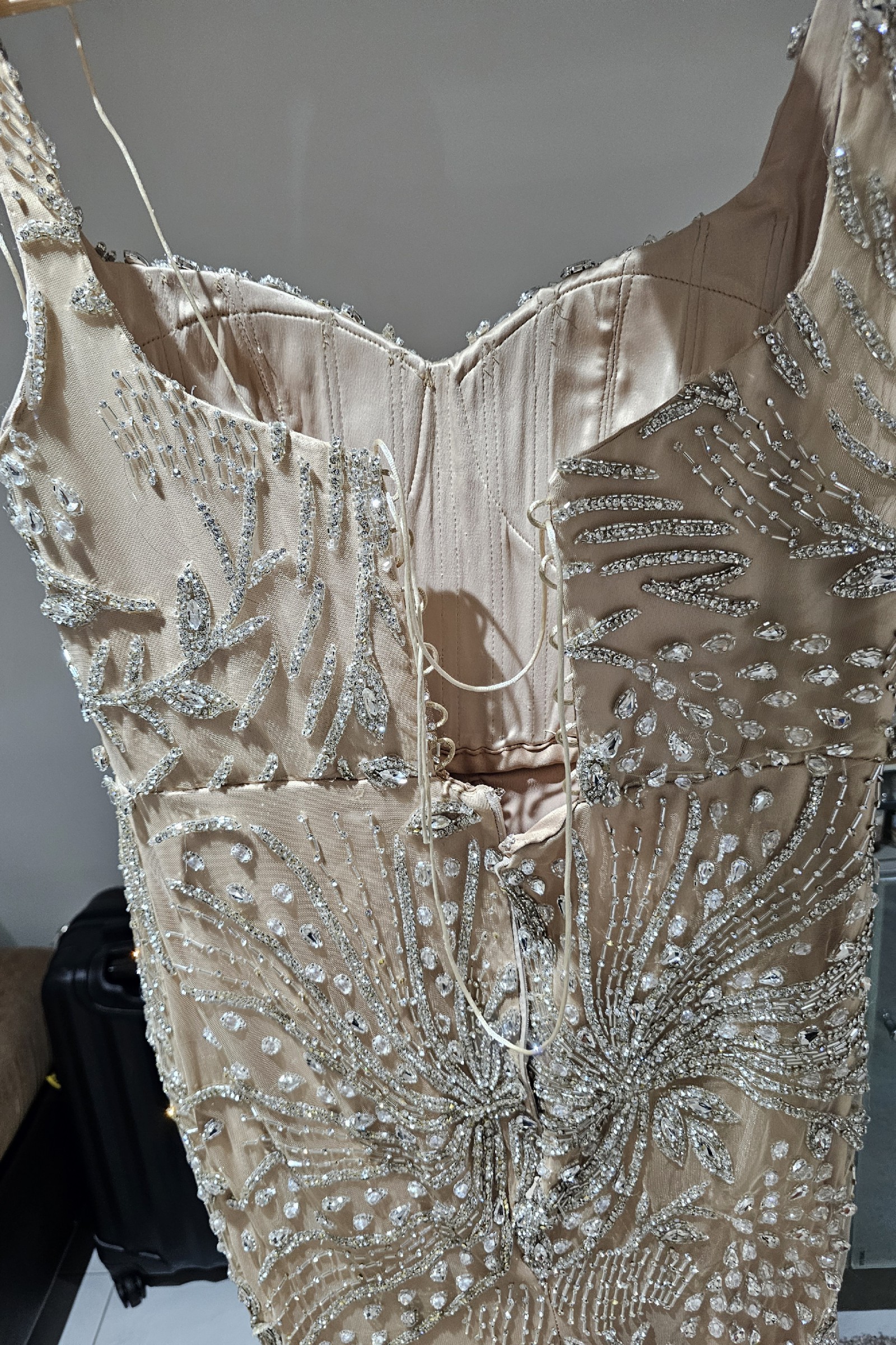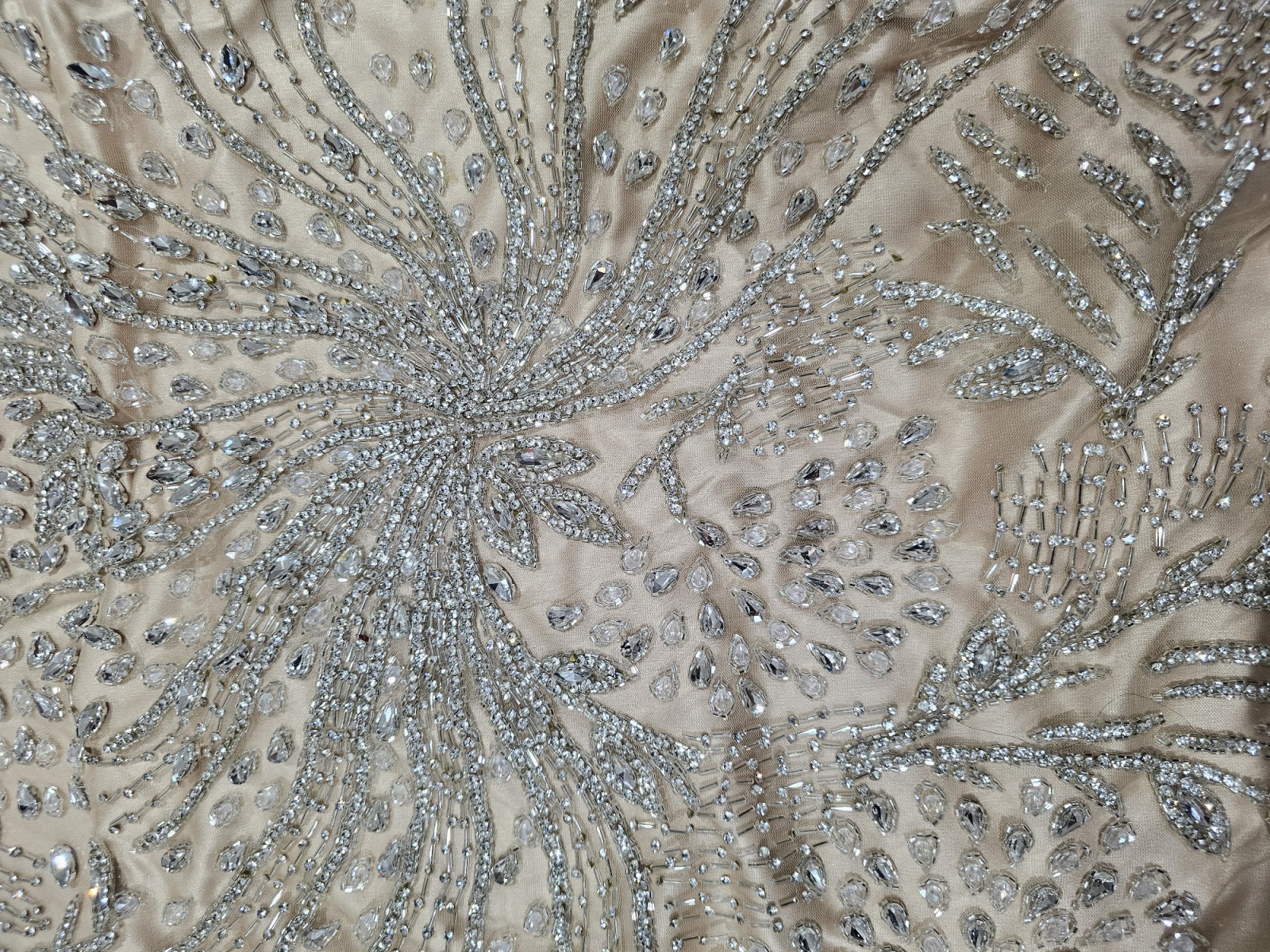 Adorned with exquisite beading, sparkling crystals, and shimmering sequins, this floor-length gown catches the light beautifully, creating a breathtaking effect that you'll love in every photograph. The intricate details truly elevate this dress, transforming it from a mere garment into a work of art.