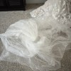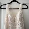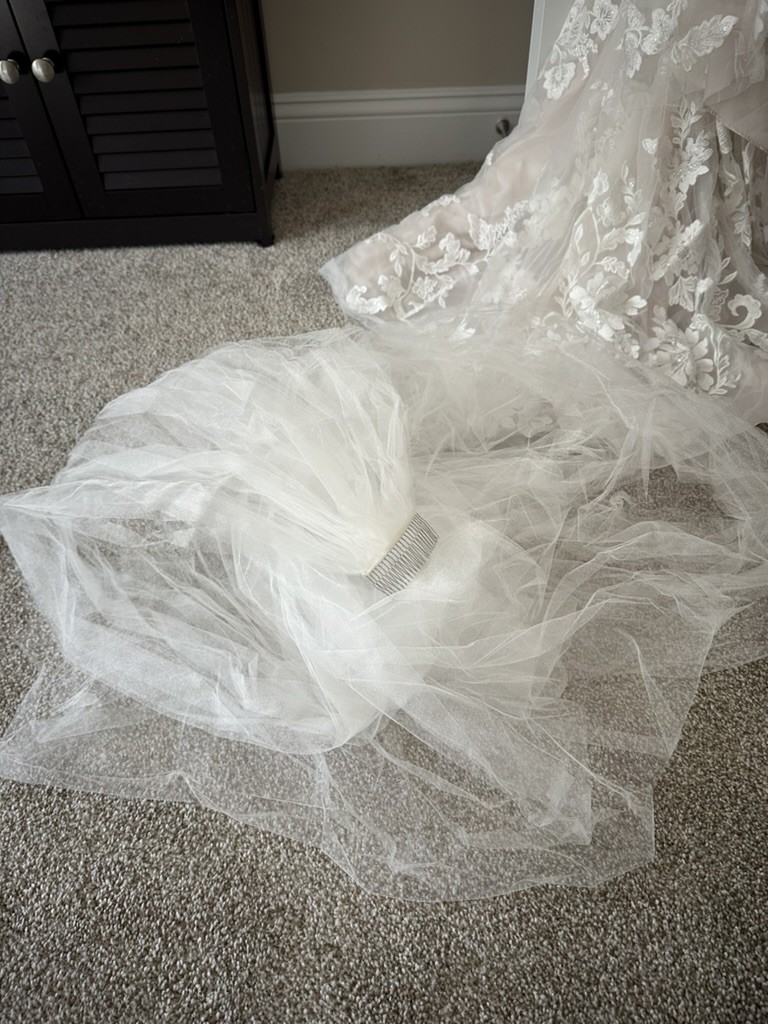 Soft, romantic lace details this tulle A-line wedding gown. Featuring an illusion Sabrina neckline with a plunge, side cutouts, and sexy scoop back. A Chantilly lace underlay in the bodice blends with sequined embroidered appliqués that gracefully cascade throughout the skirt and train. Hidden tulle pockets in the skirt are the finishing touch.