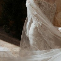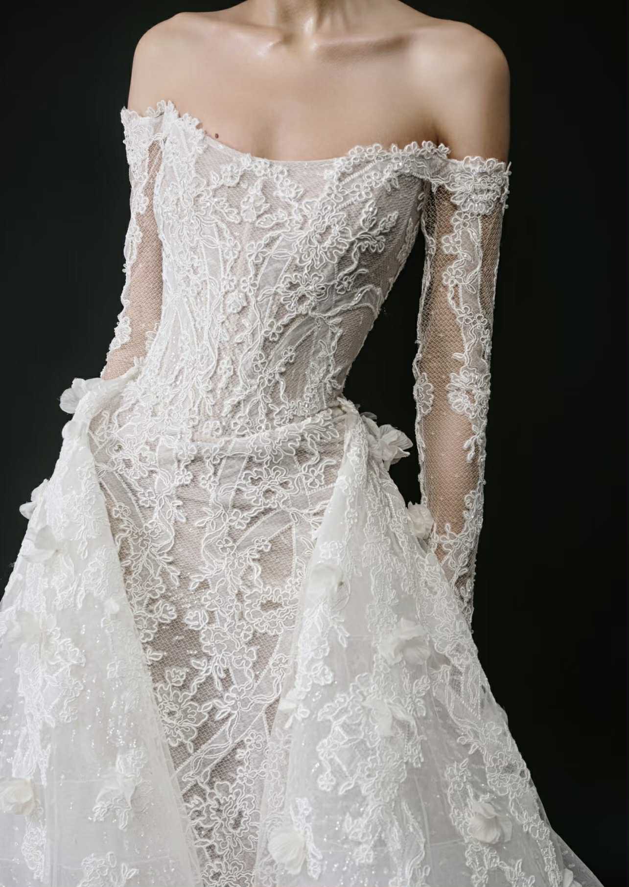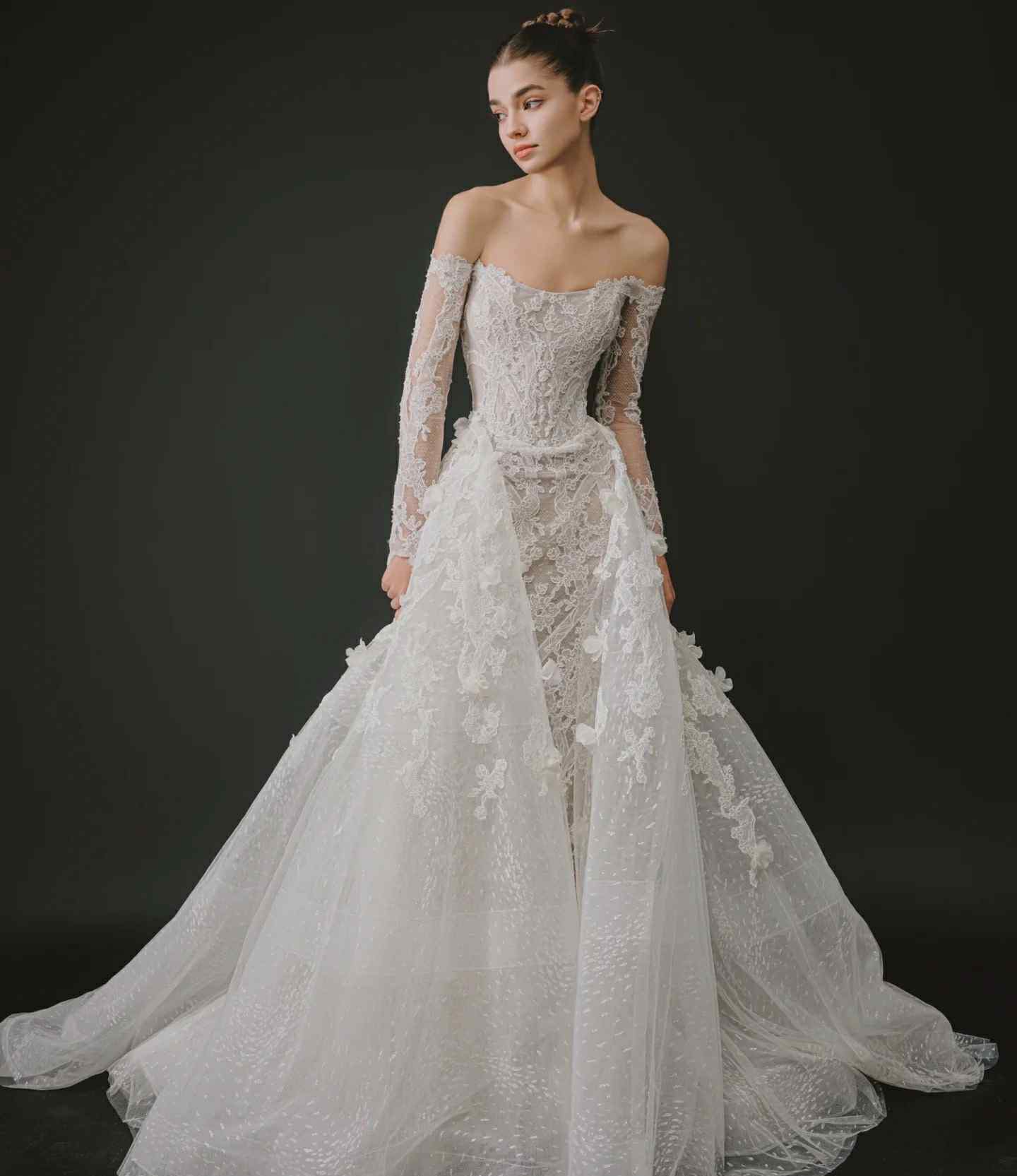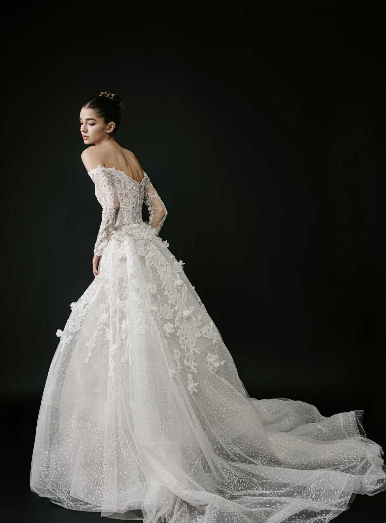 Designed with a *detachable* train, it transforms effortlessly from a grand aisle look to a light, flowing reception style — perfect for brides who want a perfect balance and flexibility between elegance and freedom in movement. The raised waistline and fitted corset beautifully elongate the legs, making it an especially flattering choice for petite brides who want a taller, long-legged silhouette.