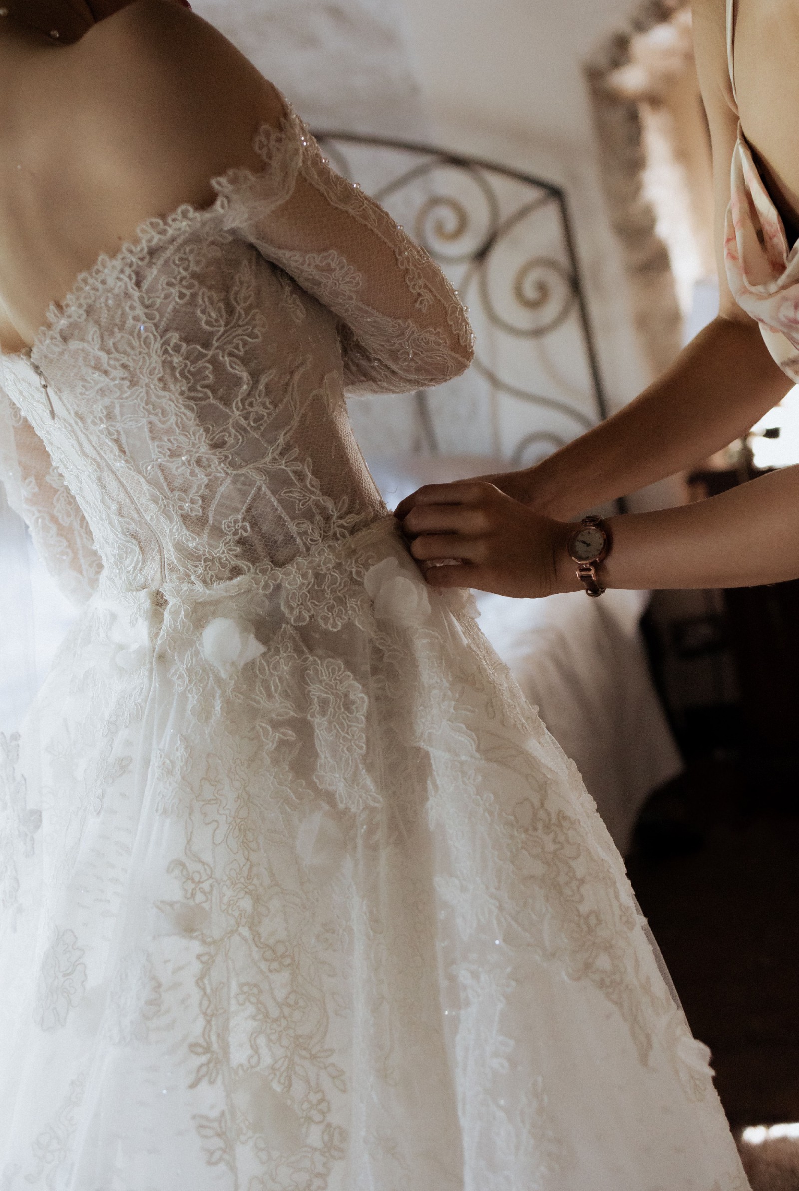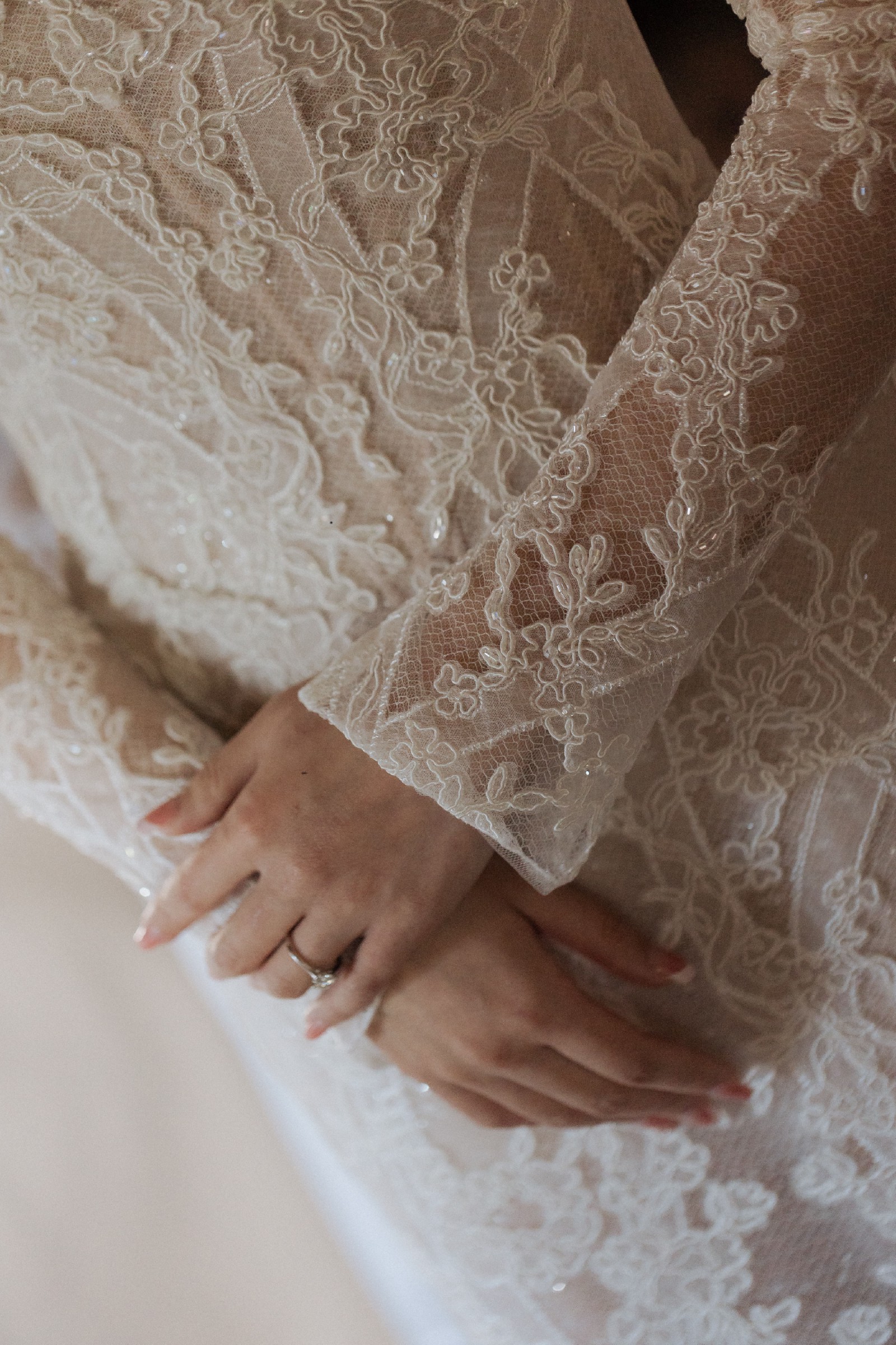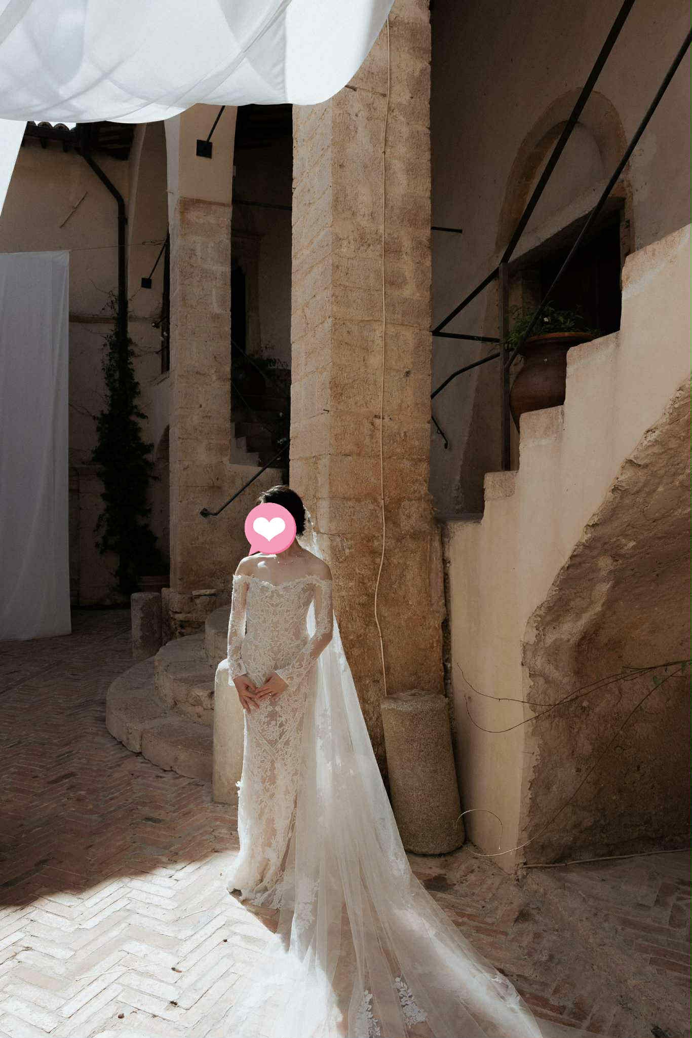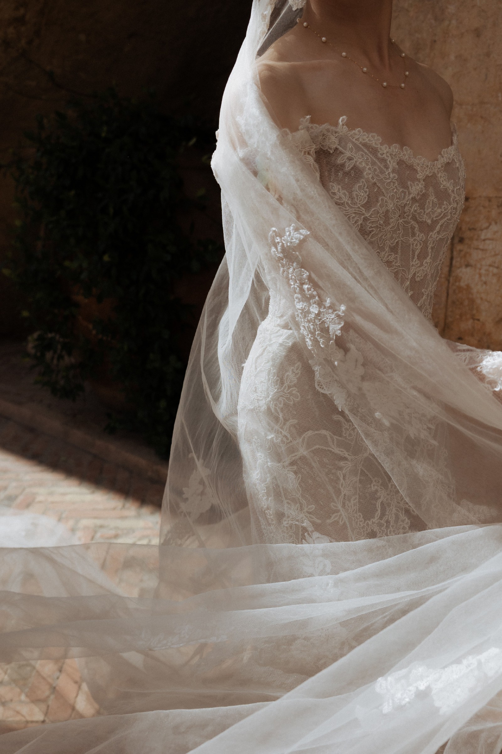 Designed with a *detachable* train, it transforms effortlessly from a grand aisle look to a light, flowing reception style — perfect for brides who want a perfect balance and flexibility between elegance and freedom in movement. The raised waistline and fitted corset beautifully elongate the legs, making it an especially flattering choice for petite brides who want a taller, long-legged silhouette.