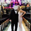 Style Details: David Peck couture, Houston designer, lace bridal jumpsuit, modern reception outfit, front slit detail, custom couture design, contemporary luxury bridal look.